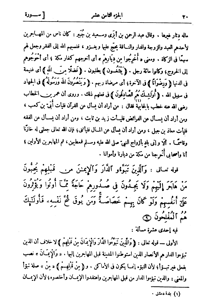 فِيهِ إِحْدَى عَشْرَةَ مَسْأَلَةً: الْأُولَى- قَوْلُهُ تَعَالَى: (وَالَّذِينَ تَبَوَّؤُا الدَّارَ وَالْإِيمانَ مِنْ قَبْلِهِمْ) لَا خِلَافَ أَنَّ الَّذِينَ تَبَوَّءُوا الدَّارَ هُمُ الْأَنْصَارُ الَّذِينَ اسْتَوْطَنُوا الْمَدِينَةَ قَبْلَ الْمُهَاجِرِينَ إِلَيْهَا. وَالْإِيمانَ نُصِبَ بِفِعْلٍ غَيْرِ تَبَوَّأَ، لِأَنَّ التَّبَوُّءَ إِنَّمَا يَكُونُ فِي الْأَمَاكِنِ. ومِنْ قَبْلِهِمْ مِنْ صِلَةِ تَبَوَّأَ وَالْمَعْنَى: وَالَّذِينَ تَبَوَّءُوا الدَّارَ مِنْ قِبَلِ الْمُهَاجِرِينَ وَاعْتَقَدُوا الايمان وأخلصوه، لان الايمان