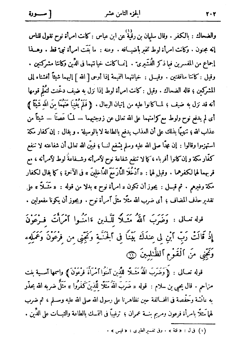 قَوْلُهُ تَعَالَى: (وَضَرَبَ اللَّهُ مَثَلًا لِلَّذِينَ آمَنُوا امْرَأَتَ فِرْعَوْنَ) وَاسْمُهَا آسِيَةُ بِنْتُ مُزَاحِمٍ. قَالَ يَحْيَى بْنُ سَلَّامٍ: قَوْلُهُ ضَرَبَ اللَّهُ مَثَلًا لِلَّذِينَ كَفَرُوا مَثَلٌ ضَرَبَهُ اللَّهُ يُحَذِّرَ بِهِ عَائِشَةَ وَحَفْصَةَ فِي الْمُخَالَفَةِ حِينَ تَظَاهَرَتَا عَلَى رَسُولِ اللَّهِ صَلَّى اللَّهُ عَلَيْهِ وَسَلَّمَ، ثُمَّ ضَرَبَ لهما مثلا بامرأة فرعون ومريم بنة عِمْرَانَ، تَرْغِيبًا فِي التَّمَسُّكِ بِالطَّاعَةِ وَالثَّبَاتِ عَلَى الدين.