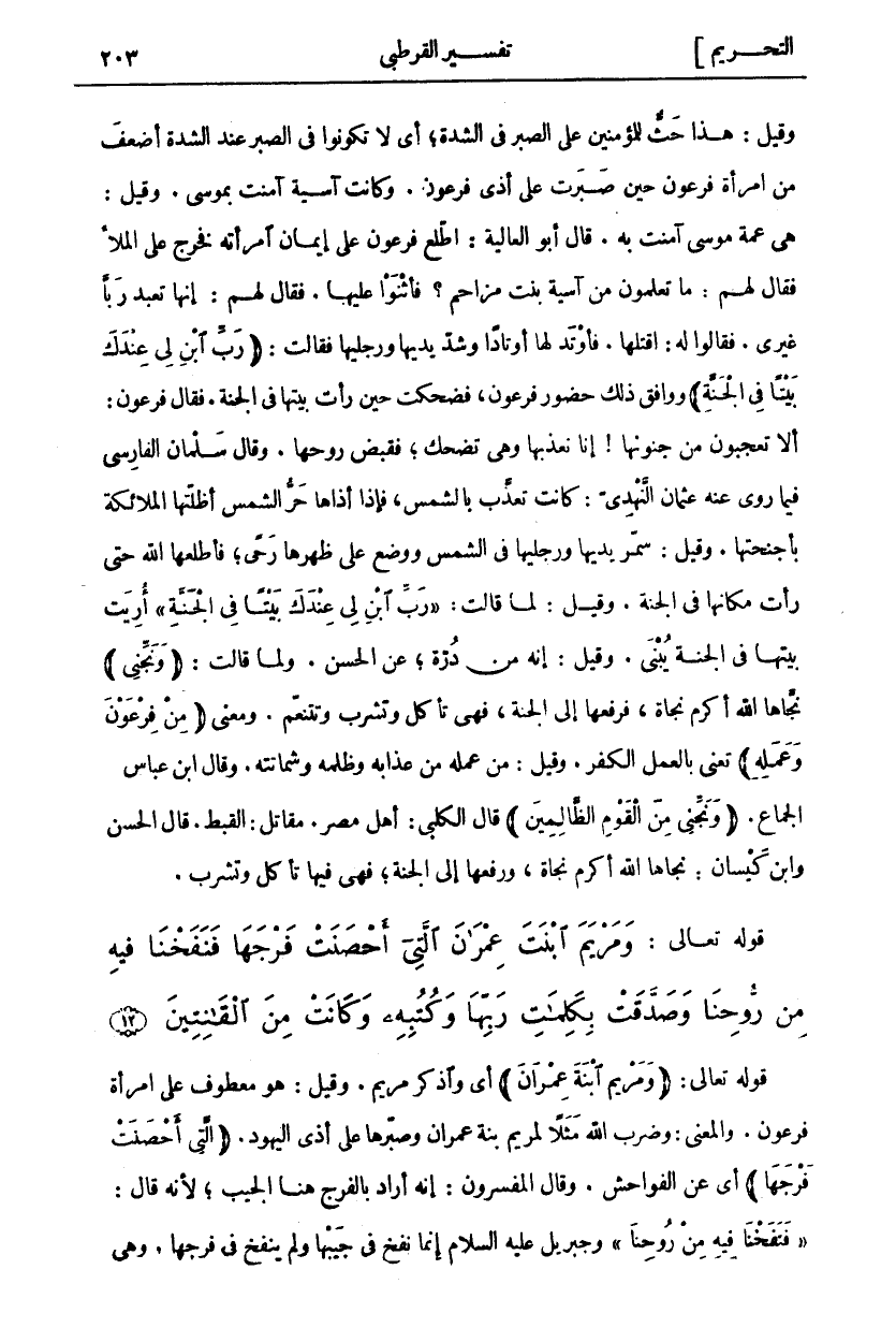قوله تعالى: (وَمَرْيَمَ ابْنَتَ عِمْرانَ) أَيْ وَاذْكُرْ مَرْيَمَ. وَقِيلَ: هُوَ مَعْطُوفٌ عَلَى امْرَأَةِ فِرْعَوْنَ. وَالْمَعْنَى: وَضَرَبَ اللَّهُ مَثَلًا لمريم بنة عِمْرَانَ وَصَبْرِهَا عَلَى أَذَى الْيَهُودِ. (الَّتِي أَحْصَنَتْ فَرْجَها) أَيْ عَنِ الْفَوَاحِشِ. وَقَالَ الْمُفَسِّرُونَ: إِنَّهُ أَرَادَ بِالْفَرْجِ هُنَا الْجَيْبَ لِأَنَّهُ قَالَ: فَنَفَخْنا فِيهِ مِنْ رُوحِنا وَجِبْرِيلُ عَلَيْهِ السَّلَامُ إِنَّمَا نَفَخَ فِي جَيْبِهَا وَلَمْ يَنْفُخْ فِي فَرْجِهَا. وهي