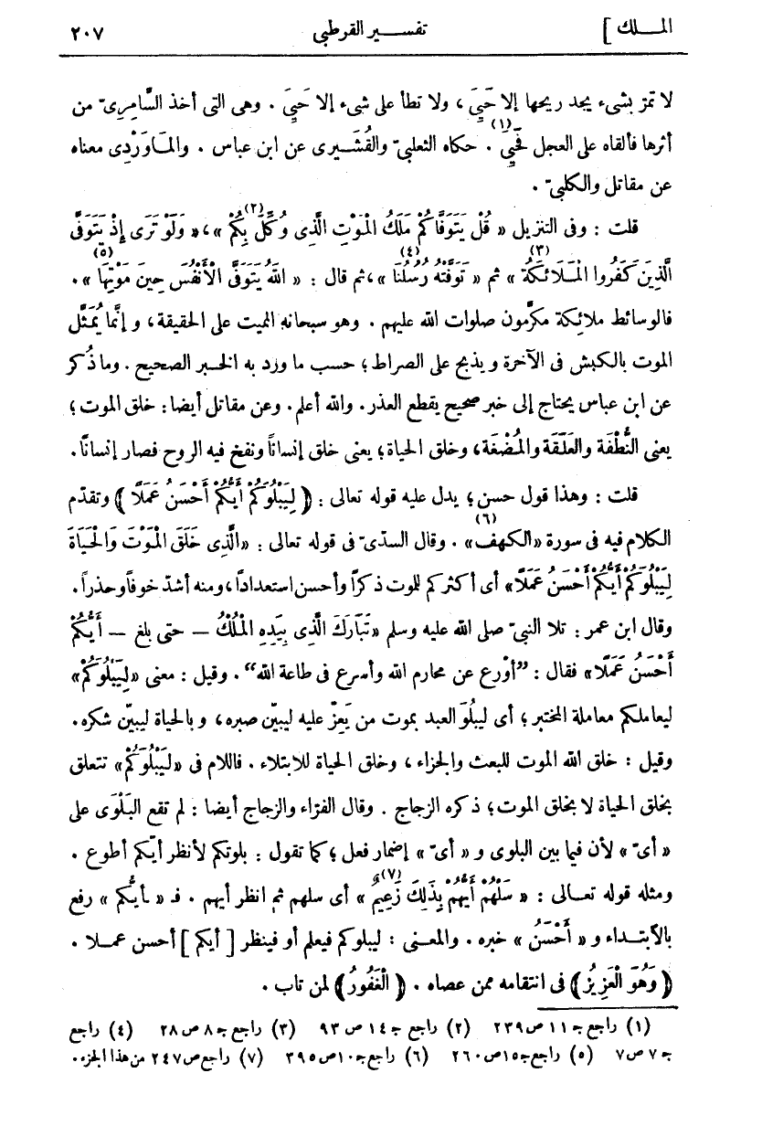 لَا تَمُرُّ بِشَيْءٍ يَجِدُ رِيحَهَا إِلَّا حَيِيَ، ولا تطأ على شي إِلَّا حَيِيَ. وَهِيَ الَّتِي أَخَذَ السَّامِرِيُّ مِنْ أَثَرِهَا فَأَلْقَاهُ عَلَى الْعِجْلِ فَحَيِيَ «١». حَكَاهُ الثَّعْلَبِيُّ وَالْقُشَيْرِيُّ عَنِ ابْنِ عَبَّاسٍ. وَالْمَاوَرْدِيُّ مَعْنَاهُ عَنْ مُقَاتِلٍ وَالْكَلْبِيِّ. قُلْتُ: وَفِي التَّنْزِيلِ قُلْ يَتَوَفَّاكُمْ مَلَكُ الْمَوْتِ الَّذِي وُكِّلَ «٢» بِكُمْ، [السجدة: ١١]، وَلَوْ تَرى إِذْ يَتَوَفَّى الَّذِينَ كَفَرُوا الْمَلائِكَةُ «٣» [الأنفال: ٥٠] ثم تَوَفَّتْهُ رُسُلُنا «٤» [الانعام: ٦١]، ثُمَّ قَالَ: اللَّهُ يَتَوَفَّى الْأَنْفُسَ حِينَ مَوْتِها «٥» [الزمر: ٤٢]. فَالْوَسَائِطُ مَلَائِكَةٌ مُكْرَمُونَ صَلَوَاتُ اللَّهِ عَلَيْهِمْ. وَهُوَ سُبْحَانَهُ الْمُمِيتُ عَلَى الْحَقِيقَةِ، وَإِنَّمَا يُمَثَّلُ الْمَوْتُ بِالْكَبْشِ فِي الْآخِرَةِ وَيُذْبَحُ عَلَى الصِّرَاطِ، حَسْبَ مَا وَرَدَ بِهِ الْخَبَرُ الصَّحِيحُ. وَمَا ذُكِرَ عَنِ ابْنِ عَبَّاسٍ يَحْتَاجُ إِلَى خَبَرٍ صَحِيحٍ يَقْطَعُ الْعُذْرَ. وَاللَّهُ أَعْلَمُ. وَعَنْ مُقَاتِلٍ أَيْضًا: خَلَقَ الْمَوْتَ، يَعْنِي النُّطْفَةَ وَالْعَلَقَةَ وَالْمُضْغَةَ، وَخَلَقَ الْحَيَاةَ، يَعْنِي خَلَقَ إِنْسَانًا وَنَفَخَ فِيهِ الرُّوحَ فَصَارَ إِنْسَانًا. قُلْتُ: وَهَذَا قَوْلٌ حَسَنٌ، يَدُلُّ عَلَيْهِ قَوْلُهُ تَعَالَى لِيَبْلُوَكُمْ أَيُّكُمْ أَحْسَنُ عَمَلًا وَتَقَدَّمَ الْكَلَامُ فِيهِ فِي سُورَةِ" الْكَهْفِ" «٦». وَقَالَ السُّدِّيُّ فِي قَوْلِهِ تَعَالَى: الَّذِي خَلَقَ الْمَوْتَ وَالْحَياةَ لِيَبْلُوَكُمْ أَيُّكُمْ أَحْسَنُ عَمَلًا أي أكثر كم لِلْمَوْتِ ذِكْرًا وَأَحْسَنُ اسْتِعْدَادًا، وَمِنْهُ أَشَدُّ خَوْفًا وَحَذَرًا. وَقَالَ ابْنُ عُمَرَ: تَلَا النَّبِيُّ صَلَّى اللَّهُ عَلَيْهِ وَسَلَّمَ تَبارَكَ الَّذِي بِيَدِهِ الْمُلْكُ- حَتَّى بَلَغَ- أَيُّكُمْ أَحْسَنُ عَمَلًا فَقَالَ: (أَوْرَعُ عَنْ مَحَارِمِ اللَّهِ وَأَسْرَعُ فِي طَاعَةِ اللَّهِ). وقيل: معنى لِيَبْلُوَكُمْ ليعاملكم معا ملة الْمُخْتَبِرِ، أَيْ لِيَبْلُوَ الْعَبْدَ بِمَوْتِ مَنْ يَعِزُّ عَلَيْهِ لِيُبَيِّنَ صَبْرَهُ، وَبِالْحَيَاةِ لِيُبَيِّنَ شُكْرَهُ. وَقِيلَ: خَلَقَ اللَّهُ الْمَوْتَ لِلْبَعْثِ وَالْجَزَاءِ، وَخَلَقَ الْحَيَاةَ لِلِابْتِلَاءِ. فَاللَّامُ فِي لِيَبْلُوَكُمْ تَتَعَلَّقُ بِخَلْقِ الْحَيَاةِ لَا بِخَلْقِ الْمَوْتِ، ذَكَرَهُ الزَّجَّاجُ. وَقَالَ الْفَرَّاءُ وَالزَّجَّاجُ أَيْضًا: لَمْ تَقَعِ الْبَلْوَى عَلَى" أَيَّ" لِأَنَّ فِيمَا بَيْنَ الْبَلْوَى وَ" أَيَّ" إِضْمَارِ فِعْلٍ، كَمَا تَقُولُ: بَلَوْتُكُمْ لِأَنْظُرَ أَيُّكُمْ أَطْوَعُ. وَمِثْلُهُ قَوْلُهُ تَعَالَى: سَلْهُمْ أَيُّهُمْ بِذلِكَ زَعِيمٌ «٧» [القلم: ٤٠] أَيْ سَلْهُمْ ثُمَّ انْظُرْ أَيَّهُمْ. فَ أَيُّكُمْ رفع بالابتداء وأَحْسَنُ خَبَرُهُ. وَالْمَعْنَى: لِيَبْلُوَكُمْ فَيَعْلَمَ أَوْ فَيَنْظُرَ أَيُّكُمْ أَحْسَنُ عَمَلًا. (وَهُوَ الْعَزِيزُ) فِي انْتِقَامِهِ مِمَّنْ عصاه. (الْغَفُورُ) لمن تاب.