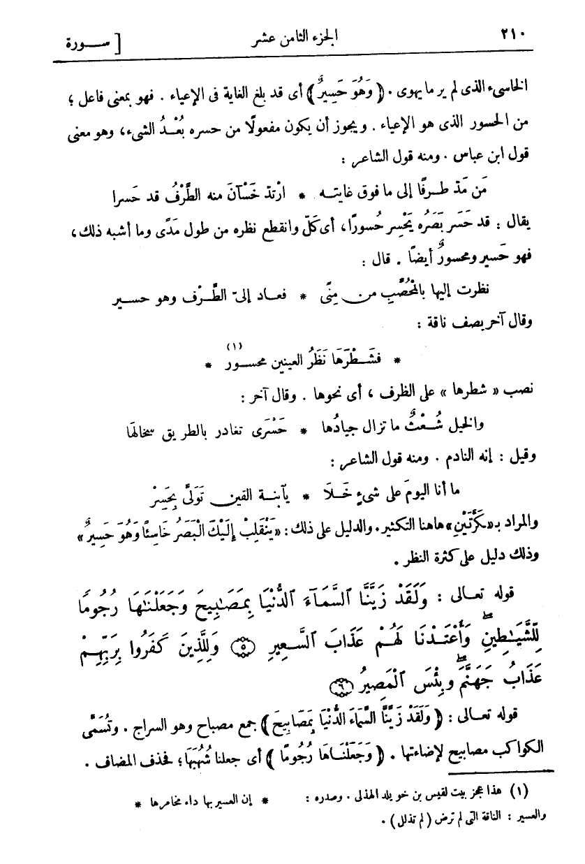 نَظَرْتُ إِلَيْهَا بِالْمُحَصَّبِ مِنْ مِنًى ... فَعَادَ إِلَيَّ الطَّرْفُ وَهُوَ حَسِيرُ