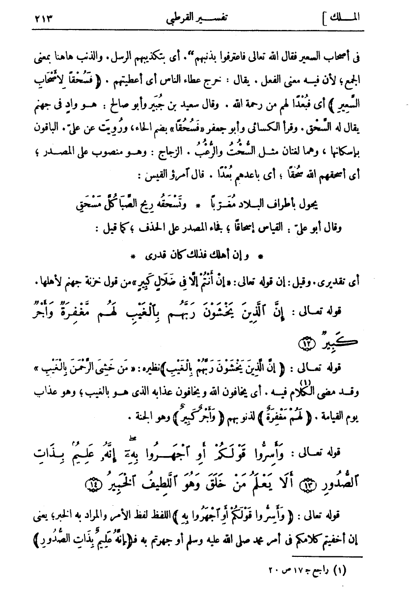 فِي أَصْحَابِ السَّعِيرِ فَقَالَ اللَّهُ تَعَالَى فَاعْتَرَفُوا بِذَنْبِهِمْ أي بتكذيبهم الرسل. والذنب ها هنا بِمَعْنَى الْجَمْعِ، لِأَنَّ فِيهِ مَعْنَى الْفِعْلِ. يُقَالُ: خَرَجَ عَطَاءُ النَّاسِ أَيْ أَعْطِيَتُهُمْ. (فَسُحْقاً لِأَصْحابِ السَّعِيرِ) أَيْ فَبُعْدًا لَهُمْ مِنْ رَحْمَةِ اللَّهِ. وَقَالَ سَعِيدُ بْنُ جُبَيْرٍ وَأَبُو صَالِحٍ: هُوَ وَادٍ فِي جَهَنَّمَ يُقَالُ لَهُ السُّحْقُ. وَقَرَأَ الْكِسَائِيُّ وَأَبُو جَعْفَرٍ فَسُحْقاً بِضَمِ الْحَاءِ، وَرُوِيَتْ عَنْ عَلِيٍّ. الْبَاقُونَ بِإِسْكَانِهَا، وَهُمَا لُغَتَانِ مِثْلَ السُّحُتِ وَالرُّعُبِ. الزَّجَّاجُ: وَهُوَ مَنْصُوبٌ عَلَى الْمَصْدَرِ، أَيْ أَسْحَقَهُمُ اللَّهُ سُحْقًا، أَيْ بَاعَدَهُمْ بُعْدًا. قال امرؤ القيس: