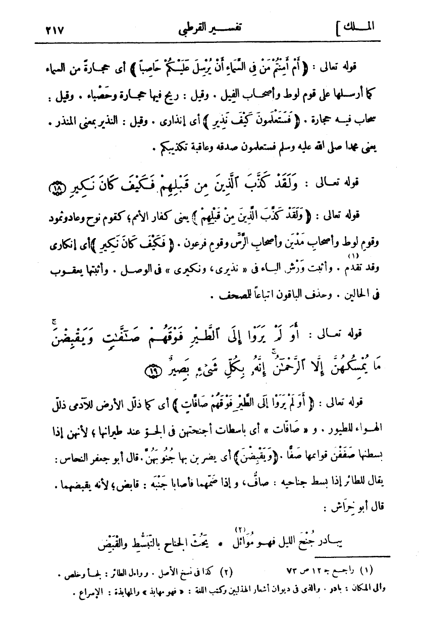 قَوْلُهُ تَعَالَى: أَوَلَمْ يَرَوْا إِلَى الطَّيْرِ فَوْقَهُمْ صافَّاتٍ أَيْ كَمَا ذَلَّلَ الْأَرْضَ لِلْآدَمِيِّ ذلل الهواء للطيور. وصافَّاتٍ أَيْ بَاسِطَاتٍ أَجْنِحَتَهُنَّ فِي الْجَوِّ عِنْدَ طَيَرَانِهَا، لِأَنَّهُنَّ إِذَا بَسَطْنَهَا صَفَفْنَ قَوَائِمَهَا صَفًّا. وَيَقْبِضْنَ أَيْ يَضْرِبْنَ بِهَا جُنُوبَهُنَّ. قَالَ أَبُو جَعْفَرٍ النَّحَّاسُ: يُقَالُ لِلطَّائِرِ إِذَا بَسَطَ جَنَاحَيْهِ: صَافٌّ، وَإِذَا ضَمَّهُمَا فَأَصَابَا جَنْبَهُ: قَابِضٌ، لِأَنَّهُ يَقْبِضُهُمَا. قَالَ أَبُو خِرَاشٍ: