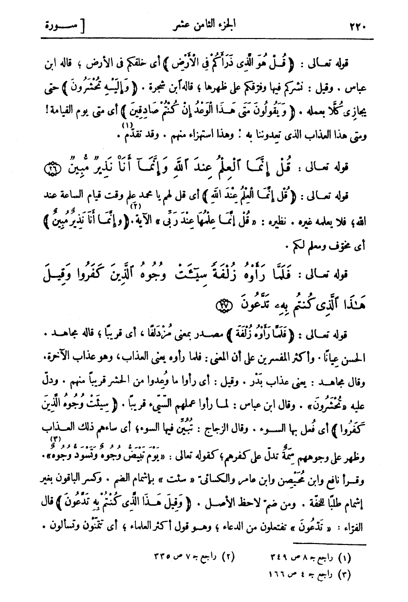 قَوْلُهُ تَعَالَى: (فَلَمَّا رَأَوْهُ زُلْفَةً) مَصْدَرٌ بِمَعْنَى مُزْدَلَفًا أَيْ قَرِيبًا، قَالَهُ مُجَاهِدٌ. الْحَسَنُ عِيَانًا. وَأَكْثَرُ الْمُفَسِّرِينَ عَلَى أَنَّ الْمَعْنَى: فَلَمَّا رَأَوْهُ يَعْنِي الْعَذَابَ، وَهُوَ عَذَابُ الْآخِرَةِ. وَقَالَ مُجَاهِدٌ: يَعْنِي عَذَابَ بَدْرٍ. وَقِيلَ: أَيْ رَأَوْا مَا وُعِدُوا مِنَ الْحَشْرِ قَرِيبًا مِنْهُمْ. وَدَلَّ عَلَيْهِ تُحْشَرُونَ. وَقَالَ ابْنُ عَبَّاسٍ: لَمَّا رَأَوْا عَمَلَهُمُ السَّيِّئَ قَرِيبًا. (سِيئَتْ وُجُوهُ الَّذِينَ كَفَرُوا) أَيْ فُعِلَ بِهَا السُّوءُ. وَقَالَ الزَّجَّاجُ: تَبَيَّنَ فِيهَا السُّوءُ أَيْ سَاءَهُمْ ذَلِكَ الْعَذَابُ وَظَهَرَ عَلَى وُجُوهِهِمْ سِمَةٌ تَدُلُّ عَلَى كُفْرِهِمْ، كَقَوْلِهِ تَعَالَى: يَوْمَ تَبْيَضُّ وُجُوهٌ وَتَسْوَدُّ وُجُوهٌ «٣» [آل عمران: ١٠٦]. وَقَرَأَ نَافِعٌ وَابْنُ مُحَيْصِنٍ وَابْنُ عَامِرٍ وَالْكِسَائِيُّ" سُئَتْ" بِإِشْمَامِ الضَّمِّ. وَكَسَرَ الْبَاقُونَ بِغَيْرِ إِشْمَامٍ طَلَبًا لِلْخِفَّةِ. وَمَنْ ضَمَّ لَاحَظَ الْأَصْلَ. (وَقِيلَ هذَا الَّذِي كُنْتُمْ بِهِ تَدَّعُونَ) قَالَ الْفَرَّاءُ: تَدَّعُونَ تَفْتَعِلُونَ مِنَ الدُّعَاءِ وَهُوَ قَوْلُ أَكْثَرِ العلماء أي تتمنون وتسألون.