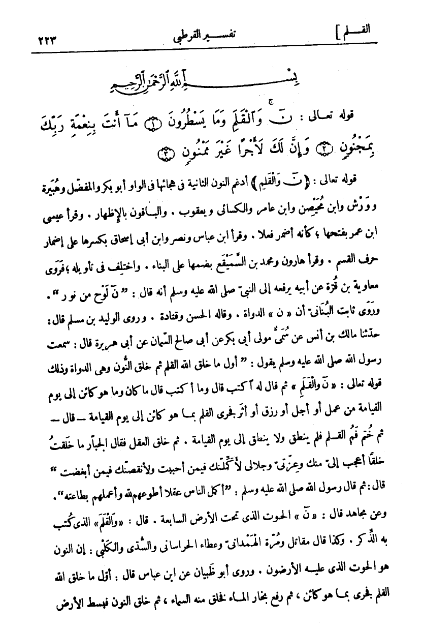 قَوْلُهُ تَعَالَى: ن وَالْقَلَمِ أَدْغَمَ النُّونَ الثَّانِيَةَ فِي هِجَائِهَا فِي الْوَاوِ أَبُو بَكْرٍ وَالْمُفَضَّلُ وَهُبَيْرَةُ وَوَرْشٌ وَابْنُ مُحَيْصِنٍ وَابْنُ عَامِرٍ وَالْكِسَائِيُّ ويعقوب. والباقون بالإظهار. وقرا عيسى ابن عُمَرَ بِفَتْحِهَا، كَأَنَّهُ أَضْمَرَ فِعْلًا. وَقَرَأَ ابْنُ عَبَّاسٍ وَنَصْرٌ وَابْنُ أَبِي إِسْحَاقَ بِكَسْرِهَا عَلَى إِضْمَارِ حَرْفِ، الْقَسَمِ. وَقَرَأَ هَارُونُ وَمُحَمَّدُ بْنُ السَّمَيْقَعِ بِضَمِّهَا عَلَى الْبِنَاءِ. وَاخْتُلِفَ فِي تَأْوِيلِهِ، فَرَوَى مُعَاوِيَةُ بْنُ قُرَّةَ عَنْ أَبِيهِ يَرْفَعْهُ إِلَى النَّبِيِّ صَلَّى اللَّهُ عَلَيْهِ وَسَلَّمَ أَنَّهُ قَالَ: ن (لَوْحٌ مِنْ نُورٍ). وَرَوَى ثَابِتٌ الْبُنَانِيُّ أَنَّ ن الدَّوَاةُ. وَقَالَهُ الْحَسَنُ وَقَتَادَةُ. وَرَوَى الْوَلِيدُ بْنُ مُسْلِمٍ قَالَ: حَدَّثَنَا مَالِكُ بْنُ أَنَسٍ عَنْ سُمَيٍّ مَوْلَى أَبِي بَكْرٍ عَنْ أَبِي صَالِحٍ السَّمَّانِ عَنْ أَبِي هُرَيْرَةَ قَالَ: سَمِعْتُ رَسُولَ اللَّهِ صَلَّى اللَّهُ عَلَيْهِ وَسَلَّمَ يَقُولُ: (أَوَّلُ مَا خَلَقَ اللَّهُ الْقَلَمَ ثم خلق النون وهي الدواة وذلك قول تَعَالَى: ن وَالْقَلَمِ ثُمَّ قَالَ لَهُ اكْتُبْ قَالَ: وَمَا أَكْتُبُ قَالَ: مَا كَانَ وَمَا هُوَ كَائِنٌ إِلَى يَوْمِ الْقِيَامَةِ مِنْ عَمَلٍ أَوْ أَجَلٍ أَوْ رِزْقٍ أَوْ أَثَرٍ فَجَرَى الْقَلَمُ بِمَا هُوَ كَائِنٌ إِلَى يَوْمِ الْقِيَامَةِ- قَالَ- ثُمَّ خَتَمَ فَمَ الْقَلَمِ فَلَمْ يَنْطِقْ وَلَا يَنْطِقْ إِلَى يَوْمِ الْقِيَامَةِ. ثُمَّ خَلَقَ الْعَقْلَ فَقَالَ الْجَبَّارُ مَا خَلَقْتُ خَلْقًا أَعْجَبَ إِلَيَّ مِنْكَ وَعِزَّتِي وَجَلَالِي لَأُكْمِلَنَّكَ فِيمَنْ أَحْبَبْتُ وَلَأُنْقِصَنَّكَ فِيمَنْ أَبْغَضْتُ) قَالَ: ثُمَّ قَالَ رَسُولُ اللَّهِ صَلَّى اللَّهُ عَلَيْهِ وَسَلَّمَ: (أَكْمَلُ النَّاسِ عَقْلًا أَطْوَعُهُمْ لِلَّهِ وَأَعْمَلُهُمْ بِطَاعَتِهِ). وَعَنْ مُجَاهِدٍ قَالَ: ن الْحُوتُ الَّذِي تَحْتَ الْأَرْضِ السَّابِعَةِ. قَالَ: وَالْقَلَمِ الَّذِي كُتِبَ بِهِ الذِّكْرُ. وَكَذَا قَالَ مُقَاتِلٌ وَمُرَّةُ الْهَمْدَانِيُّ وَعَطَاءٌ الْخُرَاسَانِيُّ وَالسُّدِّيُّ وَالْكَلْبِيُّ: إِنَّ النُّونَ هُوَ الْحُوتُ الَّذِي عَلَيْهِ الْأَرَضُونَ. وَرَوَى أَبُو ظَبْيَانَ عَنِ ابْنِ عَبَّاسٍ قَالَ: أَوَّلُ مَا خَلَقَ اللَّهُ الْقَلَمَ فَجَرَى بِمَا هُوَ كَائِنٌ، ثُمَّ رَفَعَ بُخَارَ الْمَاءِ فَخَلَقَ مِنْهُ السَّمَاءَ، ثُمَّ خَلَقَ النُّونَ فَبَسَطَ الأرض