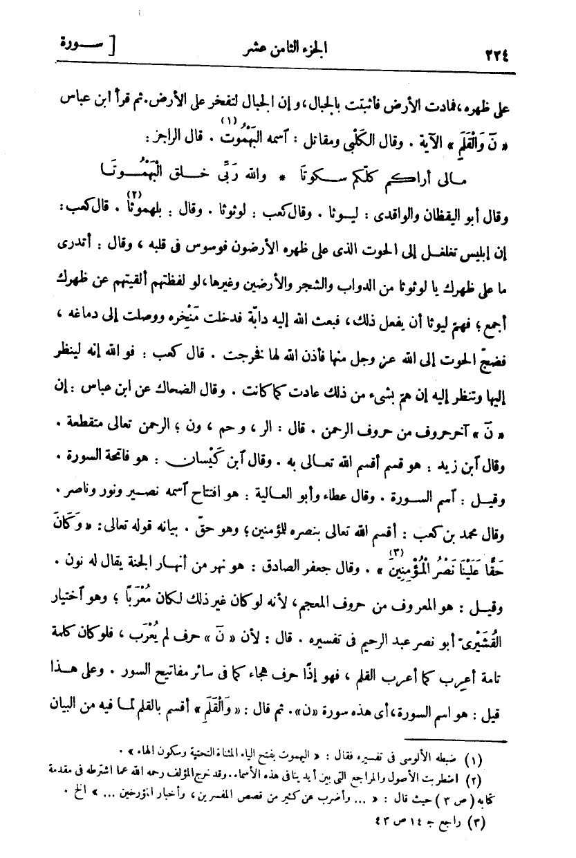 عَلَى ظَهْرِهِ، فَمَادَتِ الْأَرْضُ فَأُثْبِتَتْ بِالْجِبَالِ، وَإِنَّ الْجِبَالَ لَتَفْخَرُ عَلَى الْأَرْضِ. ثُمَّ قَرَأَ ابْنُ عَبَّاسٍ ن وَالْقَلَمِ الْآيَةَ. وَقَالَ الْكَلْبِيُّ وَمُقَاتِلٌ: اسْمُهُ الْبَهْمُوتُ «١». قَالَ الرَّاجِزُ: