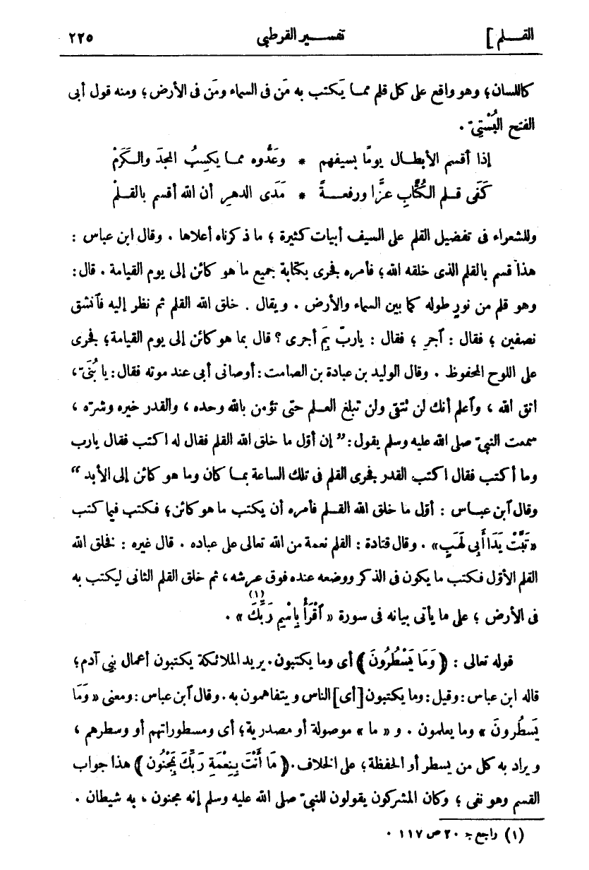 وَلِلشُّعَرَاءِ فِي تَفْضِيلِ الْقَلَمِ عَلَى السَّيْفِ أَبْيَاتٌ كَثِيرَةٌ، مَا ذَكَرْنَاهُ أَعْلَاهَا. وَقَالَ ابْنُ عَبَّاسٍ: هَذَا قَسَمٌ بِالْقَلَمِ الَّذِي خَلَقَهُ اللَّهُ، فَأَمَرَهُ فَجَرَى بِكِتَابَةِ جَمِيعِ مَا هُوَ كَائِنٌ إِلَى يَوْمِ الْقِيَامَةِ. قَالَ: وَهُوَ قَلَمٌ مِنْ نُورٍ طُولُهُ كَمَا بَيْنَ السَّمَاءِ وَالْأَرْضِ. وَيُقَالُ. خَلَقَ اللَّهُ الْقَلَمَ ثُمَّ نَظَرَ إِلَيْهِ فَانْشَقَّ نِصْفَيْنِ، فَقَالَ: اجْرِ، فَقَالَ: يَا رَبِّ بِمَ أَجْرِي؟ قَالَ بِمَا هُوَ كَائِنٌ إِلَى يَوْمِ الْقِيَامَةِ، فَجَرَى عَلَى اللَّوْحِ الْمَحْفُوظِ. وَقَالَ الْوَلِيدُ بْنُ عُبَادَةَ بْنِ الصَّامِتِ: أَوْصَانِي أَبِي عِنْدِ مَوْتِهِ فَقَالَ: يَا بُنَيَّ، اتَّقِ اللَّهَ، وَاعْلَمْ أَنَّكَ لَنْ تَتَّقِيَ وَلَنْ تَبْلُغَ الْعِلْمَ حَتَّى تُؤْمِنَ بِاللَّهِ وَحْدَهُ، وَالْقَدَرِ خَيْرِهِ وَشَرِّهِ، سَمِعْتُ النَّبِيَّ صَلَّى اللَّهُ عَلَيْهِ وَسَلَّمَ يَقُولُ: (إِنَّ أَوَّلَ مَا خَلَقَ اللَّهُ الْقَلَمُ فَقَالَ لَهُ اكْتُبْ فَقَالَ يَا رَبِّ وَمَا أَكْتُبُ فَقَالَ اكْتُبِ الْقَدَرَ فَجَرَى الْقَلَمُ فِي تِلْكَ السَّاعَةِ بِمَا كَانَ وَمَا هُوَ كَائِنٌ إِلَى الْأَبَدِ) وَقَالَ ابْنُ عَبَّاسٍ: أَوَّلُ مَا خَلَقَ اللَّهُ الْقَلَمَ فَأَمَرَهُ أَنْ يَكْتُبَ مَا هُوَ كَائِنٌ، فَكَتَبَ فِيمَا كتب تَبَّتْ يَدا أَبِي لَهَبٍ [المسد: ١]. وَقَالَ قَتَادَةُ: الْقَلَمُ نِعْمَةٌ مِنَ اللَّهِ تَعَالَى عَلَى عِبَادِهِ. قَالَ غَيْرُهُ: فَخَلَقَ اللَّهُ الْقَلَمَ الْأَوَّلَ فَكَتَبَ مَا يَكُونُ فِي الذِّكْرِ وَوَضَعَهُ عِنْدَهُ فَوْقَ عَرْشِهِ، ثُمَّ خَلَقَ الْقَلَمَ الثَّانِيَ لِيَكْتُبَ بِهِ فِي الْأَرْضِ، عَلَى مَا يَأْتِي بيانه في سورة (اقرأ باسم ربك) «١» [العلق: ١]. قَوْلُهُ تَعَالَى: (وَما يَسْطُرُونَ) أَيْ وَمَا يَكْتُبُونَ. يُرِيدُ الْمَلَائِكَةَ يَكْتُبُونَ أَعْمَالَ بَنِي آدَمَ، قَالَهُ ابْنُ عَبَّاسٍ: وَقِيلَ: وَمَا يَكْتُبُونَ أَيِ النَّاسُ وَيَتَفَاهَمُونَ بِهِ. وَقَالَ ابْنُ عَبَّاسٍ: وَمَعْنَى وَما يَسْطُرُونَ وما يعلمون. وما مَوْصُولَةٌ أَوْ مَصْدَرِيَّةٌ، أَيْ وَمَسْطُورَاتِهِمْ أَوْ وَسَطْرِهِمْ، وَيُرَادُ بِهِ كُلَّ مَنْ يُسَطِّرُ أَوِ الْحَفَظَةَ، عَلَى الْخِلَافِ. (مَا أَنْتَ بِنِعْمَةِ رَبِّكَ بِمَجْنُونٍ) هَذَا جَوَابُ الْقَسَمِ وَهُوَ نَفْيٌ، وَكَانَ الْمُشْرِكُونَ يَقُولُونَ لِلنَّبِيِّ صَلَّى اللَّهُ عَلَيْهِ وَسَلَّمَ إِنَّهُ مجنون، به شيطان.