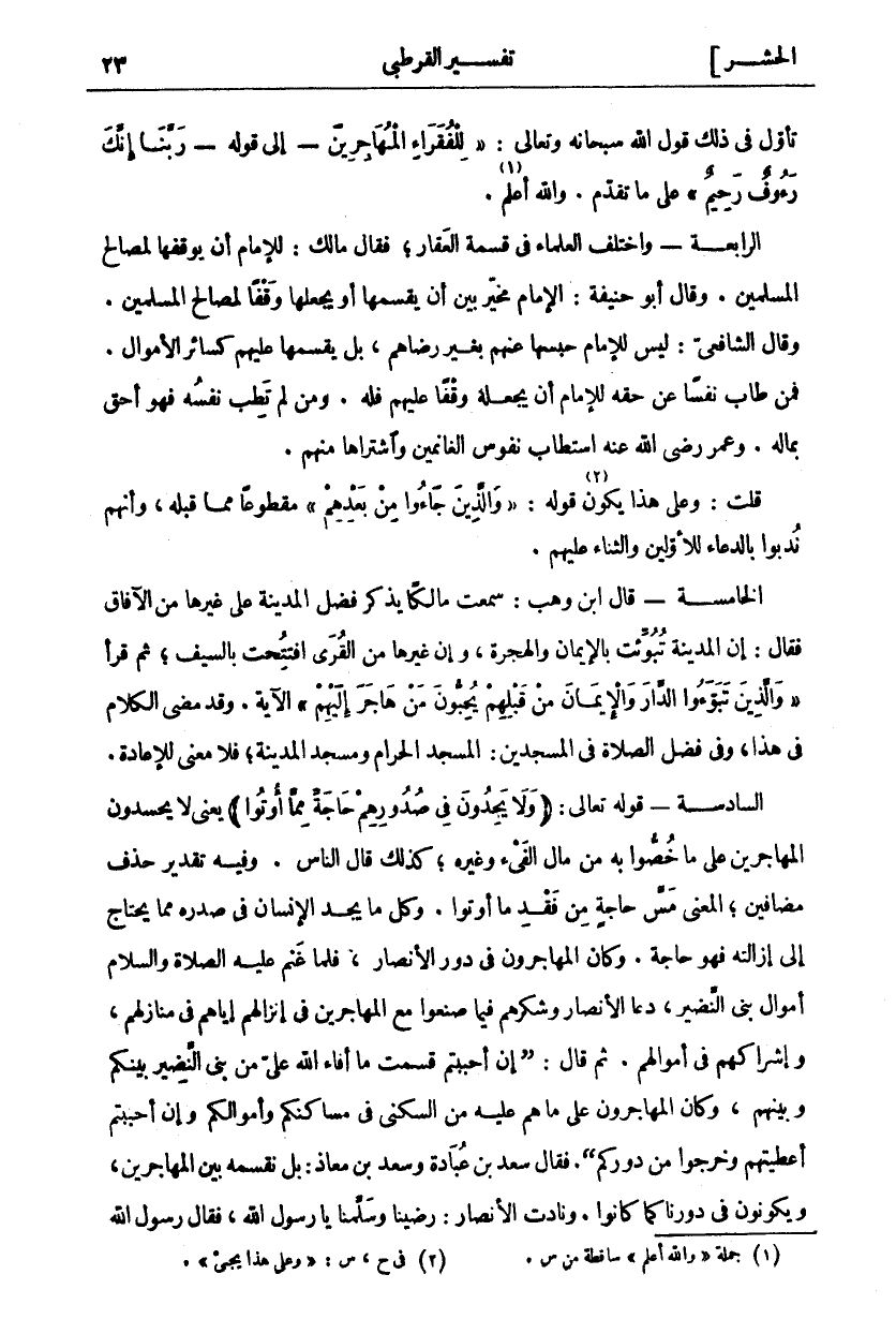 تَأَوَّلَ فِي ذَلِكَ قَوْلَ اللَّهِ سُبْحَانَهُ وَتَعَالَى: لِلْفُقَراءِ الْمُهاجِرِينَ- إلى قوله- رَبَّنا إِنَّكَ رَؤُفٌ رَحِيمٌ عَلَى مَا تَقَدَّمَ. وَاللَّهُ أَعْلَمُ «١». الرَّابِعَةُ- وَاخْتَلَفَ الْعُلَمَاءُ فِي قِسْمَةِ الْعَقَارِ، فَقَالَ مَالِكٌ: لِلْإِمَامِ أَنْ يُوقِفَهَا لِمَصَالِحِ الْمُسْلِمِينَ. وَقَالَ أَبُو حَنِيفَةَ: الْإِمَامُ مُخَيَّرٌ بَيْنَ أَنْ يَقْسِمَهَا أَوْ يَجْعَلَهَا وَقْفًا لِمَصَالِحِ الْمُسْلِمِينَ. وَقَالَ الشَّافِعِيُّ: لَيْسَ لِلْإِمَامِ حَبْسُهَا عَنْهُمْ بِغَيْرِ رِضَاهُمْ، بَلْ يَقْسِمُهَا عَلَيْهِمْ كَسَائِرِ الْأَمْوَالِ. فَمَنْ طَابَ نَفْسًا عَنْ حَقِّهِ لِلْإِمَامِ أَنْ يَجْعَلَهُ وَقْفًا عَلَيْهِمْ فَلَهُ. ومن لم تطب نفسه فهو أحق بمال. وَعُمَرُ رَضِيَ اللَّهُ عَنْهُ اسْتَطَابَ نُفُوسَ الْغَانِمِينَ وَاشْتَرَاهَا مِنْهُمْ. قُلْتُ: وَعَلَى هَذَا يَكُونُ «٢» قَوْلُهُ: وَالَّذِينَ جاؤُ مِنْ بَعْدِهِمْ [الحشر: ١٠] مَقْطُوعًا مِمَّا قَبْلَهُ، وَأَنَّهُمْ نُدِبُوا بِالدُّعَاءِ لِلْأَوَّلِينَ وَالثَّنَاءِ عَلَيْهِمْ. الْخَامِسَةُ- قَالَ ابْنُ وَهْبٍ: سَمِعْتُ مَالِكًا يَذْكُرُ فَضْلَ الْمَدِينَةِ عَلَى غَيْرِهَا مِنَ الْآفَاقِ فَقَالَ: إِنَّ الْمَدِينَةَ تُبُوِّئَتْ بِالْإِيمَانِ وَالْهِجْرَةِ، وَإِنَّ غَيْرَهَا مِنَ الْقُرَى افْتُتِحَتْ بِالسَّيْفِ، ثُمَّ قرأ وَالَّذِينَ تَبَوَّؤُا الدَّارَ وَالْإِيمانَ مِنْ قَبْلِهِمْ يُحِبُّونَ مَنْ هاجَرَ إِلَيْهِمْ الْآيَةَ. وَقَدْ مَضَى الْكَلَامُ فِي هَذَا، وَفِي فَضْلِ الصَّلَاةِ فِي الْمَسْجِدَيْنِ: الْمَسْجِدِ الْحَرَامِ وَمَسْجِدِ الْمَدِينَةِ، فَلَا مَعْنَى لِلْإِعَادَةِ. السَّادِسَةُ- قَوْلُهُ تَعَالَى: (وَلا يَجِدُونَ فِي صُدُورِهِمْ حاجَةً مِمَّا أُوتُوا) يَعْنِي لَا يَحْسُدُونَ الْمُهَاجِرِينَ عَلَى مَا خُصُّوا بِهِ مِنْ مَالِ الْفَيْءِ وَغَيْرِهِ، كَذَلِكَ قَالَ النَّاسُ. وَفِيهِ تَقْدِيرُ حَذْفِ مُضَافَيْنِ، الْمَعْنَى مَسَّ حَاجَةٍ مِنْ فَقْدِ مَا أُوتُوا. وَكُلُّ مَا يَجِدُ الْإِنْسَانَ فِي صَدْرِهِ مِمَّا يَحْتَاجُ إِلَى إِزَالَتِهِ فَهُوَ حَاجَةٌ. وَكَانَ الْمُهَاجِرُونَ فِي دُورِ الْأَنْصَارِ، فَلَمَّا غَنِمَ عَلَيْهِ الصَّلَاةُ وَالسَّلَامُ أَمْوَالَ بَنِي النَّضِيرِ، دَعَا الْأَنْصَارَ وَشَكَرَهُمْ فِيمَا صَنَعُوا مَعَ الْمُهَاجِرِينَ فِي إِنْزَالِهِمْ إِيَّاهُمْ فِي مَنَازِلِهِمْ، وَإِشْرَاكِهِمْ فِي أَمْوَالِهِمْ. ثُمَّ قَالَ: (إِنْ أَحْبَبْتُمْ قَسَمْتُ مَا أَفَاءَ اللَّهُ عَلَيَّ مِنْ بَنِي النَّضِيرِ بَيْنَكُمْ وَبَيْنَهُمْ، وَكَانَ الْمُهَاجِرُونَ عَلَى مَا هُمْ عَلَيْهِ مِنَ السُّكْنَى فِي مَسَاكِنِكُمْ وَأَمْوَالِكُمْ وَإِنْ أَحْبَبْتُمْ أَعْطَيْتُهُمْ وَخَرَجُوا مِنْ دُورِكُمْ (. فَقَالَ سَعْدُ بْنُ عُبَادَةَ وَسَعْدُ بْنُ مُعَاذٍ: بَلْ نَقْسِمُهُ بَيْنَ الْمُهَاجِرِينَ، وَيَكُونُونَ فِي دُورِنَا كَمَا كَانُوا. وَنَادَتِ الْأَنْصَارُ: رَضِينَا وَسَلَّمْنَا يَا رسول الله، فقال رسول الله