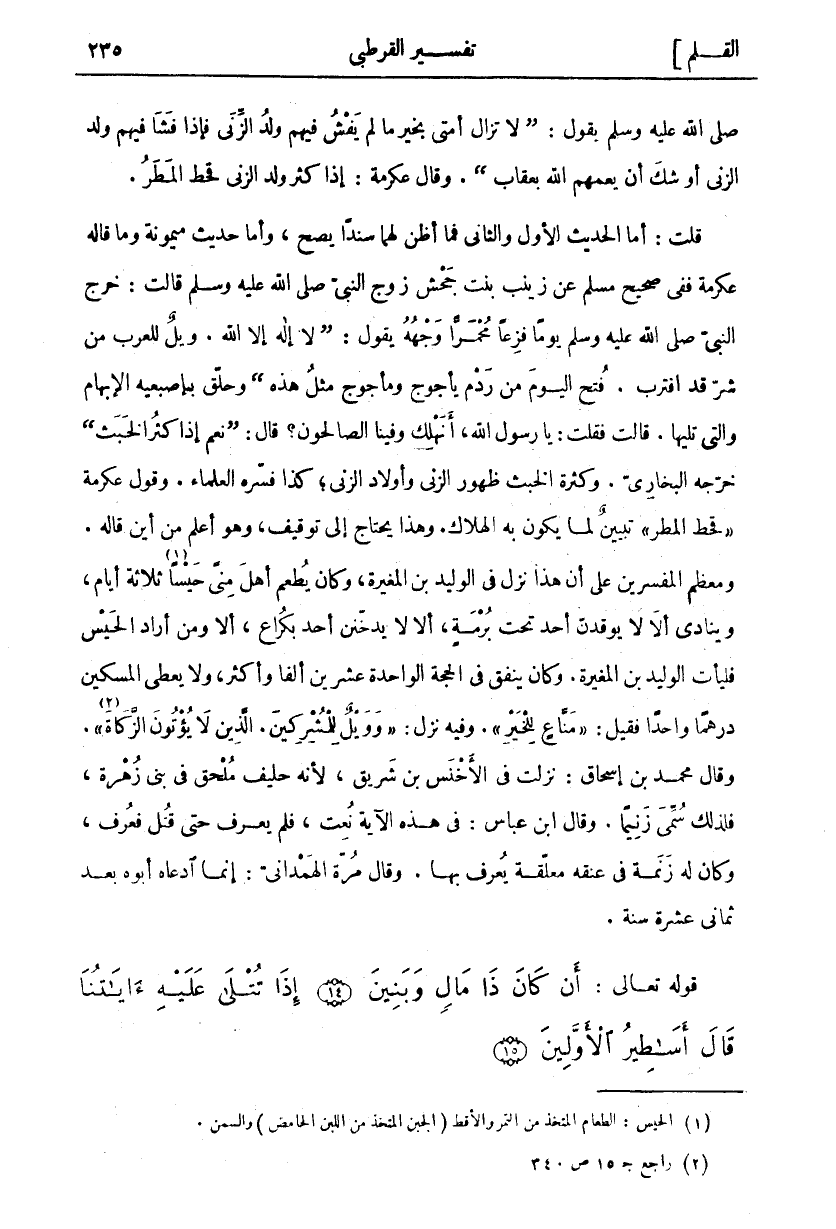 صَلَّى اللَّهُ عَلَيْهِ وَسَلَّمَ يَقُولُ: (لَا تَزَالُ أُمَّتِي بِخَيْرٍ مَا لَمْ يَفْشُ فِيهِمْ وَلَدُ الزنى فإذا فشا فيهم ولد الزنى أو شك أَنْ يَعُمَّهُمُ اللَّهُ بِعِقَابٍ). وَقَالَ عِكْرِمَةُ: إِذَا كثر ولد الزنى قَحَطَ الْمَطَرُ. قُلْتُ: أَمَّا الْحَدِيثُ الْأَوَّلُ وَالثَّانِي فَمَا أَظُنُّ لَهُمَا سَنَدًا يَصِحُّ، وَأَمَّا حَدِيثُ مَيْمُونَةَ وَمَا قَالَهُ عِكْرِمَةُ فَفِي صَحِيحِ مُسْلِمٍ عَنْ زَيْنَبَ بِنْتِ جَحْشٍ زَوْجِ النَّبِيِّ صَلَّى اللَّهُ عَلَيْهِ وَسَلَّمَ قَالَتْ: خَرَجَ النَّبِيُّ صَلَّى اللَّهُ عَلَيْهِ وَسَلَّمَ يَوْمًا فَزِعًا مُحْمَرًّا وَجْهُهُ يَقُولُ: (لَا إِلَهَ إِلَّا اللَّهُ. وَيْلٌ لِلْعَرَبِ مِنْ شَرٍّ قَدِ اقْتَرَبَ. فُتِحَ الْيَوْمَ مِنْ رَدْمِ يَأْجُوجَ وَمَأْجُوجَ مِثْلُ هَذِهِ) وَحَلَّقَ بِإِصْبَعَيْهِ الْإِبْهَامِ وَالَّتِي تَلِيهَا. قَالَتْ فَقُلْتُ: يَا رَسُولَ اللَّهِ، أَنَهْلِكُ وَفِينَا الصَّالِحُونَ؟ قَالَ: (نَعَمْ إِذَا كَثُرَ الْخَبَثُ) خَرَّجَهُ الْبُخَارِيُّ. وَكَثْرَةُ الْخَبَثِ ظُهُورُ الزنى وأولاد الزنى، كَذَا فَسَّرَهُ الْعُلَمَاءُ. وَقَوْلُ عِكْرِمَةَ" قَحَطَ الْمَطَرُ" تَبْيِينٌ لِمَا يَكُونُ بِهِ الْهَلَاكُ. وَهَذَا يَحْتَاجُ إِلَى تَوْقِيفٍ، وَهُوَ أَعْلَمُ مِنْ أَيْنَ قَالَهُ. وَمُعْظَمُ الْمُفَسِّرِينَ عَلَى أَنَّ هَذَا نَزَلَ فِي الْوَلِيدِ بْنِ الْمُغِيرَةِ، وَكَانَ يُطْعِمُ أَهْلَ مِنًى حَيْسًا «١» ثَلَاثَةَ أَيَّامٍ، وَيُنَادِي أَلَا لَا يُوقِدَنَّ أَحَدٌ تَحْتَ بُرْمَةٍ، أَلَا لَا يُدَخِّنَنَّ أَحَدٌ بِكُرَاعٍ، أَلَا وَمَنْ أَرَادَ الْحَيْسَ فَلْيَأْتِ الْوَلِيدَ بْنَ الْمُغِيرَةِ. وَكَانَ يُنْفِقُ فِي الْحَجَّةِ الْوَاحِدَةِ عِشْرِينَ أَلْفًا وَأَكْثَرَ. وَلَا يُعْطِي الْمِسْكِينَ دِرْهَمًا واحدا فقيل: مَنَّاعٍ لِلْخَيْرِ. وفية نزل: وَوَيْلٌ لِلْمُشْرِكِينَ. الَّذِينَ لا يُؤْتُونَ الزَّكاةَ «٢» [فصلت: ٧ - ٦]. وَقَالَ مُحَمَّدُ بْنُ إِسْحَاقَ: نَزَلَتْ فِي الْأَخْنَسِ بْنِ شَرِيقٍ، لِأَنَّهُ حَلِيفٌ مُلْحَقٌ فِي بَنِي زُهْرَةَ، فَلِذَلِكَ سُمِّيَ زَنِيمًا. وَقَالَ ابْنُ عَبَّاسٍ: فِي هَذِهِ الْآيَةِ نُعِتَ، فَلَمْ يُعْرَفْ حَتَّى قُتِلَ فَعُرِفَ، وَكَانَ لَهُ زَنَمَةٌ فِي عُنُقِهِ مُعَلَّقَةٌ يُعْرَفُ بِهَا. وَقَالَ مُرَّةُ الْهَمْدَانِيُّ: إِنَّمَا ادعاه أبوه بعد ثماني عشرة سنة.