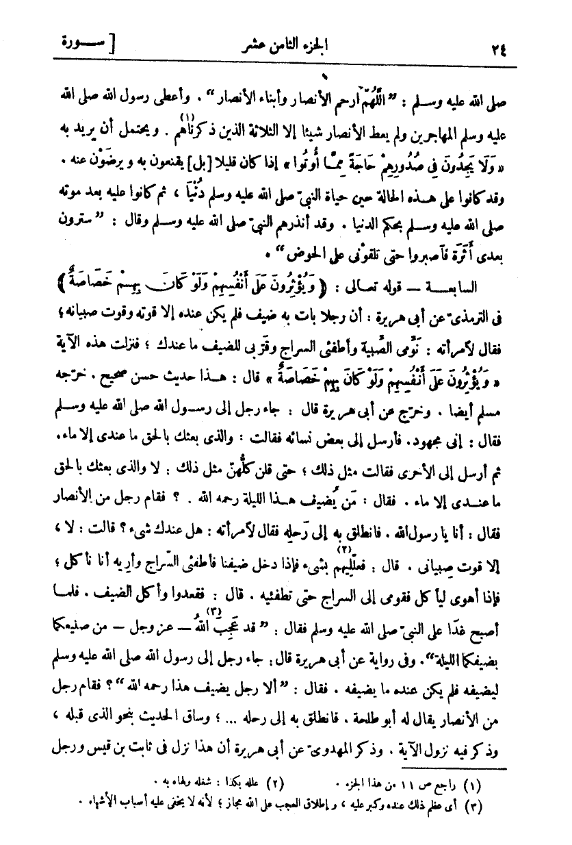 صَلَّى اللَّهُ عَلَيْهِ وَسَلَّمَ: (اللَّهُمَّ ارْحَمِ الْأَنْصَارَ وَأَبْنَاءَ الْأَنْصَارِ). وَأَعْطَى رَسُولُ اللَّهِ صَلَّى اللَّهُ عَلَيْهِ وَسَلَّمَ الْمُهَاجِرِينَ وَلَمْ يُعْطِ الْأَنْصَارَ شَيْئًا إِلَّا الثَّلَاثَةَ الَّذِينَ ذَكَرْنَاهُمْ «١». وَيَحْتَمِلُ أَنْ يُرِيدَ بِهِ وَلا يَجِدُونَ فِي صُدُورِهِمْ حاجَةً مِمَّا أُوتُوا إِذَا كَانَ قَلِيلًا بَلْ يَقْنَعُونَ بِهِ وَيَرْضَوْنَ عَنْهُ. وَقَدْ كَانُوا عَلَى هَذِهِ الْحَالَةِ حِينَ حَيَاةِ النَّبِيِّ صَلَّى اللَّهُ عَلَيْهِ وَسَلَّمَ دُنْيَا، ثُمَّ كَانُوا عَلَيْهِ بَعْدَ مَوْتِهِ صَلَّى اللَّهُ عَلَيْهِ وَسَلَّمَ بِحُكْمِ الدُّنْيَا. وَقَدْ أَنْذَرَهُمُ النَّبِيُّ صَلَّى اللَّهُ عَلَيْهِ وَسَلَّمَ وَقَالَ: (سَتَرَوْنَ بَعْدِي أَثَرَةً فَاصْبِرُوا حَتَّى تَلْقَوْنِي عَلَى الْحَوْضِ). السَّابِعَةُ- قَوْلُهُ تَعَالَى: (وَيُؤْثِرُونَ عَلى أَنْفُسِهِمْ وَلَوْ كانَ بِهِمْ خَصاصَةٌ) فِي التِّرْمِذِيِّ عَنْ أَبِي هُرَيْرَةَ: أَنَّ رَجُلًا بَاتَ بِهِ ضَيْفٌ فَلَمْ يَكُنْ عِنْدَهُ إِلَّا قُوتُهُ وَقُوتُ صِبْيَانِهِ، فَقَالَ لِامْرَأَتِهِ: نَوِّمِي الصِّبْيَةَ وَأَطْفِئِي السِّرَاجَ وَقَرِّبِي لِلضَّيْفِ مَا عِنْدَكِ، فَنَزَلَتْ هَذِهِ الْآيَةُ وَيُؤْثِرُونَ عَلى أَنْفُسِهِمْ وَلَوْ كانَ بِهِمْ خَصاصَةٌ قَالَ: هَذَا حَدِيثٌ حَسَنٌ صَحِيحٌ. خَرَّجَهُ مُسْلِمٌ أَيْضًا. وَخُرِّجَ عَنْ أَبِي هُرَيْرَةَ قَالَ: جَاءَ رَجُلٌ إِلَى رَسُولِ اللَّهِ صَلَّى اللَّهُ عَلَيْهِ وَسَلَّمَ فقال: إِنِّي مَجْهُودٌ. فَأَرْسَلَ إِلَى بَعْضِ نِسَائِهِ فَقَالَتْ: وَالَّذِي بَعَثَكَ بِالْحَقِّ مَا عِنْدِي إِلَّا مَاءٌ. ثُمَّ أَرْسَلَ إِلَى الْأُخْرَى فَقَالَتْ مِثْلَ ذَلِكَ، حَتَّى قُلْنَ كُلُّهُنَّ مِثْلَ ذَلِكَ: لَا وَالَّذِي بَعَثَكَ بِالْحَقِّ مَا عِنْدِي إِلَّا مَاءٌ. فَقَالَ: مَنْ يُضَيِّفُ هَذَا اللَّيْلَةَ رَحِمَهُ اللَّهُ؟ فَقَامَ رَجُلٌ مِنَ الْأَنْصَارِ فَقَالَ: أَنَا يَا رَسُولَ اللَّهِ. فَانْطَلَقَ بِهِ إِلَى رَحْلِهِ فَقَالَ لِامْرَأَتِهِ: هل عندك شي؟ قَالَتْ: لَا، إِلَّا قُوتُ صِبْيَانِي. قَالَ: فَعَلِّلِيهِمْ «٢» بِشَيْءٍ فَإِذَا دَخَلَ ضَيْفُنَا فَأَطْفِئِي السِّرَاجَ وَأَرِيهِ أَنَّا نَأْكُلُ، فَإِذَا أَهْوَى لِيَأْكُلَ فَقُومِي إِلَى السِّرَاجِ حَتَّى تُطْفِئِيهِ. قَالَ: فَقَعَدُوا وَأَكَلَ الضَّيْفُ. فَلَمَّا أَصْبَحَ غَدَا عَلَى النَّبِيِّ صَلَّى اللَّهُ عَلَيْهِ وَسَلَّمَ فَقَالَ: (قَدْ عَجِبَ «٣» اللَّهُ عَزَّ وَجَلَّ- مِنْ صَنِيعِكُمَا بِضَيْفِكُمَا اللَّيْلَةَ). وَفِي رِوَايَةٍ عَنْ أَبِي هُرَيْرَةَ قَالَ: جَاءَ رَجُلٌ إِلَى رَسُولِ اللَّهِ صَلَّى اللَّهُ عَلَيْهِ وَسَلَّمَ لِيُضَيِّفَهُ فَلَمْ يَكُنْ عِنْدَهُ مَا يُضَيِّفُهُ. فَقَالَ: (أَلَا رَجُلٌ يُضَيِّفُ هَذَا رَحِمَهُ اللَّهُ)؟ فَقَامَ رَجُلٌ مِنَ الْأَنْصَارِ يُقَالُ لَهُ أَبُو طَلْحَةَ. فَانْطَلَقَ بِهِ إِلَى رَحْلِهِ ... ، وَسَاقَ الْحَدِيثَ بِنَحْوِ الَّذِي قَبْلَهُ، وَذَكَرَ فِيهِ نُزُولَ الْآيَةِ. وَذَكَرَ الْمَهْدَوِيُّ عَنْ أَبِي هُرَيْرَةَ أَنَّ هَذَا نَزَلَ فِي ثابت بن قيس ورجل