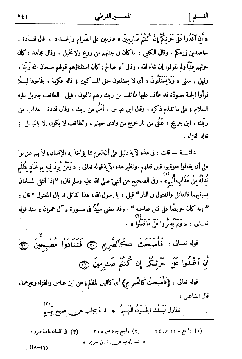 قَوْلُهُ تَعَالَى فَأَصْبَحَتْ كَالصَّرِيمِ أَيْ كَاللَّيْلِ الْمُظْلِمِ عَنِ ابْنِ عَبَّاسٍ وَالْفَرَّاءِ وَغَيْرِهِمَا. قَالَ الشَّاعِرُ: