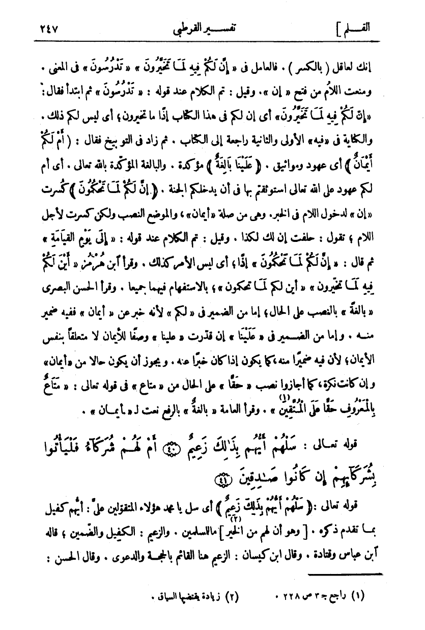إِنَّكَ لَعَاقِلٌ (بِالْكَسْرِ). فَالْعَامِلُ فِي إِنَّ لَكُمْ فِيهِ لَما تَخَيَّرُونَ تَدْرُسُونَ فِي الْمَعْنَى. وَمَنَعَتِ اللَّامُ مِنْ فَتْحِ إِنَّ. وَقِيلَ: تَمَّ الْكَلَامُ عِنْدَ قَوْلِهِ: تَدْرُسُونَ ثُمَّ ابْتَدَأَ فَقَالَ: إِنَّ لَكُمْ فِيهِ لَما تَخَيَّرُونَ أَيْ إِنَّ لَكُمْ فِي هَذَا الْكِتَابِ إِذًا مَا تَخَيَّرُونَ، أَيْ لَيْسَ لَكُمْ ذَلِكَ. وَالْكِنَايَةُ فِي فِيهِ الْأُولَى وَالثَّانِيَةِ رَاجِعَةٌ إِلَى الْكِتَابِ. ثُمَّ زَادَ فِي التَّوْبِيخِ فَقَالَ: (أَمْ لَكُمْ أَيْمانٌ) أَيْ عُهُودٌ وَمَوَاثِيقُ. (عَلَيْنا بالِغَةٌ) مُؤَكَّدَةٌ. وَالْبَالِغَةُ الْمُؤَكَّدَةُ بِاللَّهِ تَعَالَى. أَيْ أَمْ لَكُمْ عُهُودٌ عَلَى اللَّهِ تَعَالَى اسْتَوْثَقْتُمْ بِهَا فِي أَنْ يُدْخِلَكُمُ الْجَنَّةَ. (إِنَّ لَكُمْ لَما تَحْكُمُونَ) كسرت أَيْمانٌ لِدُخُولِ اللَّامِ فِي الْخَبَرِ. وَهِيَ مِنْ صِلَةِ أَيْمانٌ، وَالْمَوْضِعُ النَّصْبُ وَلَكِنْ كُسِرَتْ لِأَجْلِ اللَّامِ، تَقُولُ: حَلَفْتُ إِنَّ لَكَ لَكَذَا. وَقِيلَ: تَمَّ الْكَلَامُ عِنْدَ قَوْلِهِ: إِلى يَوْمِ الْقِيامَةِ ثُمَّ قَالَ: إِنَّ لَكُمْ لَما تَحْكُمُونَ إِذًا، أَيْ لَيْسَ الْأَمْرُ كَذَلِكَ. وَقَرَأَ ابْنُ هُرْمُزَ" أَيْنَ لَكُمْ فِيهِ لَمَا تَخَيَّرُونَ" أَيْنَ لَكُمْ لَمَا تَحْكُمُونَ"، بِالِاسْتِفْهَامِ فِيهِمَا جَمِيعًا. وَقَرَأَ الْحَسَنُ الْبَصْرِيُّ (بَالِغَةً) بِالنَّصْبِ عَلَى الْحَالِ، إِمَّا مِنَ الضَّمِيرِ فِي لَكُمْ لِأَنَّهُ خَبَرٌ عَنْ أَيْمانٌ فَفِيهِ ضَمِيرٌ مِنْهُ. وَإِمَّا مِنَ الضَّمِيرِ فِي عَلَيْنا إِنْ قَدَّرْتَ عَلَيْنا وَصْفًا لِلْأَيْمَانِ لَا مُتَعَلِّقًا بِنَفْسِ الْأَيْمَانِ، لِأَنَّ فِيهِ ضَمِيرًا مِنْهُ، كَمَا يَكُونُ إِذَا كَانَ خَبَرًا عَنْهُ. وَيَجُوزُ أَنْ يَكُونَ حَالًا مِنْ أَيْمانٌ وَإِنْ كَانَتْ نَكِرَةً، كَمَا أَجَازُوا نَصْبَ حَقًّا عَلَى الْحَالِ مِنْ مَتاعٌ فِي قَوْلِهِ تَعَالَى: مَتاعٌ بِالْمَعْرُوفِ حَقًّا عَلَى الْمُتَّقِينَ «١» [البقرة: ٢٤١]. وَقَرَأَ الْعَامَّةُ بالِغَةٌ بِالرَّفْعِ نَعْتٌ لِ أَيْمانٌ.