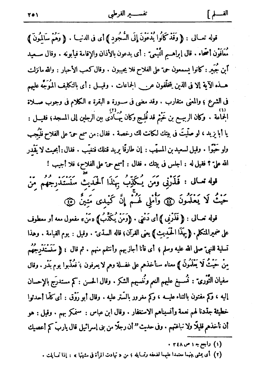 قَوْلُهُ تَعَالَى: (فَذَرْنِي) أَيْ دَعْنِي. (وَمَنْ يُكَذِّبُ) مَنْ مَفْعُولٍ مَعَهُ أَوْ مَعْطُوفٍ عَلَى ضَمِيرِ الْمُتَكَلِّمِ. (بِهذَا الْحَدِيثِ) يَعْنِي الْقُرْآنَ، قَالَهُ السُّدِّيُّ. وَقِيلَ: يَوْمَ الْقِيَامَةِ. وَهَذَا تَسْلِيَةٌ لِلنَّبِيِّ صَلَّى اللَّهُ عَلَيْهِ وَسَلَّمَ، أَيْ فَأَنَا أُجَازِيهِمْ وأنتقم منهم. ثم قال (سَنَسْتَدْرِجُهُمْ مِنْ حَيْثُ لَا يَعْلَمُونَ) مَعْنَاهُ سَنَأْخُذُهُمْ عَلَى غَفْلَةٍ وَهُمْ لَا يَعْرِفُونَ، فَعُذِّبُوا يَوْمَ بَدْرٍ. وَقَالَ سُفْيَانُ الثَّوْرِيُّ: نُسْبِغُ عَلَيْهِمُ النِّعَمَ وَنُنْسِيهِمُ الشُّكْرَ. وَقَالَ الْحَسَنُ: كَمْ مُسْتَدْرَجٌ بِالْإِحْسَانِ إِلَيْهِ، وَكَمْ مَفْتُونٌ بِالثَّنَاءِ عَلَيْهِ، وَكَمْ مَغْرُورٌ بِالسِّتْرِ عَلَيْهِ. وَقَالَ أَبُو رَوْقٍ: أَيْ كُلَّمَا أَحْدَثُوا خَطِيئَةً جَدَّدْنَا لَهُمْ نِعْمَةً وَأَنْسَيْنَاهُمُ الِاسْتِغْفَارَ. وَقَالَ ابْنُ عَبَّاسٍ: سَنَمْكُرُ بِهِمْ. وَقِيلَ: هُوَ أَنْ نَأْخُذَهُمْ قَلِيلًا وَلَا نُبَاغِتَهُمْ. وَفِي حَدِيثٍ (أَنَّ رَجُلًا مِنْ بَنِي إِسْرَائِيلَ قَالَ يَا رب كم أعصيك