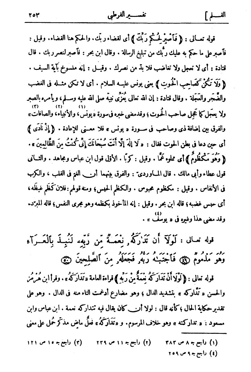 قَوْلُهُ تَعَالَى: (فَاصْبِرْ لِحُكْمِ رَبِّكَ) أَيْ لِقَضَاءِ رَبِّكَ. وَالْحُكْمُ هُنَا الْقَضَاءُ. وَقِيلَ: فَاصْبِرْ عَلَى مَا حَكَمَ بِهِ عَلَيْكَ رَبُّكَ مِنْ تَبْلِيغِ الرِّسَالَةِ. وَقَالَ ابْنُ بَحْرٍ: فَاصْبِرْ لِنَصْرِ رَبِّكَ. قَالَ قَتَادَةُ: أَيْ لَا تَعْجَلْ وَلَا تُغَاضِبْ فَلَا بُدَّ مِنْ نَصْرِكَ. وَقِيلَ: إِنَّهُ مَنْسُوخٌ بِآيَةِ السَّيْفِ. (وَلا تَكُنْ كَصاحِبِ الْحُوتِ) يَعْنِي يُونُسَ عَلَيْهِ السَّلَامُ. أَيْ لَا تَكُنْ مِثْلَهُ فِي الْغَضَبِ وَالضَّجَرِ وَالْعَجَلَةِ. وَقَالَ قَتَادَةُ: إِنَّ اللَّهَ تَعَالَى يُعَزِّي نَبِيَّهُ صَلَّى اللَّهُ عَلَيْهِ وَسَلَّمَ وَيَأْمُرُهُ بِالصَّبْرِ وَلَا يَعْجَلُ كَمَا عَجِلَ صَاحِبُ الْحُوتِ، وَقَدْ مَضَى خَبَرُهُ فِي سُورَةِ" يُونُسَ، «١» وَالْأَنْبِيَاءِ، «٢» وَالصَّافَّاتِ" «٣» وَالْفَرْقُ بَيْنَ إِضَافَةِ ذِي وَصَاحِبِ فِي سُورَةِ" يُونُسَ" فَلَا مَعْنَى لِلْإِعَادَةِ. (إِذْ نَادَى) أَيْ حِينَ دَعَا فِي بَطْنِ الْحُوتِ فَقَالَ: لَا إِلهَ إِلَّا أَنْتَ سُبْحانَكَ إِنِّي كُنْتُ مِنَ الظَّالِمِينَ [الأنبياء: ٨٧]. (وَهُوَ مَكْظُومٌ) أَيْ مَمْلُوءٌ غَمًّا. وَقِيلَ: كَرْبًا. الْأَوَّلُ قَوْلُ ابْنِ عَبَّاسٍ وَمُجَاهِدٍ. وَالثَّانِي قَوْلُ عَطَاءٍ وَأَبِي مَالِكٍ. قَالَ الْمَاوَرْدِيُّ: وَالْفَرْقُ بَيْنَهُمَا أَنَّ الْغَمَّ فِي الْقَلْبِ، وَالْكَرْبَ فِي الْأَنْفَاسِ. وَقِيلَ: مَكْظُومٌ مَحْبُوسٌ. وَالْكَظْمُ الْحَبْسُ، وَمِنْهُ قَوْلُهُمْ: فُلَانٌ كَظَمَ غَيْظَهُ، أَيْ حَبَسَ غَضَبَهُ، قَالَهُ ابْنُ بَحْرٍ. وَقِيلَ: إِنَّهُ الْمَأْخُوذُ بِكَظْمِهِ وَهُوَ مَجْرَى النَّفَسِ، قَالَهُ الْمُبَرِّدُ. وَقَدْ مَضَى هَذَا وغيره في" يوسف" «٤».