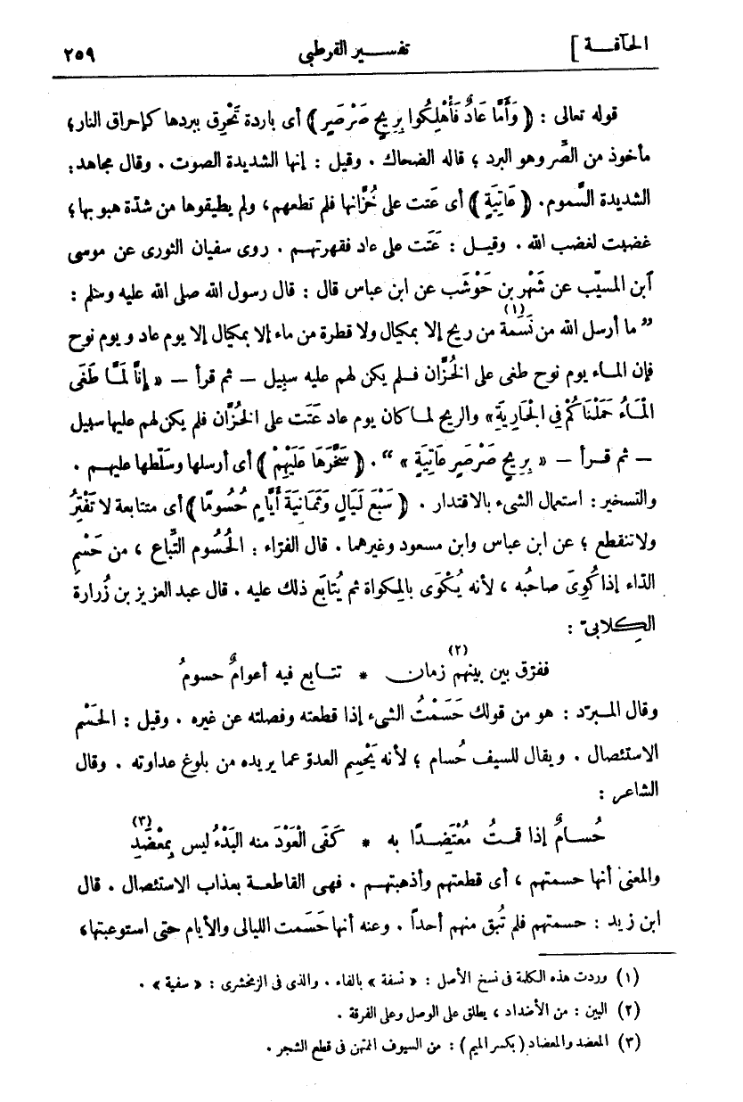 قَوْلُهُ تَعَالَى: وَأَمَّا عادٌ فَأُهْلِكُوا بِرِيحٍ صَرْصَرٍ أَيْ بَارِدَةٍ تُحْرِقُ بِبَرْدِهَا كَإِحْرَاقِ النَّارِ، مَأْخُوذٌ مِنَ الصِّرِّ وَهُوَ الْبَرْدُ، قَالَهُ الضَّحَّاكُ. وَقِيلَ: إِنَّهَا الشَّدِيدَةُ الصَّوْتِ. وَقَالَ مُجَاهِدٌ: الشَّدِيدَةُ السَّمُومِ. عاتِيَةٍ أَيْ عَتَتْ عَلَى خُزَّانِهَا فَلَمْ تُطِعْهُمْ، وَلَمْ يُطِيقُوهَا مِنْ شِدَّةِ هُبُوبِهَا، غَضِبَتْ لِغَضَبِ اللَّهِ. وَقِيلَ: عَتَتْ عَلَى عَادٍ فَقَهَرَتْهُمْ. رَوَى سفيان الثوري عن موسى ابن الْمُسَيَّبِ عَنْ شَهْرُ بْنُ حَوْشَبٍ عَنِ ابْنِ عَبَّاسٍ قَالَ: قَالَ رَسُولُ اللَّهِ صَلَّى اللَّهُ عَلَيْهِ وَسَلَّمَ: (مَا أَرْسَلَ اللَّهُ مِنْ نَسَمَةٍ «١» مِنْ رِيحٍ إِلَّا بِمِكْيَالٍ وَلَا قَطْرَةٍ مِنْ مَاءٍ إِلَّا بِمِكْيَالٍ إِلَّا يَوْمَ عَادٍ وَيَوْمَ نُوحٍ فَإِنَّ الْمَاءَ يَوْمَ نُوحٍ طَغَى عَلَى الْخُزَّانِ فَلَمْ يَكُنْ لَهُمْ عَلَيْهِ سَبِيلٌ- ثُمَّ قَرَأَ- إِنَّا لَمَّا طَغَى الْماءُ حَمَلْناكُمْ فِي الْجارِيَةِ وَالرِّيحُ لَمَّا كَانَ يَوْمَ عَادٍ عَتَتْ عَلَى الْخُزَّانِ فَلَمْ يَكُنْ لَهُمْ عَلَيْهَا سَبِيلٌ- ثُمَّ قَرَأَ- بِرِيحٍ صَرْصَرٍ عاتِيَةٍ سَخَّرَها عَلَيْهِمْ) أَيْ أَرْسَلَهَا وَسَلَّطَهَا عَلَيْهِمْ. وَالتَّسْخِيرُ: اسْتِعْمَالُ الشَّيْءِ بِالِاقْتِدَارِ. (سَبْعَ لَيالٍ وَثَمانِيَةَ أَيَّامٍ حُسُوماً) أَيْ مُتَتَابِعَةً لَا تَفْتُرُ وَلَا تَنْقَطِعُ، عَنِ ابْنِ عَبَّاسٍ وَابْنِ مَسْعُودٍ وَغَيْرِهِمَا. قَالَ الْفَرَّاءُ: الْحُسُومُ التِّبَاعُ، مِنْ حَسْمِ الدَّاءِ إِذَا كُوِيَ صَاحِبُهُ، لِأَنَّهُ يُكْوَى بِالْمِكْوَاةِ ثُمَّ يُتَابَعُ ذَلِكَ عَلَيْهِ. قَالَ عَبْدُ الْعَزِيزِ بْنُ زُرَارَةَ الْكِلَابِيُّ:
