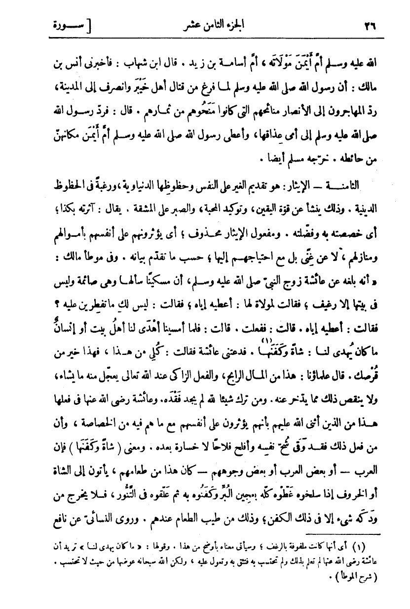 اللَّهُ عَلَيْهِ وَسَلَّمَ أُمَّ أَيْمَنَ مَوْلَاتَهُ، ثُمَّ أُسَامَةَ بْنَ زَيْدٍ. قَالَ ابْنُ شِهَابٍ: فَأَخْبَرَنِي أَنَسِ بْنِ مَالِكٍ: أَنَّ رَسُولَ اللَّهِ صَلَّى اللَّهُ عَلَيْهِ وَسَلَّمَ لَمَّا فَرَغَ مِنْ قِتَالِ أَهْلِ خَيْبَرَ وَانْصَرَفَ إِلَى الْمَدِينَةِ، رَدَّ الْمُهَاجِرُونَ إِلَى الْأَنْصَارِ مَنَائِحَهُمُ الَّتِي كَانُوا مَنَحُوهُمْ مِنْ ثِمَارِهِمْ. قَالَ: فَرَدَّ رَسُولُ اللَّهِ صَلَّى اللَّهُ عَلَيْهِ وَسَلَّمَ إِلَى أُمِّي عِذَاقَهَا، وَأَعْطَى رَسُولُ اللَّهِ صَلَّى اللَّهُ عَلَيْهِ وَسَلَّمَ أُمَّ أَيْمَنَ مَكَانَهُنَّ مِنْ حَائِطِهِ. خَرَّجَهُ مُسْلِمٌ أَيْضًا. الثَّامِنَةُ- الْإِيثَارُ: هُوَ تَقْدِيمُ الْغَيْرِ عَلَى النَّفْسِ وَحُظُوظِهَا الدنياوية، وَرَغْبَةٌ فِي الْحُظُوظِ الدِّينِيَّةِ. وَذَلِكَ يَنْشَأُ عَنْ قُوَّةِ الْيَقِينِ، وَتَوْكِيدِ الْمَحَبَّةِ، وَالصَّبْرِ عَلَى الْمَشَقَّةِ. يُقَالُ: آثَرْتُهُ بِكَذَا، أَيْ خَصَصْتُهُ بِهِ وَفَضَّلْتُهُ. وَمَفْعُولُ الْإِيثَارِ مَحْذُوفٌ، أَيْ يُؤْثِرُونَهُمْ عَلَى أَنْفُسِهِمْ بِأَمْوَالِهِمْ وَمَنَازِلِهِمْ، لَا عَنْ غِنًى بَلْ مَعَ احْتِيَاجِهِمْ إِلَيْهَا، حَسَبَ مَا تَقَدَّمَ بَيَانُهُ. وَفِي مُوَطَّأِ مَالِكٍ:" أَنَّهُ بَلَغَهُ عَنْ عَائِشَةَ زَوْجِ النَّبِيِّ صَلَّى اللَّهُ عَلَيْهِ وَسَلَّمَ، أَنَّ مِسْكِينًا سَأَلَهَا وَهِيَ صَائِمَةٌ وَلَيْسَ فِي بَيْتِهَا إِلَّا رَغِيفٌ فَقَالَتْ لِمَوْلَاةٍ لَهَا: أَعْطِيهِ إِيَّاهُ، فَقَالَتْ: لَيْسَ لَكِ مَا تُفْطِرِينَ عَلَيْهِ؟ فَقَالَتْ: أَعْطِيهِ إِيَّاهُ. قَالَتْ: فَفَعَلَتْ. قَالَتْ: فَلَمَّا أَمْسَيْنَا أَهْدَى لَنَا أَهْلُ بَيْتٍ أَوْ إِنْسَانٌ مَا كَانَ يُهْدَى لَنَا: شَاةً وَكَفَنَهَا «١». فَدَعَتْنِي عَائِشَةُ فَقَالَتْ: كُلِي مِنْ هَذَا، فَهَذَا خَيْرٌ مِنْ قُرْصِكِ. قَالَ عُلَمَاؤُنَا: هَذَا مِنَ الْمَالِ الرَّابِحِ، وَالْفِعْلُ الزَّاكِي عِنْدَ اللَّهِ تَعَالَى يُعَجِّلُ مِنْهُ مَا يشاء ولا ينقص ذلك مما يدخر عَنْهُ. وَمَنْ تَرَكَ شَيْئًا لِلَّهِ لَمْ يَجِدْ فَقْدَهُ. وَعَائِشَةُ رَضِيَ اللَّهُ عَنْهَا فِي فِعْلِهَا هَذَا مِنَ الَّذِينَ أَثْنَى اللَّهُ عَلَيْهِمْ بِأَنَّهُمْ يُؤْثِرُونَ عَلَى أَنْفُسِهِمْ مَعَ مَا هُمْ فِيهِ مِنَ الْخَصَاصَةِ، وَأَنَّ مَنْ فَعَلَ ذَلِكَ فَقَدْ وُقِيَ شُحَّ نَفْسِهِ وَأَفْلَحَ فَلَاحًا لَا خَسَارَةَ بَعْدَهُ. وَمَعْنَى (شَاةً وَكَفَنَهَا) فَإِنَّ الْعَرَبَ- أَوْ بَعْضَ الْعَرَبِ أَوْ بَعْضَ وُجُوهِهِمْ- كَانَ هَذَا مِنْ طَعَامِهِمْ، يَأْتُونَ إِلَى الشَّاةِ أَوِ الْخَرُوفِ إِذَا سَلَخُوهُ غَطَّوْهُ كُلَّهُ بِعَجِينِ الْبُرِّ وَكَفَنُوهُ بِهِ ثُمَّ عَلَّقُوهُ فِي التَّنُّورِ، فَلَا يَخْرُجُ من ودكه شي إِلَّا فِي ذَلِكَ الْكَفَنِ، وَذَلِكَ مِنْ طِيبِ الطعام عندهم. وروى النسائي عن نافع