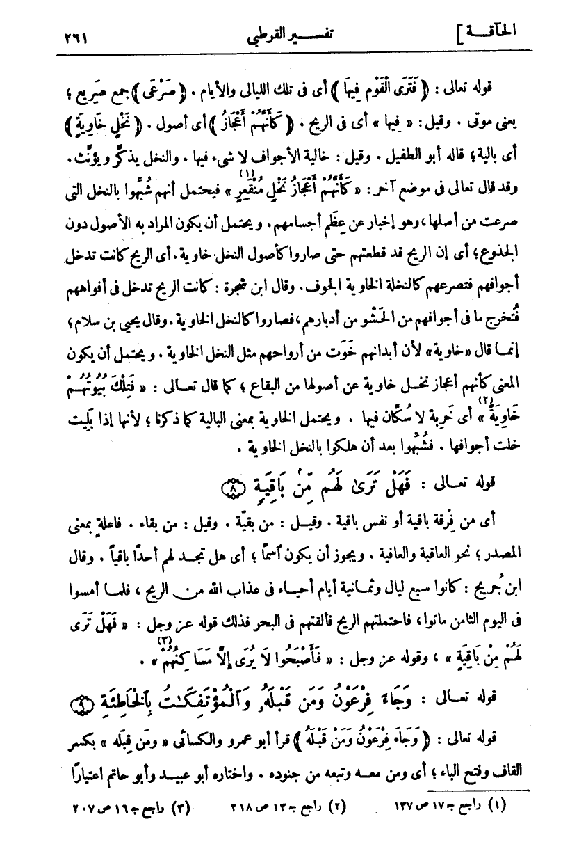 أَيْ مِنْ فِرْقَةٍ بَاقِيَةٍ أَوْ نَفْسٍ بَاقِيَةٍ. وَقِيلَ: مِنْ بَقِيَّةٍ. وَقِيلَ: مِنْ بَقَاءٍ. فَاعِلَةٌ بِمَعْنَى الْمَصْدَرِ، نَحْوُ الْعَاقِبَةِ وَالْعَافِيَةِ. وَيَجُوزُ أَنْ يَكُونَ اسْمًا، أَيْ هَلْ تَجِدُ لَهُمْ أَحَدًا بَاقِيًا. وَقَالَ ابْنُ جُرَيْجٍ: كَانُوا سَبْعَ لَيَالٍ وَثَمَانِيَةَ أَيَّامٍ أَحْيَاءً فِي عَذَابِ اللَّهِ مِنَ الرِّيحِ، فَلَمَّا أَمْسَوْا فِي الْيَوْمِ الثَّامِنِ مَاتُوا، فَاحْتَمَلَتْهُمُ الرِّيحُ فألقتهم في البحر فذلك قَوْلُهُ عَزَّ وَجَلَّ: فَهَلْ تَرى لَهُمْ مِنْ باقِيَةٍ، وَقَوْلُهُ عَزَّ وَجَلَّ: فَأَصْبَحُوا لَا يُرى إِلَّا مَساكِنُهُمْ «٣» [الأحقاف: ٢٥].