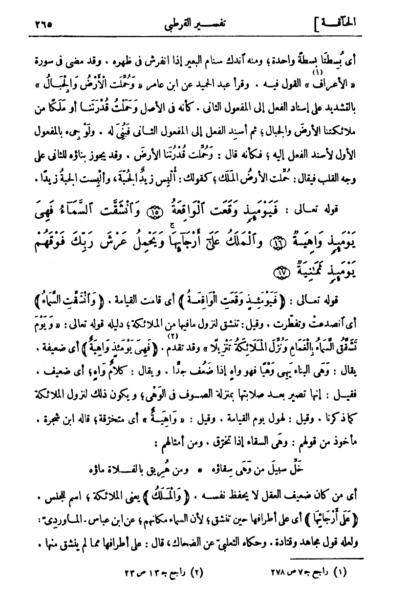 فَيَوْمَئِذٍ وَقَعَتِ الْواقِعَةُ (١٥) وَانْشَقَّتِ السَّماءُ فَهِيَ يَوْمَئِذٍ واهِيَةٌ (١٦) وَالْمَلَكُ عَلى أَرْجائِها وَيَحْمِلُ عَرْشَ رَبِّكَ فَوْقَهُمْ يَوْمَئِذٍ ثَمانِيَةٌ (١٧)
