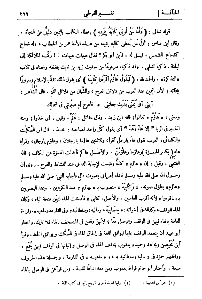 وَمَعْنَى: هاؤُمُ تَعَالَوْا، قَالَهُ ابْنُ زَيْدٍ. وَقَالَ مُقَاتِلٌ: هَلُمَّ. وَقِيلَ: أَيْ خُذُوا، وَمِنْهُ الْخَبَرُ فِي الرِّبَا (إِلَّا هَاءَ وَهَاءَ) أَيْ يَقُولُ كُلُّ وَاحِدٍ لِصَاحِبِهِ: خُذْ. قَالَ ابْنُ السِّكِّيتِ وَالْكِسَائِيُّ: الْعَرَبُ تَقُولُ هَاءَ يَا رَجُلُ اقْرَأْ، وَلِلِاثْنَيْنِ هَاؤُمَا يَا رَجُلَانِ، وهاؤم يا رجال، وللمرأة هاء (بكسر الهمزة) وهاؤما وهاؤمن. والأصل ها كم فأبدلت الهمزة من الكاف، قاله الْقُتَيْبِيُّ «٢». وَقِيلَ: إِنَّ هاؤُمُ كَلِمَةٌ وُضِعَتْ لِإِجَابَةِ الدَّاعِي عِنْدَ النَّشَاطِ وَالْفَرَحِ. رُوِيَ أَنَّ رَسُولَ اللَّهِ صَلَّى اللَّهُ عَلَيْهِ وَسَلَّمَ نَادَاهُ أَعْرَابِيٌّ بِصَوْتٍ عَالٍ فَأَجَابَهُ النَّبِيُّ صَلَّى اللَّهُ عَلَيْهِ وَسَلَّمَ هاؤُمُ يُطَوِّلُ صَوْتَهُ. وكِتابِيَهْ مَنْصُوبٌ بِ هاؤُمُ عند الكوفيين. وعند البصريين ب اقْرَؤُا لِأَنَّهُ أَقْرَبُ الْعَامِلَيْنِ. وَالْأَصْلُ" كِتَابِي" فَأُدْخِلَتِ الْهَاءُ لِتُبَيِّنَ فَتْحَةَ الْيَاءِ، وَكَانَ الْهَاءُ لِلْوَقْفِ، وَكَذَلِكَ في أخواته: حِسابِيَهْ، ومالِيَهْ، وسُلْطانِيَهْ وفي القارعة ما هِيَهْ. وَقِرَاءَةُ الْعَامَّةِ بِالْهَاءِ فِيهِنَّ فِي الْوَقْفِ وَالْوَصْلِ مَعًا، لِأَنَّهُنَّ وَقَعْنَ فِي الْمُصْحَفِ بِالْهَاءِ فَلَا تُتْرَكُ. وَاخْتَارَ أَبُو عُبَيْدٍ أَنْ يَتَعَمَّدَ الْوَقْفَ عَلَيْهَا لِيُوَافِقَ اللُّغَةَ فِي إِلْحَاقِ الْهَاءِ فِي السَّكْتِ وَيُوَافِقُ الْخَطَّ. وَقَرَأَ ابْنُ مُحَيْصِنٍ وَمُجَاهِدٌ وَحُمَيْدٌ وَيَعْقُوبُ بِحَذْفِ الْهَاءِ فِي الْوَصْلِ وَإِثْبَاتِهَا فِي الْوَقْفِ فِيهِنَّ جَمْعٌ. وَوَافَقَهُمْ حَمْزَةُ فِي مالِيَهْ وسُلْطانِيَهْ، وما هِيَهْ فِي الْقَارِعَةِ. وَجُمْلَةُ هَذِهِ الْحُرُوفِ سَبْعَةٌ. وَاخْتَارَ أَبُو حَاتِمٍ قِرَاءَةَ يَعْقُوبَ وَمَنْ مَعَهُ اتِّبَاعًا للغة. ومن قرأهن في الوصل بالهاء