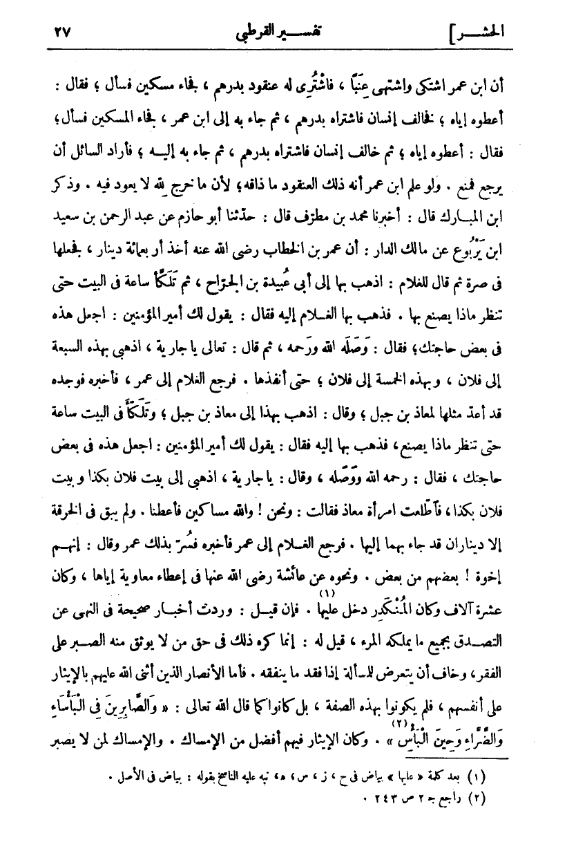 أَنَّ ابْنَ عُمَرَ اشْتَكَى وَاشْتَهَى عِنَبًا، فَاشْتُرِيَ لَهُ عُنْقُودٌ بِدِرْهَمٍ، فَجَاءَ مِسْكِينٌ فَسَأَلَ، فَقَالَ: أَعْطُوهُ إِيَّاهُ، فَخَالَفَ إِنْسَانٌ فَاشْتَرَاهُ بِدِرْهَمٍ، ثُمَّ جَاءَ بِهِ إِلَى ابْنِ عُمَرَ، فَجَاءَ الْمِسْكِينُ فَسَأَلَ، فَقَالَ: أَعْطُوهُ إِيَّاهُ، ثُمَّ خَالَفَ إِنْسَانٌ فَاشْتَرَاهُ بِدِرْهَمٍ، ثُمَّ جَاءَ بِهِ إِلَيْهِ، فَأَرَادَ السَّائِلُ أَنْ يَرْجِعَ فَمُنِعَ. وَلَوْ عَلِمَ ابْنُ عُمَرَ أَنَّهُ ذَلِكَ الْعُنْقُودُ مَا ذَاقَهُ، لِأَنَّ مَا خَرَجَ لِلَّهِ لَا يَعُودُ فِيهِ. وَذَكَرَ ابْنُ الْمُبَارَكِ قَالَ: أَخْبَرَنَا مُحَمَّدُ بْنُ مُطَرِّفٍ قَالَ: حَدَّثَنَا أَبُو حَازِمٍ عَنْ عَبْدِ الرَّحْمَنِ بْنِ سَعِيدِ بْنِ يَرْبُوعٍ عَنْ مَالِكِ الدَّارِ: أَنَّ عُمَرَ بْنَ الْخَطَّابِ رَضِيَ اللَّهُ عَنْهُ أَخَذَ أَرْبَعَمِائَةِ دِينَارٍ، فَجَعَلَهَا فِي صُرَّةٍ ثُمَّ قَالَ لِلْغُلَامِ: اذْهَبْ بِهَا إِلَى أَبِي عُبَيْدَةَ بْنِ الْجَرَّاحِ، ثُمَّ تَلَكَّأْ سَاعَةً فِي الْبَيْتِ حَتَّى تَنْظُرَ مَاذَا يَصْنَعُ بِهَا. فَذَهَبَ بِهَا الْغُلَامُ إِلَيْهِ فَقَالَ: يَقُولُ لَكَ أَمِيرُ الْمُؤْمِنِينَ: اجْعَلْ هَذِهِ فِي بَعْضِ حَاجَتِكَ، فَقَالَ: وَصَلَهُ اللَّهُ وَرَحِمَهُ، ثُمَّ قَالَ: تَعَالَيْ يَا جَارِيَةُ، اذْهَبِي بِهَذِهِ السَّبْعَةِ إِلَى فُلَانٍ، وَبِهَذِهِ الْخَمْسَةِ إِلَى فُلَانٍ، حَتَّى أَنْفَذَهَا. فَرَجَعَ الْغُلَامُ إِلَى عُمَرَ، فَأَخْبَرَهُ فَوَجَدَهُ قَدْ أَعَدَّ مِثْلَهَا لِمُعَاذِ بْنِ جَبَلٍ، وَقَالَ: اذْهَبْ بِهَذَا إِلَى مُعَاذِ بْنِ جَبَلٍ، وَتَلَكَّأْ فِي الْبَيْتِ سَاعَةً حَتَّى تَنْظُرَ مَاذَا يَصْنَعُ، فَذَهَبَ بِهَا إِلَيْهِ فَقَالَ: يَقُولُ لَكَ أَمِيرُ الْمُؤْمِنِينَ: اجْعَلْ هَذِهِ فِي بَعْضِ حَاجَتِكَ، فَقَالَ: رَحِمَهُ اللَّهُ وَوَصَلَهُ، وَقَالَ: يَا جَارِيَةُ، اذْهَبِي إِلَى بَيْتِ فُلَانٍ بِكَذَا وبئت فُلَانٍ بِكَذَا، فَاطَّلَعَتْ امْرَأَةُ مُعَاذٍ فَقَالَتْ: وَنَحْنُ! وَاللَّهِ مَسَاكِينُ فَأَعْطِنَا. وَلَمْ يَبْقَ فِي الْخِرْقَةِ إِلَّا دِينَارَانِ قَدْ جَاءَ بِهِمَا إِلَيْهَا. فَرَجَعَ الْغُلَامُ إِلَى عُمَرَ فَأَخْبَرَهُ فَسُرَّ بِذَلِكَ عُمَرُ وَقَالَ: إِنَّهُمْ إِخْوَةٌ! بَعْضُهُمْ مِنْ بَعْضٍ. وَنَحْوُهُ عَنْ عَائِشَةَ رَضِيَ اللَّهُ عَنْهَا فِي إِعْطَاءِ مُعَاوِيَةَ إِيَّاهَا، وَكَانَ عَشَرَةَ آلَافٍ وَكَانَ الْمُنْكَدِرُ دَخَلَ عَلَيْهَا «١». فَإِنْ قِيلَ: وَرَدَتْ أَخْبَارٌ صَحِيحَةٌ فِي النَّهْيِ عَنِ التَّصَدُّقِ بِجَمِيعِ مَا يَمْلِكُهُ الْمَرْءُ، قِيلَ لَهُ: إِنَّمَا كُرِهَ ذَلِكَ فِي حَقِّ مَنْ لَا يَوْثُقُ مِنْهُ الصَّبْرُ عَلَى الْفَقْرِ، وَخَافَ أَنْ يَتَعَرَّضَ لِلْمَسْأَلَةِ إِذَا فَقَدَ مَا يُنْفِقُهُ. فَأَمَّا الْأَنْصَارُ الَّذِينَ أَثْنَى اللَّهُ عَلَيْهِمْ بِالْإِيثَارِ عَلَى أَنْفُسِهِمْ، فَلَمْ يَكُونُوا بِهَذِهِ الصِّفَةِ، بَلْ كَانُوا كَمَا قَالَ اللَّهُ تَعَالَى: وَالصَّابِرِينَ فِي الْبَأْساءِ وَالضَّرَّاءِ وَحِينَ الْبَأْسِ «٢» [البقرة: ١٧٧]. وَكَانَ الْإِيثَارُ فِيهِمْ أَفْضَلَ مِنَ الْإِمْسَاكِ. وَالْإِمْسَاكُ لمن لا يصبر