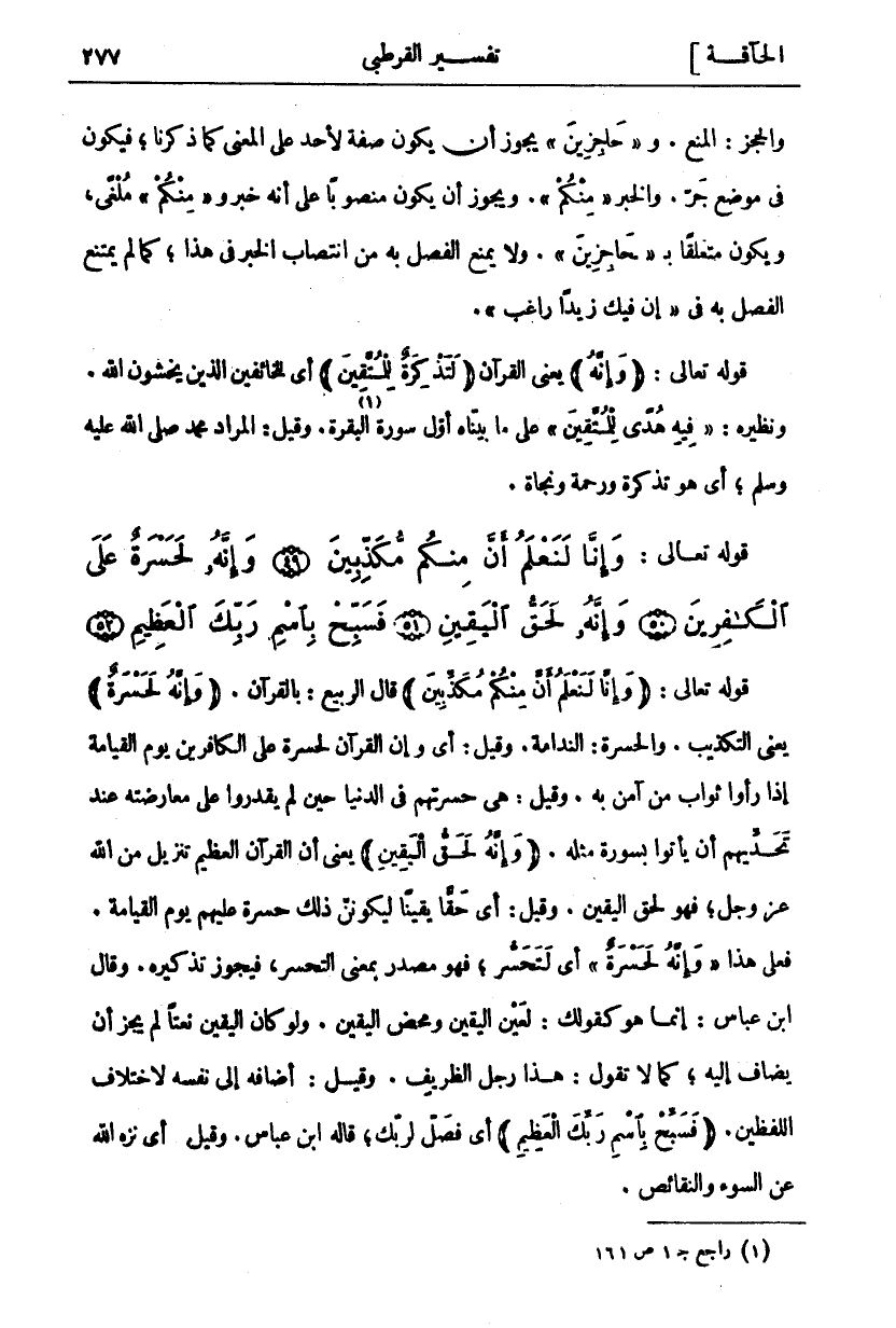 قَوْلُهُ تَعَالَى: (وَإِنَّا لَنَعْلَمُ أَنَّ مِنْكُمْ مُكَذِّبِينَ) قَالَ الرَّبِيعُ: بِالْقُرْآنِ. (وَإِنَّهُ لَحَسْرَةٌ) يَعْنِي التَّكْذِيبَ. وَالْحَسْرَةُ: النَّدَامَةُ. وَقِيلَ: أَيْ وَإِنَّ الْقُرْآنَ لَحَسْرَةٌ عَلَى الْكَافِرِينَ يَوْمَ الْقِيَامَةِ إِذَا رَأَوْا ثَوَابَ مَنْ آمَنَ بِهِ. وَقِيلَ: هِيَ حَسْرَتُهُمْ فِي الدُّنْيَا حِينَ لَمْ يَقْدِرُوا عَلَى مُعَارَضَتِهِ عِنْدَ تَحَدِّيهِمْ أَنْ يَأْتُوا بِسُورَةٍ مِثْلِهِ. (وَإِنَّهُ لَحَقُّ الْيَقِينِ) يَعْنِي أَنَّ الْقُرْآنَ الْعَظِيمَ تَنْزِيلٌ مِنَ اللَّهِ عَزَّ وَجَلَّ، فَهُوَ لَحَقُّ الْيَقِينِ. وَقِيلَ: أَيْ حَقًّا يَقِينًا لَيَكُونَنَّ ذَلِكَ حَسْرَةً عَلَيْهِمْ يَوْمَ الْقِيَامَةِ. فَعَلَى هَذَا وَإِنَّهُ لَحَسْرَةٌ أَيْ لَتَحَسُّرٌ، فَهُوَ مَصْدَرٌ بِمَعْنَى التَّحَسُّرِ، فَيَجُوزُ تَذْكِيرُهُ. وَقَالَ ابْنُ عَبَّاسٍ: إِنَّمَا هُوَ كَقَوْلِكَ: لَعَيْنُ الْيَقِينِ وَمَحْضُ الْيَقِينِ. وَلَوْ كَانَ الْيَقِينُ نَعْتًا لَمْ يَجُزْ أَنْ يُضَافَ إِلَيْهِ، كَمَا لَا تَقُولُ: هَذَا رَجُلُ الظَّرِيفِ. وَقِيلَ: أَضَافَهُ إِلَى نَفْسِهِ لِاخْتِلَافِ اللَّفْظَيْنِ. (فَسَبِّحْ بِاسْمِ رَبِّكَ الْعَظِيمِ) أَيْ فَصَلِّ لِرَبِّكَ، قَالَهُ ابْنُ عَبَّاسٍ. وَقِيلَ: أَيْ نَزِّهِ اللَّهَ عَنِ السُّوءِ والنقائص.