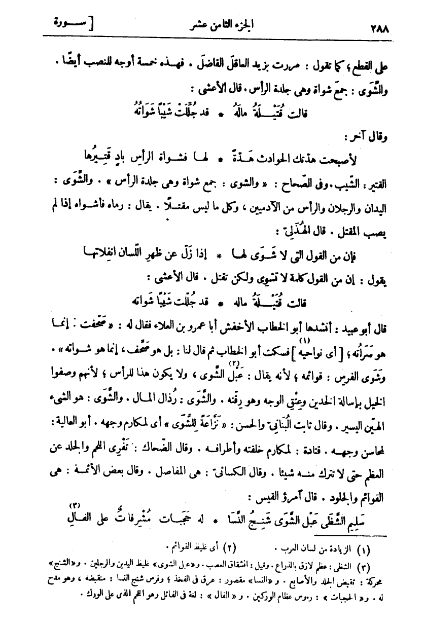 قَالَ أَبُو عُبَيْدٍ: أَنْشَدَهَا أَبُو الْخَطَّابِ الْأَخْفَشُ أَبَا عَمْرِو بْنَ الْعَلَاءِ فَقَالَ لَهُ:" صَحَّفْتَ! إِنَّمَا هُوَ سَرَاتُهُ، أَيْ نَوَاحِيهِ «١» فَسَكَتَ أَبُو الْخَطَّابِ ثُمَّ قَالَ لَنَا: بَلْ هُوَ صَحَّفَ، إِنَّمَا هُوَ شَوَاتُهُ". وَشَوَى الْفَرَسُ: قَوَائِمُهُ، لِأَنَّهُ يُقَالُ: عَبْلُ «٢» الشَّوَى، وَلَا يَكُونُ هَذَا لِلرَّأْسِ، لِأَنَّهُمْ وَصَفُوا الْخَيْلَ بِإِسَالَةِ الْخَدَّيْنِ وَعِتْقِ الْوَجْهِ وَهُوَ رِقَّتُهُ. وَالشَّوَى: رُذَالُ الْمَالِ. وَالشَّوَى: هُوَ الشَّيْءُ الْهَيِّنُ الْيَسِيرُ. وَقَالَ ثَابِتٌ الْبُنَانِيُّ وَالْحَسَنُ: نَزَّاعَةً لِلشَّوى أَيْ لِمَكَارِمَ وَجْهِهِ. أَبُو الْعَالِيَةِ: لِمَحَاسِنِ وَجْهِهِ. قَتَادَةُ: لِمَكَارِمَ خِلْقَتِهِ وَأَطْرَافِهِ. وَقَالَ الضَّحَّاكُ: تَفْرِي اللَّحْمَ وَالْجِلْدَ عَنِ الْعَظْمِ حَتَّى لَا تَتْرُكَ مِنْهُ شَيْئًا. وَقَالَ الْكِسَائِيُّ: هِيَ الْمَفَاصِلُ. وَقَالَ بَعْضُ الْأَئِمَّةِ: هِيَ الْقَوَائِمُ وَالْجُلُودُ. قَالَ امْرُؤُ الْقَيْسِ: