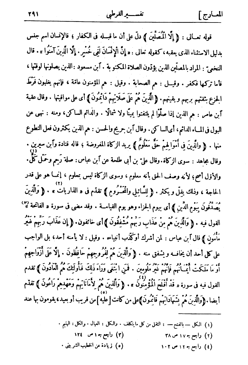 قَوْلُهُ تَعَالَى: (إِلَّا الْمُصَلِّينَ) دَلَّ عَلَى أَنَّ مَا قَبْلَهُ فِي الْكُفَّارِ، فَالْإِنْسَانُ اسْمُ جِنْسٍ بِدَلِيلِ الِاسْتِثْنَاءِ الَّذِي يَعْقُبُهُ كَقَوْلِهِ تَعَالَى: إِنَّ الْإِنْسانَ لَفِي خُسْرٍ إِلَّا الَّذِينَ آمَنُوا [العصر: ٣ - ٢]. قال النخعي: المراد بالمصلين الذين يُؤَدُّونَ الصَّلَاةَ الْمَكْتُوبَةَ. ابْنُ مَسْعُودٍ: الَّذِينَ يُصَلُّونَهَا لِوَقْتِهَا، فَأَمَّا تَرْكُهَا فَكُفْرٌ. وَقِيلَ: هُمُ الصَّحَابَةُ. وَقِيلَ: هُمُ الْمُؤْمِنُونَ عَامَّةً، فَإِنَّهُمْ يَغْلِبُونَ فَرْطَ الْجَزَعِ بِثِقَتِهِمْ بِرَبِّهِمْ وَيَقِينِهِمْ (الَّذِينَ هُمْ عَلى صَلاتِهِمْ دائِمُونَ) أَيْ عَلَى مَوَاقِيتِهَا. وَقَالَ عُقْبَةُ ابن عَامِرٍ: هُمُ الَّذِينَ إِذَا صَلَّوْا لَمْ يَلْتَفِتُوا يَمِينًا وَلَا شِمَالًا. وَالدَّائِمُ السَّاكِنُ، وَمِنْهُ: نُهِيَ عَنِ الْبَوْلِ فِي الْمَاءِ الدَّائِمِ، أَيِ السَّاكِنِ. وَقَالَ ابْنُ جُرَيْجٍ وَالْحَسَنُ: هُمُ الَّذِينَ يُكْثِرُونَ فِعْلَ التَّطَوُّعِ مِنْهَا. (وَالَّذِينَ فِي أَمْوالِهِمْ حَقٌّ مَعْلُومٌ) يُرِيدُ الزَّكَاةَ الْمَفْرُوضَةَ، قَالَهُ قَتَادَةُ وَابْنُ سِيرِينَ. وَقَالَ مُجَاهِدٌ: سِوَى الزَّكَاةِ. وَقَالَ عَلِيُّ بْنُ أَبِي طَلْحَةَ عَنِ ابْنِ عَبَّاسٍ: صِلَةُ رَحِمٍ وَحَمْلٍ كَلٍّ «١». وَالْأَوَّلُ أَصَحُّ، لِأَنَّهُ وَصَفَ الْحَقَّ بِأَنَّهُ مَعْلُومٌ، وَسِوَى الزَّكَاةِ لَيْسَ بِمَعْلُومٍ، إِنَّمَا هُوَ عَلَى قَدْرِ الْحَاجَةِ، وَذَلِكَ يَقِلُّ وَيَكْثُرُ. لِلسَّائِلِ وَالْمَحْرُومِ تَقَدَّمَ فِي" الذَّارِيَاتِ" «٢». (وَالَّذِينَ يُصَدِّقُونَ بِيَوْمِ الدِّينِ) أَيْ بِيَوْمِ الْجَزَاءِ وَهُوَ يَوْمُ الْقِيَامَةِ. وَقَدْ مَضَى فِي سُورَةِ" الْفَاتِحَةِ" الْقَوْلُ فِيهِ. (وَالَّذِينَ هُمْ مِنْ عَذابِ رَبِّهِمْ مُشْفِقُونَ) أَيْ خَائِفُونَ. (إِنَّ عَذابَ رَبِّهِمْ غَيْرُ مَأْمُونٍ) قَالَ ابْنُ عَبَّاسٍ: لِمَنْ أَشْرَكَ أَوْ كَذَّبَ أَنْبِيَاءَهُ. وَقِيلَ: لَا يَأْمَنُهُ أَحَدٌ، بَلِ الْوَاجِبُ عَلَى كُلِّ أَحَدٍ أَنْ يَخَافَهُ وَيُشْفِقَ مِنْهُ (وَالَّذِينَ هُمْ لِفُرُوجِهِمْ حافِظُونَ. إِلَّا عَلى أَزْواجِهِمْ أَوْ مَا مَلَكَتْ «٣» أَيْمانُهُمْ فَإِنَّهُمْ غَيْرُ مَلُومِينَ. فَمَنِ ابْتَغى وَراءَ ذلِكَ فَأُولئِكَ هُمُ العادُونَ) تَقَدَّمَ الْقَوْلُ فِيهِ فِي سُورَةِ (قَدْ أَفْلَحَ الْمُؤْمِنُونَ). «٤» (وَالَّذِينَ هُمْ لِأَماناتِهِمْ وَعَهْدِهِمْ راعُونَ) تَقَدَّمَ أَيْضًا. (وَالَّذِينَ هُمْ بِشَهاداتِهِمْ قائِمُونَ) عَلَى مَنْ كَانَتْ عَلَيْهِ «٥» مِنْ قَرِيبٍ أَوْ بَعِيدٍ، يقومون بها عند