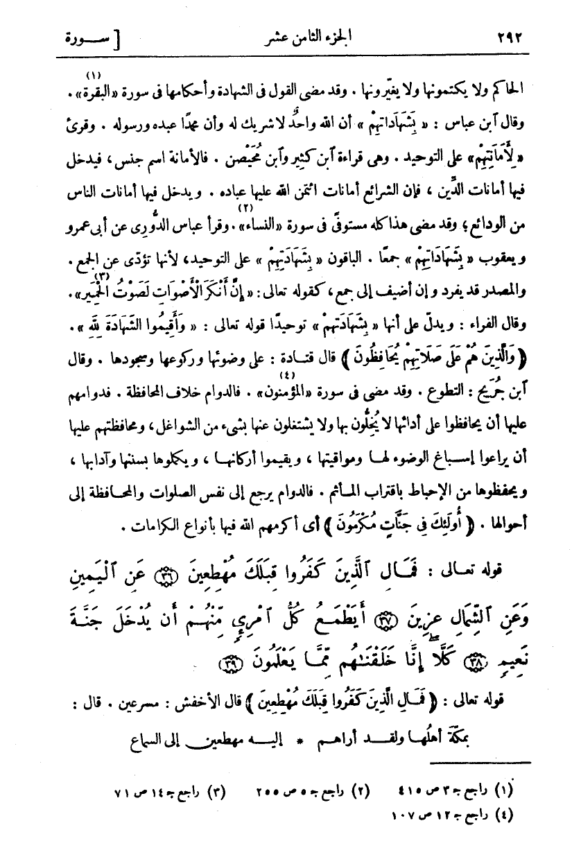 الْحَاكِمِ وَلَا يَكْتُمُونَهَا وَلَا يُغَيِّرُونَهَا. وَقَدْ مَضَى الْقَوْلُ فِي الشَّهَادَةِ وَأَحْكَامِهَا فِي سُورَةِ" الْبَقَرَةِ" «١». وَقَالَ ابْنُ عَبَّاسٍ: بِشَهاداتِهِمْ أَنَّ اللَّهَ وَاحِدٌ لَا شَرِيكَ لَهُ وَأَنَّ مُحَمَّدًا عَبْدُهُ وَرَسُولُهُ. وقرى" لِأَمَانَتِهِمْ عَلَى التَّوْحِيدِ. وَهِيَ قِرَاءَةُ ابْنِ كَثِيرٍ وَابْنِ مُحَيْصِنٍ. فَالْأَمَانَةُ اسْمُ جِنْسٍ، فَيَدْخُلُ فِيهَا أَمَانَاتُ الدِّينِ، فَإِنَّ الشَّرَائِعَ أَمَانَاتٌ ائْتَمَنَ اللَّهُ عَلَيْهَا عِبَادَهُ. وَيَدْخُلُ فِيهَا أَمَانَاتُ النَّاسِ مِنَ الْوَدَائِعِ، وَقَدْ مَضَى هَذَا كُلُّهُ مُسْتَوْفًى فِي سُورَةِ" النِّسَاءِ" «٢». وَقَرَأَ عَبَّاسٌ الدُّورِيُّ عَنْ أَبِي عَمْرٍو وَيَعْقُوبَ بِشَهاداتِهِمْ جَمْعًا. الْبَاقُونَ" بِشَهَادَتِهِمْ" عَلَى التَّوْحِيدِ، لِأَنَّهَا تُؤَدِّي عَنِ الْجَمْعِ. وَالْمَصْدَرُ قَدْ يُفْرَدُ وَإِنْ أُضِيفَ إِلَى جَمْعٍ، كَقَوْلِهِ تَعَالَى: إِنَّ أَنْكَرَ الْأَصْواتِ لَصَوْتُ الْحَمِيرِ «٣». [لقمان: ١٩] وَقَالَ الْفَرَّاءُ: وَيَدُلُّ عَلَى أَنَّهَا" بِشَهَادَتِهِمْ" تَوْحِيدًا قوله تعالى: وَأَقِيمُوا الشَّهادَةَ لِلَّهِ [الطلاق: ٢]. (وَالَّذِينَ هُمْ عَلى صَلاتِهِمْ يُحافِظُونَ) قَالَ قَتَادَةُ: عَلَى وُضُوئِهَا وَرُكُوعِهَا وَسُجُودِهَا. وَقَالَ ابْنُ جُرَيْجٍ: التَّطَوُّعُ. وَقَدْ مَضَى فِي سُورَةِ" الْمُؤْمِنُونَ" «٤». فَالدَّوَامُ خِلَافُ الْمُحَافَظَةِ. فَدَوَامُهُمْ عَلَيْهَا أَنْ يُحَافِظُوا عَلَى أَدَائِهَا لَا يُخِلُّونَ بِهَا وَلَا يَشْتَغِلُونَ عَنْهَا بِشَيْءٍ مِنَ الشَّوَاغِلِ، وَمُحَافَظَتُهُمْ عَلَيْهَا أَنْ يُرَاعُوا إِسْبَاغَ الْوُضُوءِ لَهَا وَمَوَاقِيتَهَا، وَيُقِيمُوا أَرْكَانَهَا، وَيُكْمِلُوهَا بِسُنَنِهَا وَآدَابِهَا، وَيَحْفَظُوهَا مِنَ الْإِحْبَاطِ بِاقْتِرَابِ الْمَأْثَمِ. فَالدَّوَامُ يَرْجِعُ إِلَى نَفْسِ الصَّلَوَاتِ وَالْمُحَافَظَةُ إِلَى أَحْوَالِهَا. (أُولئِكَ فِي جَنَّاتٍ مُكْرَمُونَ) أَيْ أَكْرَمَهُمُ الله فيها بأنواع الكرامات.