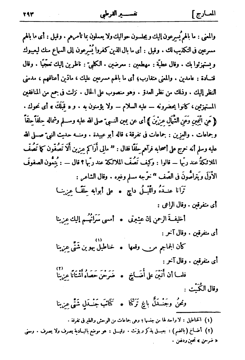 وَالْمَعْنَى: مَا بَالُهُمْ يُسْرِعُونَ إِلَيْكَ وَيَجْلِسُونَ حَوَالَيْكَ وَلَا يَعْمَلُونَ بِمَا تَأْمُرُهُمْ. وَقِيلَ: أَيْ مَا بَالُهُمْ مُسْرِعِينَ فِي التَّكْذِيبِ لَكَ. وَقِيلَ: أَيْ مَا بَالُ الَّذِينَ كَفَرُوا يُسْرِعُونَ إِلَى السَّمَاعِ منك ليعيبوك ويستهزءوا بِكَ. وَقَالَ عَطِيَّةُ: مُهْطِعِينَ: مُعْرِضِينَ. الْكَلْبِيُّ: نَاظِرِينَ إِلَيْكَ تَعَجُّبًا. وَقَالَ قَتَادَةُ: عَامِدِينَ. وَالْمَعْنَى مُتَقَارِبٌ، أي ما بالهم مسرعين عليك، ما دين أَعْنَاقَهُمْ، مُدْمِنِي النَّظَرِ إِلَيْكَ. وَذَلِكَ مِنْ نَظَرِ الْعَدُوِّ. وَهُوَ مَنْصُوبٌ عَلَى الْحَالِ. نَزَلَتْ فِي جَمْعٍ مِنَ الْمُنَافِقِينَ الْمُسْتَهْزِئِينَ، كَانُوا يَحْضُرُونَهُ- عَلَيْهِ السلام- ولا يؤمنون به. وقِبَلَكَ أَيْ نَحْوَكَ. (عَنِ الْيَمِينِ وَعَنِ الشِّمالِ عِزِينَ) أَيْ عَنْ يَمِينِ النَّبِيِّ صَلَّى اللَّهُ عَلَيْهِ وَسَلَّمَ وَشِمَالِهِ حِلَقًا حِلَقًا وَجَمَاعَاتٍ. وَالْعِزِينُ: جَمَاعَاتٌ فِي تَفْرِقَةٍ، قَالَهُ أَبُو عُبَيْدَةَ. وَمِنْهُ حَدِيثَ النَّبِيِّ صَلَّى اللَّهُ عَلَيْهِ وَسَلَّمَ أَنَّهُ خَرَجَ عَلَى أَصْحَابِهِ فَرَآهُمْ حِلَقًا فَقَالَ: (مَالِي أَرَاكُمْ عِزِينِ أَلَا تَصُفُّونَ كَمَا تَصُفُّ الْمَلَائِكَةُ عِنْدَ رَبِّهَا- قَالُوا: وَكَيْفَ تَصُفُّ الْمَلَائِكَةُ عِنْدَ رَبِّهَا؟ قَالَ-: يُتِمُّونَ الصُّفُوفَ الْأُوَلَ وَيَتَرَاصُّونَ فِي الصَّفِّ) خَرَّجَهُ مُسْلِمٌ وَغَيْرُهُ. وَقَالَ الشَّاعِرُ: