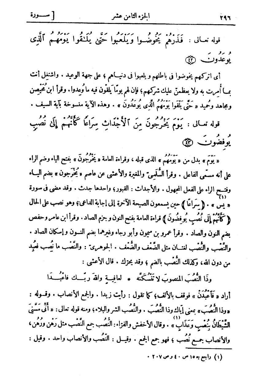 يَوْمَ بَدَلٌ مِنْ يَوْمَهُمُ الَّذِي قَبْلَهُ، وَقِرَاءَةُ الْعَامَّةِ يَخْرُجُونَ بِفَتْحِ الْيَاءِ وَضَمِّ الرَّاءِ عَلَى أَنَّهُ مُسَمَّى الْفَاعِلِ. وَقَرَأَ السُّلَمِيُّ وَالْمُغِيرَةُ وَالْأَعْشَى عَنْ عَاصِمٍ (يُخْرَجُونَ) بِضَمِّ الْيَاءِ وَفَتْحِ الرَّاءِ عَلَى الْفِعْلِ الْمَجْهُولِ. وَالْأَجْدَاثُ: الْقُبُورُ، وَاحِدُهَا جَدَثٌ. وَقَدْ مَضَى فِي سُورَةِ" يس" «١». سِراعاً حِينَ يَسْمَعُونَ الصَّيْحَةَ الْآخِرَةَ إِلَى إِجَابَةِ الدَّاعِي، وَهُوَ نَصْبٌ عَلَى الْحَالِ كَأَنَّهُمْ إِلى نُصُبٍ يُوفِضُونَ قِرَاءَةُ الْعَامَّةِ بِفَتْحِ النُّونِ وَجَزْمِ الصَّادِ. وَقَرَأَ ابْنُ عَامِرٍ وَحَفْصٌ بِضَمِّ النُّونِ وَالصَّادِ. وَقَرَأَ عَمْرُو بْنُ مَيْمُونٍ وَأَبُو رَجَاءٍ وَغَيْرُهُمَا بِضَمِّ النُّونِ وَإِسْكَانِ الصَّادِ. وَالنُّصْبُ وَالنَّصْبُ لُغَتَانِ مِثْلَ الضُّعْفِ، وَالضَّعْفِ. الْجَوْهَرِيُّ: وَالنَّصْبُ مَا نُصِبَ فَعُبِدَ مِنْ دُونِ اللَّهِ، وَكَذَلِكَ النُّصْبُ بِالضَّمِّ، وَقَدْ يُحَرَّكُ. قَالَ الْأَعْشَى: