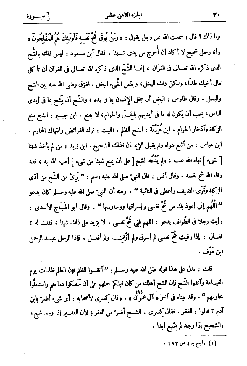 وَمَا ذَاكَ؟ قَالَ: سَمِعْتُ اللَّهَ عَزَّ وَجَلَّ يَقُولُ: وَمَنْ يُوقَ شُحَّ نَفْسِهِ فَأُولئِكَ هُمُ الْمُفْلِحُونَ وَأَنَا رَجُلٌ شَحِيحٌ لَا أَكَادُ أَنْ أُخْرِجَ مِنْ يَدِي شَيْئًا. فَقَالَ ابْنُ مَسْعُودٍ: لَيْسَ ذَلِكَ بِالشُّحِّ الَّذِي ذَكَرَهُ اللَّهُ تَعَالَى فِي الْقُرْآنِ، إِنَّمَا الشُّحُّ الَّذِي ذَكَرَهُ اللَّهُ تَعَالَى فِي الْقُرْآنِ أَنْ تَأْكُلَ مَالَ أَخِيكَ ظُلْمًا، وَلَكِنْ ذَلِكَ الْبُخْلُ، وَبِئْسَ الشَّيْءُ الْبُخْلُ. فَفَرَّقَ رَضِيَ اللَّهُ عَنْهُ بَيْنَ الشُّحِّ وَالْبُخْلِ. وَقَالَ طَاوُسٌ: الْبُخْلُ أَنْ يَبْخَلَ الْإِنْسَانُ بِمَا فِي يَدِهِ، وَالشُّحُّ أَنْ يَشِحَّ بِمَا فِي أَيْدِي النَّاسِ، يُحِبُّ أَنْ يَكُونَ لَهُ مَا فِي أَيْدِيهِمْ بِالْحِلِّ وَالْحَرَامِ، لَا يَقْنَعُ. ابْنُ جُبَيْرٍ: الشُّحُّ مَنْعُ الزَّكَاةِ وَادِّخَارُ الْحَرَامِ. ابْنُ عُيَيْنَةَ: الشُّحُّ الظُّلْمُ. اللَّيْثُ: تَرْكُ الْفَرَائِضِ وَانْتِهَاكُ الْمَحَارِمِ. ابْنُ عَبَّاسٍ: مَنِ اتَّبَعَ هَوَاهُ وَلَمْ يَقْبَلِ الْإِيمَانَ فَذَلِكَ الشَّحِيحُ. ابْنُ زَيْدٍ: مَنْ لَمْ يَأْخُذْ شَيْئًا لِشَيْءٍ نَهَاهُ اللَّهُ عَنْهُ، وَلَمْ يَدَعْهُ الشُّحُّ عَلَى أَنْ يَمْنَعَ شَيْئًا من شي أَمَرَهُ اللَّهُ بِهِ، فَقَدْ وَقَاهُ اللَّهُ شُحَّ نَفْسِهِ. وَقَالَ أَنَسٌ: قَالَ النَّبِيُّ صَلَّى اللَّهُ عَلَيْهِ وَسَلَّمَ: (برئ مِنَ الشُّحِّ مَنْ أَدَّى الزَّكَاةَ وَقَرَى الضَّيْفَ وَأَعْطَى فِي النَّائِبَةِ). وَعَنْهُ أَنَّ النَّبِيَّ صَلَّى اللَّهُ عَلَيْهِ وَسَلَّمَ كَانَ يَدْعُو (اللَّهُمَّ إِنِّي أَعُوَذُ بِكَ مِنْ شُحِّ نَفْسِي وَإِسْرَافِهَا وَوَسَاوِسِهَا). وَقَالَ أَبُو الْهَيَّاجِ الْأَسَدِيُّ: رَأَيْتُ رَجُلًا فِي الطَّوَافِ يَدْعُو: اللَّهُمَّ قِنِي شُحَّ نَفْسِي. لَا يَزِيدُ عَلَى ذَلِكَ شَيْئًا، فَقُلْتُ لَهُ؟ فَقَالَ: إِذَا وُقِيَتُ شُحَّ نَفْسِي لَمْ أَسْرِقْ وَلَمْ أَزْنِ وَلَمْ أَفْعَلْ. فَإِذَا الرَّجُلُ عَبْدُ الرَّحْمَنِ ابن عوف. قلت: يدل على هذا قول صَلَّى اللَّهُ عَلَيْهِ وَسَلَّمَ: (اتَّقُوا الظُّلْمَ فَإِنَّ الظُّلْمَ ظُلُمَاتٍ يَوْمَ الْقِيَامَةِ وَاتَّقُوا الشُّحَّ فَإِنَّ الشُّحَّ أَهْلَكَ مَنْ كَانَ قَبْلَكُمْ حَمَلَهُمْ عَلَى أَنْ سَفَكُوا دِمَاءَهُمْ وَاسْتَحَلُّوا مَحَارِمَهُمْ (. وَقَدْ بَيَّنَّاهُ فِي آخِرِ" آلِ عِمْرَانَ" «١». وَقَالَ كِسْرَى لِأَصْحَابِهِ: أي شي أَضَرُّ بِابْنِ آدَمَ؟ قَالُوا: الْفَقْرُ. فَقَالَ كِسْرَى: الشُّحُّ أَضَرُّ مِنَ الْفَقْرِ، لِأَنَّ الْفَقِيرَ إِذَا وَجَدَ شَبِعَ، وَالشَّحِيحَ إِذَا وَجَدَ لَمْ يَشْبَعْ أبدا.