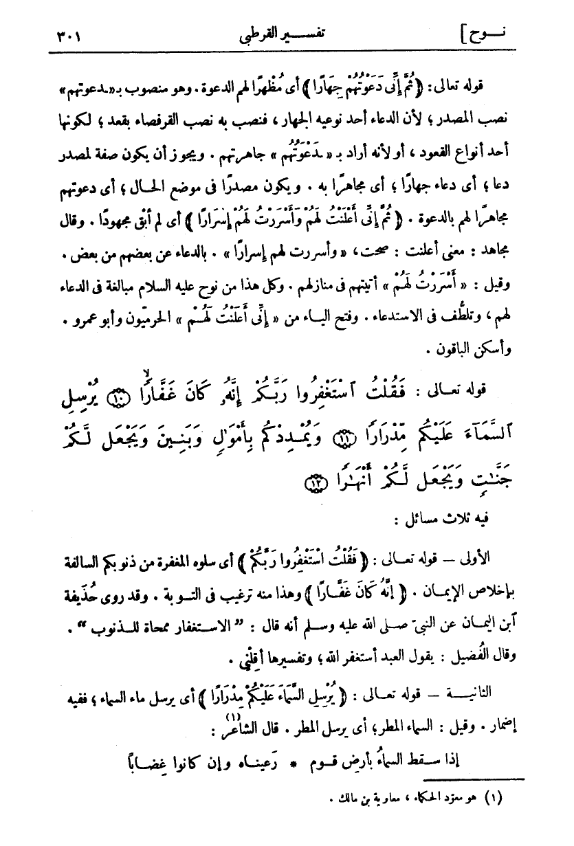 فِيهِ ثَلَاثُ مَسَائِلَ الْأُولَى- قَوْلُهُ تَعَالَى: (فَقُلْتُ اسْتَغْفِرُوا رَبَّكُمْ) أَيْ سَلُوهُ الْمَغْفِرَةَ مِنْ ذُنُوبِكُمُ السَّالِفَةِ بِإِخْلَاصِ الْإِيمَانِ. (إِنَّهُ كانَ غَفَّاراً) وَهَذَا مِنْهُ تَرْغِيبٌ في التوبة. وقد روى حذيفة ابن الْيَمَانِ عَنِ النَّبِيِّ صَلَّى اللَّهُ عَلَيْهِ وَسَلَّمَ أَنَّهُ قَالَ: (الِاسْتِغْفَارُ مِمْحَاةٌ لِلذُّنُوبِ). وَقَالَ الْفُضَيْلُ: يَقُولُ الْعَبْدُ أَسْتَغْفِرُ اللَّهَ، وَتَفْسِيرُهَا أَقِلْنِي. الثَّانِيَةُ- قَوْلُهُ تَعَالَى: (يُرْسِلِ السَّماءَ عَلَيْكُمْ مِدْراراً) أَيْ يُرْسِلْ مَاءَ السَّمَاءِ، فَفِيهِ إِضْمَارٌ. وَقِيلَ: السَّمَاءُ المطر، أي يرسل المطر. قَالَ الشَّاعِرُ: «١»