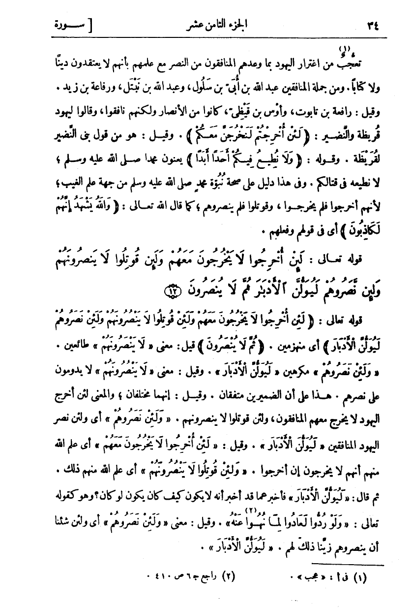 لَئِنْ أُخْرِجُوا لَا يَخْرُجُونَ مَعَهُمْ وَلَئِنْ قُوتِلُوا لَا يَنْصُرُونَهُمْ وَلَئِنْ نَصَرُوهُمْ لَيُوَلُّنَّ الْأَدْبارَ ثُمَّ لَا يُنْصَرُونَ (١٢)