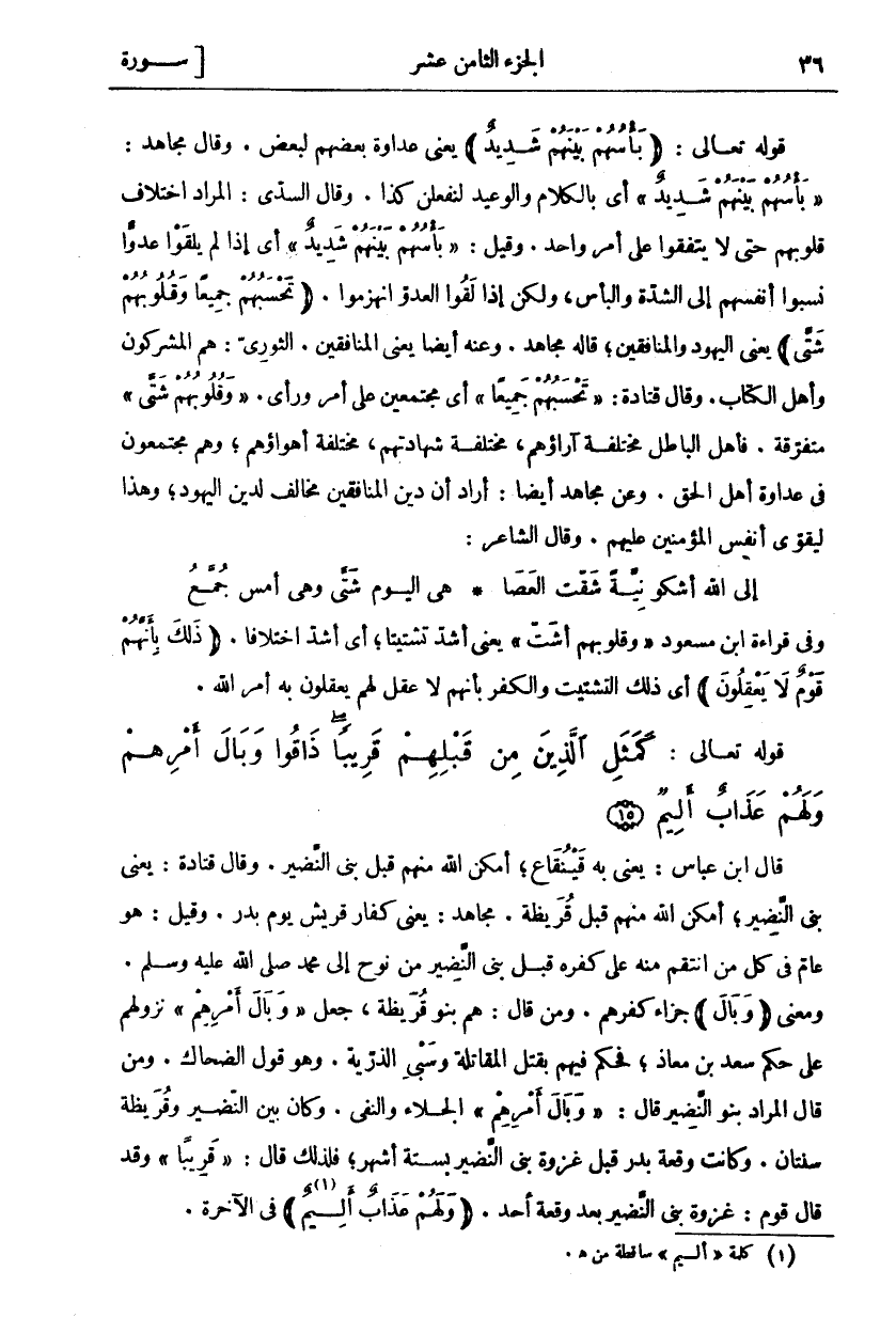 قَوْلُهُ تَعَالَى: (بَأْسُهُمْ بَيْنَهُمْ شَدِيدٌ) يَعْنِي عَدَاوَةَ بَعْضِهِمْ لِبَعْضٍ. وَقَالَ مُجَاهِدٌ: بَأْسُهُمْ بَيْنَهُمْ شَدِيدٌ أَيْ بِالْكَلَامِ وَالْوَعِيدِ لَنَفْعَلَنَّ كَذَا. وَقَالَ السُّدِّيُّ: الْمُرَادُ اخْتِلَافُ قُلُوبِهِمْ حَتَّى لَا يَتَّفِقُوا عَلَى أَمْرٍ وَاحِدٍ. وَقِيلَ: بَأْسُهُمْ بَيْنَهُمْ شَدِيدٌ أَيْ إِذَا لَمْ يَلْقَوْا عَدُوًّا نَسَبُوا أَنْفُسَهُمْ إِلَى الشِّدَّةِ وَالْبَأْسِ، وَلَكِنْ إِذَا لَقُوُا الْعَدُوَّ انْهَزَمُوا. تَحْسَبُهُمْ جَمِيعاً وَقُلُوبُهُمْ شَتَّى يَعْنِي الْيَهُودَ وَالْمُنَافِقِينَ، قَالَهُ مُجَاهِدٌ. وَعَنْهُ أَيْضًا يَعْنِي الْمُنَافِقِينَ. الثَّوْرِيُّ: هُمُ الْمُشْرِكُونَ وَأَهْلُ الْكِتَابِ. وَقَالَ قَتَادَةُ: تَحْسَبُهُمْ جَمِيعاً أَيْ مُجْتَمَعِينَ عَلَى أَمْرٍ وَرَأْيٍ. وَقُلُوبُهُمْ شَتَّى مُتَفَرِّقَةٌ. فَأَهْلٌ الْبَاطِلُ مُخْتَلِفَةٌ آرَاؤُهُمْ، مُخْتَلِفَةٌ شَهَادَتُهُمْ، مُخْتَلِفَةٌ أَهْوَاؤُهُمْ وَهُمْ مُجْتَمِعُونَ فِي عَدَاوَةِ أَهْلِ الْحَقِّ. وَعَنْ مُجَاهِدٍ أَيْضًا: أَرَادَ أَنَّ دِينَ الْمُنَافِقِينَ مُخَالِفٌ لِدِينِ الْيَهُودِ، وَهَذَا لِيُقَوِّيَ أَنْفُسَ الْمُؤْمِنِينَ عَلَيْهِمْ. وَقَالَ الشَّاعِرُ:
