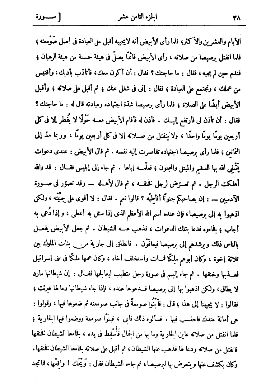الْأَيَّامِ وَالْعِشْرِينَ وَالْأَكْثَرَ، فَلَمَّا رَأَى الْأَبْيَضُ أَنَّهُ لَا يُجِيبُهُ أَقْبَلَ عَلَى الْعِبَادَةِ فِي أَصْلِ صَوْمَعَتِهِ، فَلَمَّا انْفَتَلَ بِرْصِيصَا مِنْ صَلَاتِهِ، رَأَى الْأَبْيَضَ قَائِمًا يُصَلِّي فِي هَيْئَةٍ حَسَنَةٍ مِنْ هَيْئَةِ الرُّهْبَانِ، فَنَدِمَ حِينَ لَمْ يُجِبْهُ، فَقَالَ: مَا حَاجَتُكَ؟ فَقَالَ: أَنْ أَكُونَ مَعَكَ، فَأَتَأَدَّبَ بِأَدَبِكَ، وَأَقْتَبِسَ مِنْ عَمَلِكَ، وَنَجْتَمِعَ عَلَى الْعِبَادَةِ، فَقَالَ: إِنِّي فِي شُغْلٍ عَنْكَ، ثُمَّ أَقْبَلَ عَلَى صَلَاتِهِ، وَأَقْبَلَ الْأَبْيَضُ أَيْضًا عَلَى الصَّلَاةِ، فَلَمَّا رَأَى بِرْصِيصَا شِدَّةَ اجْتِهَادِهِ وَعِبَادَتِهِ قَالَ لَهُ: مَا حَاجَتُكَ؟ فَقَالَ: أَنْ تَأْذَنَ لِي فَأَرْتَفِعَ إِلَيْكَ. فَأَذِنَ لَهُ فَأَقَامَ الْأَبْيَضُ مَعَهُ حَوْلًا لَا يُفْطِرُ إِلَّا فِي كُلِّ أَرْبَعِينَ يَوْمًا يَوْمًا وَاحِدًا، وَلَا يَنْفَتِلُ مِنْ صَلَاتِهِ إِلَّا فِي كُلِّ أَرْبَعِينَ يَوْمًا، وَرُبَّمَا مَدَّ إِلَى الثَّمَانِينَ، فَلَمَّا رَأَى بِرْصِيصَا اجْتِهَادَهُ تَقَاصَرَتْ إِلَيْهِ نَفْسُهُ. ثُمَّ قَالَ الْأَبْيَضُ: عِنْدِي دَعَوَاتٌ يَشْفِي اللَّهُ بِهَا السَّقِيمَ وَالْمُبْتَلَى وَالْمَجْنُونَ، فَعَلَّمَهُ إِيَّاهَا. ثُمَّ جَاءَ إِلَى إِبْلِيسَ فَقَالَ: قَدْ وَاللَّهِ أَهْلَكْتُ الرَّجُلَ. ثُمَّ تَعَرَّضَ لِرَجُلٍ فَخَنَقَهُ، ثُمَّ قَالَ لِأَهْلِهِ- وَقَدْ تَصَوَّرَ فِي صُورَةِ الْآدَمِيِّينَ-: إِنَّ بِصَاحِبِكُمْ جُنُونًا أَفَأَطِبُّهُ؟ قَالُوا نَعَمْ. فَقَالَ: لَا أَقْوَى عَلَى جِنِّيَّتِهِ، وَلَكِنِ اذْهَبُوا بِهِ إِلَى بِرْصِيصَا، فَإِنَّ عِنْدَهُ اسْمُ اللَّهِ الْأَعْظَمِ الَّذِي إِذَا سُئِلَ بِهِ أَعْطَى، وَإِذَا دُعِيَ بِهِ أَجَابَ، فَجَاءُوهُ فَدَعَا بِتِلْكَ الدَّعَوَاتِ، فَذَهَبَ عَنْهُ الشَّيْطَانُ. ثُمَّ جَعَلَ الْأَبْيَضَ يَفْعَلُ بِالنَّاسِ ذَلِكَ وَيُرْشِدُهُمْ إِلَى بِرْصِيصَا فَيُعَافُونَ. فَانْطَلَقَ إِلَى جَارِيَةٍ مِنْ بَنَاتِ الْمُلُوكِ بَيْنَ ثَلَاثَةِ إِخْوَةٍ، وَكَانَ أَبُوهُمْ مَلِكًا فَمَاتَ وَاسْتَخْلَفَ أَخَاهُ، وَكَانَ عَمُّهَا مَلِكًا فِي بَنِي إِسْرَائِيلَ فَعَذَّبَهَا وَخَنَقَهَا. ثُمَّ جَاءَ إِلَيْهِمْ فِي صُورَةِ رَجُلٍ مُتَطَبِّبٍ لِيُعَالِجَهَا فَقَالَ: إِنَّ شَيْطَانَهَا مَارِدٌ لَا يُطَاقُ، وَلَكِنِ اذْهَبُوا بِهَا إِلَى بِرْصِيصَا فَدَعُوهَا عِنْدَهُ، فَإِذَا جَاءَ شَيْطَانُهَا دَعَا لَهَا فَبَرِئَتْ، فَقَالُوا: لَا يُجِيبُنَا إِلَى هَذَا، قَالَ: فَابْنُوا صَوْمَعَةً فِي جَانِبِ صَوْمَعَتِهِ ثُمَّ ضَعُوهَا فِيهَا، وَقُولُوا: هِيَ أَمَانَةٌ عِنْدَكَ فَاحْتَسِبْ فِيهَا. فَسَأَلُوهُ ذَلِكَ فَأَبَى، فَبَنَوْا صَوْمَعَةً وَوَضَعُوا فِيهَا الْجَارِيَةَ، فَلَمَّا انْفَتَلَ مِنْ صَلَاتِهِ عَايَنَ الْجَارِيَةَ وَمَا بِهَا مِنَ الْجَمَالِ فَأُسْقِطَ فِي يَدِهِ، فَجَاءَهَا الشَّيْطَانُ فَخَنَقَهَا فَانْفَتَلَ مِنْ صَلَاتِهِ وَدَعَا لَهَا فَذَهَبَ عَنْهَا الشَّيْطَانُ، ثُمَّ أَقْبَلَ عَلَى صَلَاتِهِ فَجَاءَهَا الشَّيْطَانُ فَخَنَقَهَا. وَكَانَ يَكْشِفُ عَنْهَا وَيَتَعَرَّضُ بِهَا لِبِرْصِيصَا، ثُمَّ جَاءَهُ الشَّيْطَانُ فَقَالَ: وَيْحَكَ! وَاقِعْهَا، فَمَا تَجِدُ