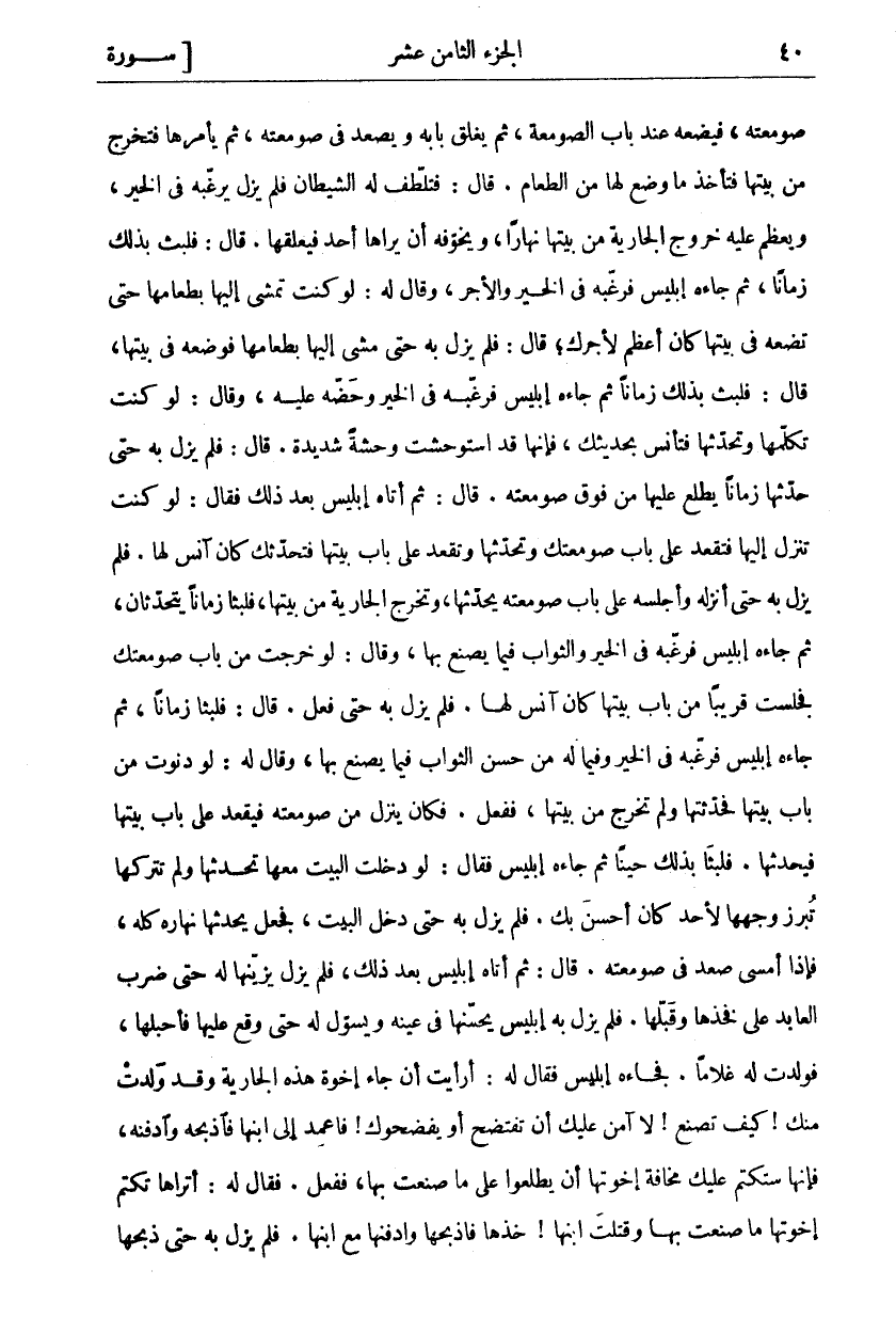 صَوْمَعَتِهِ، فَيَضَعُهُ عِنْدَ بَابِ الصَّوْمَعَةِ، ثُمَّ يُغْلِقُ بَابَهُ وَيَصْعَدُ فِي صَوْمَعَتِهِ، ثُمَّ يَأْمُرُهَا فَتَخْرُجُ مِنْ بَيْتِهَا فَتَأْخُذُ مَا وُضِعَ لَهَا مِنَ الطَّعَامِ. قَالَ: فَتَلَطَّفَ لَهُ الشَّيْطَانُ فَلَمْ يَزَلْ يُرَغِّبُهُ فِي الْخَيْرِ، وَيُعَظِّمُ عَلَيْهِ خُرُوجَ الْجَارِيَةِ مِنْ بَيْتِهَا نَهَارًا، وَيُخَوِّفُهُ أَنْ يَرَاهَا أَحَدٌ فَيَعْلَقَهَا. قَالَ: فَلَبِثَ بِذَلِكَ زَمَانًا، ثُمَّ جَاءَهُ إِبْلِيسُ فَرَغَّبَهُ فِي الْخَيْرِ وَالْأَجْرِ، وَقَالَ لَهُ: لَوْ كُنْتَ تَمْشِي إِلَيْهَا بِطَعَامِهَا حَتَّى تَضَعَهُ فِي بَيْتِهَا كَانَ أَعْظَمَ لِأَجْرِكَ، قَالَ: فَلَمْ يَزَلْ بِهِ حَتَّى مَشَى إِلَيْهَا بِطَعَامِهَا فَوَضَعَهُ في بيتها قال: فلبثت بِذَلِكَ زَمَانًا ثُمَّ جَاءَهُ إِبْلِيسُ فَرَغَّبَهُ فِي الْخَيْرِ وَحَضَّهُ عَلَيْهِ، وَقَالَ: لَوْ كُنْتَ تُكَلِّمُهَا وَتُحَدِّثُهَا فَتَأْنَسُ بِحَدِيثِكَ، فَإِنَّهَا قَدِ اسْتَوْحَشَتْ وَحْشَةً شَدِيدَةً. قَالَ: فَلَمْ يَزَلْ بِهِ حَتَّى حَدَّثَهَا زَمَانًا يَطَّلِعُ عَلَيْهَا مِنْ فَوْقِ صَوْمَعَتِهِ. قَالَ: ثُمَّ أَتَاهُ إِبْلِيسُ بَعْدَ ذَلِكَ فَقَالَ: لَوْ كُنْتَ تَنْزِلُ إِلَيْهَا فَتَقْعُدَ عَلَى بَابِ صَوْمَعَتِكَ وَتُحَدِّثَهَا وَتَقْعُدَ عَلَى بَابِ بَيْتِهَا فَتُحَدِّثَكَ كَانَ آنَسَ لَهَا. فَلَمْ يَزَلْ بِهِ حَتَّى أَنْزَلَهُ وَأَجْلَسَهُ عَلَى بَابِ صَوْمَعَتِهِ يُحَدِّثَهَا، وَتَخْرُجُ الْجَارِيَةُ مِنْ بَيْتِهَا، فَلَبِثَا زَمَانًا يَتَحَدَّثَانِ، ثُمَّ جَاءَهُ إِبْلِيسُ فَرَغَّبَهُ فِي الْخَيْرِ وَالثَّوَابِ فِيمَا يَصْنَعُ بِهَا، وَقَالَ: لَوْ خَرَجْتَ مِنْ بَابِ صَوْمَعَتِكَ فَجَلَسْتَ قَرِيبًا مِنْ بَابِ بَيْتِهَا كَانَ آنَسَ لَهَا. فَلَمْ يَزَلْ بِهِ حَتَّى فَعَلَ. قَالَ: فَلَبِثَا زَمَانًا، ثُمَّ جَاءَهُ إِبْلِيسُ فَرَغَّبَهُ فِي الْخَيْرِ وَفِيمَا لَهُ مِنْ حُسْنِ الثَّوَابِ فِيمَا يَصْنَعُ بِهَا، وَقَالَ لَهُ: لَوْ دَنَوْتَ مِنْ بَابِ بَيْتِهَا فَحَدَّثْتَهَا وَلَمْ تَخْرُجْ مِنْ بَيْتِهَا، فَفَعَلَ. فَكَانَ يَنْزِلُ مِنْ صَوْمَعَتِهِ فَيَقْعُدُ عَلَى بَابِ بَيْتِهَا فَيُحَدِّثُهَا. فَلَبِثَا بِذَلِكَ حِينًا ثُمَّ جَاءَهُ إِبْلِيسُ فَقَالَ: لَوْ دَخَلْتَ الْبَيْتَ مَعَهَا تُحَدِّثَهَا وَلَمْ تَتْرُكْهَا تُبْرِزْ وَجْهَهَا لِأَحَدٍ كَانَ أَحْسَنَ بِكَ. فَلَمْ يَزَلْ بِهِ حَتَّى دَخَلَ الْبَيْتَ، فَجَعَلَ يُحَدِّثُهَا نَهَارَهُ كُلَّهُ، فَإِذَا أَمْسَى صَعِدَ فِي صَوْمَعَتِهِ. قَالَ: ثُمَّ أَتَاهُ إِبْلِيسُ بَعْدَ ذَلِكَ، فَلَمْ يَزَلْ يُزَيِّنُهَا لَهُ حَتَّى ضَرَبَ الْعَابِدَ عَلَى فَخِذِهَا وَقَبَّلَهَا. فَلَمْ يَزَلْ بِهِ إِبْلِيسُ يُحَسِّنُهَا فِي عَيْنِهِ وَيُسَوِّلُ لَهُ حَتَّى وَقَعَ عَلَيْهَا فَأَحْبَلَهَا، فَوَلَدَتْ لَهُ غُلَامًا، فَجَاءَهُ إِبْلِيسُ فَقَالَ لَهُ: أَرَأَيْتَ إِنْ جَاءَ إِخْوَةُ هَذِهِ الْجَارِيَةِ وَقَدْ وَلَدَتْ مِنْكَ! كَيْفَ تَصْنَعُ! لَا آمَنُ عَلَيْكَ أَنْ تَفْتَضِحَ أَوْ يَفْضَحُوكَ! فَاعْمِدْ إِلَى ابْنِهَا فَاذْبَحْهُ وَادْفِنْهُ، فَإِنَّهَا سَتَكْتُمُ عَلَيْكَ مَخَافَةَ إِخْوَتِهَا أَنْ يَطَّلِعُوا عَلَى مَا صَنَعْتَ بِهَا، فَفَعَلَ. فَقَالَ لَهُ: أَتَرَاهَا تَكْتُمُ إِخْوَتَهَا مَا صَنَعْتَ بِهَا وَقَتَلْتَ ابْنَهَا! خُذْهَا فَاذْبَحْهَا وَادْفِنْهَا مَعَ ابْنِهَا. فَلَمْ يَزَلْ بِهِ حَتَّى ذَبَحَهَا