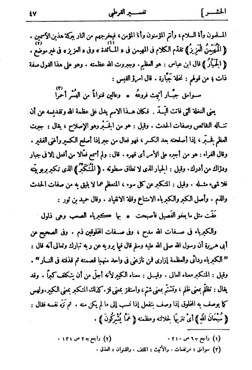 يَعْنِي النَّخْلَةَ الَّتِي فَاتَتِ الْيَدَ. فَكَانَ هَذَا الِاسْمُ يَدُلُّ عَلَى عَظَمَةِ اللَّهِ وَتَقْدِيسِهِ عَنْ أَنْ تَنَالَهُ النَّقَائِصُ وَصِفَاتُ الْحَدَثِ. وَقِيلَ: هُوَ مِنَ الْجَبْرِ وَهُوَ الْإِصْلَاحُ، يُقَالُ: جَبَرْتُ الْعَظْمَ فَجَبَرَ، إِذَا أَصْلَحْتُهُ بَعْدَ الْكَسْرِ، فَهُوَ فَعَّالٌ مِنْ جَبَرَ إِذَا أَصْلَحَ الْكَسِيرَ وَأَغْنَى الْفَقِيرَ. وَقَالَ الْفَرَّاءُ: هُوَ مِنْ أَجْبَرَهُ عَلَى الْأَمْرِ أَيْ قَهَرَهُ. قَالَ: وَلَمْ أَسْمَعْ فَعَّالًا مِنْ أَفْعَلَ إِلَّا فِي جَبَّارٍ وَدَرَّاكٍ مِنْ أَدْرَكَ. وَقِيلَ: الْجَبَّارُ الَّذِي لَا تُطَاقُ سَطْوَتُهُ. (الْمُتَكَبِّرُ) الذي تكبر بربوبيته فلا شي مِثْلَهُ. وَقِيلَ: الْمُتَكَبِّرُ عَنْ كُلِّ سُوءٍ الْمُتَعَظِّمُ عَمَّا لَا يَلِيقُ بِهِ مِنْ صِفَاتِ الْحَدَثِ وَالذَّمِّ. وَأَصْلُ الْكِبْرِ وَالْكِبْرِيَاءِ الِامْتِنَاعُ وَقِلَّةُ الِانْقِيَادِ. وقال حميد بن ثور: