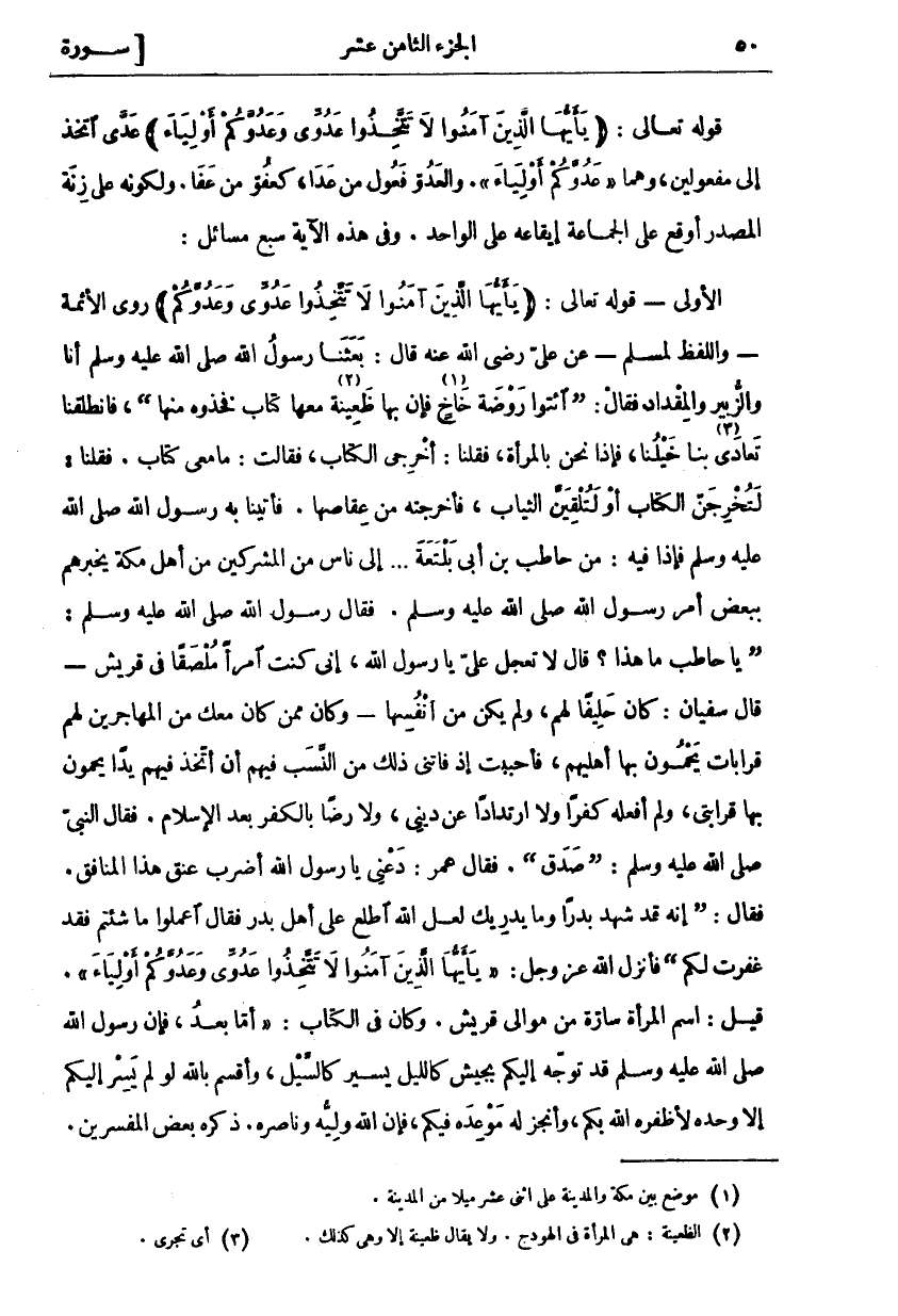 قَوْلُهُ تَعَالَى: (يَا أَيُّهَا الَّذِينَ آمَنُوا لَا تَتَّخِذُوا عَدُوِّي وَعَدُوَّكُمْ أَوْلِياءَ) عَدَّى اتَّخَذَ إِلَى مَفْعُولَيْنِ وَهُمَا عَدُوَّكُمْ أَوْلِياءَ. وَالْعَدُوُّ فَعُولٌ مِنْ عَدَا، كَعَفُوٍّ مِنْ عَفَا. وَلِكَوْنِهِ عَلَى زِنَةِ الْمَصْدَرِ أَوْقَعَ عَلَى الْجَمَاعَةِ إِيقَاعَهُ عَلَى الْوَاحِدِ. وَفِي هَذِهِ الْآيَةِ سَبْعُ مَسَائِلَ: الْأُولَى- قَوْلُهُ تَعَالَى: (يَا أَيُّهَا الَّذِينَ آمَنُوا لَا تَتَّخِذُوا عَدُوِّي وَعَدُوَّكُمْ) رَوَى الْأَئِمَّةُ- وَاللَّفْظُ لِمُسْلِمٍ- عَنْ عَلِيٍّ رَضِيَ اللَّهُ عَنْهُ قَالَ: بَعَثَنَا رَسُولِ اللَّهِ صَلَّى اللَّهُ عَلَيْهِ وَسَلَّمَ أَنَا وَالزُّبَيْرَ وَالْمِقْدَادَ فَقَالَ: (ائْتُوا رَوْضَةَ خَاخٍ «١» فَإِنَّ بِهَا ظَعِينَةً «٢» مَعَهَا كِتَابٌ فَخُذُوهُ مِنْهَا) فَانْطَلَقْنَا تَعَادَى «٣» بِنَا خَيْلُنَا، فَإِذَا نَحْنُ بِالْمَرْأَةِ، فَقُلْنَا: أَخْرِجِي الْكِتَابَ، فَقَالَتْ: مَا مَعِي كِتَابٌ. فَقُلْنَا: لَتُخْرِجِنَّ الْكِتَابَ أَوْ لَتُلْقِيَنَّ الثِّيَابَ، فَأَخْرَجَتْهُ مِنْ عِقَاصِهَا. فَأَتَيْنَا بِهِ رَسُولِ اللَّهِ صَلَّى اللَّهُ عَلَيْهِ وَسَلَّمَ فَإِذَا فِيهِ: مِنْ حَاطِبِ بْنِ أَبِي بَلْتَعَةَ ... إِلَى نَاسٍ مِنَ الْمُشْرِكِينَ مِنْ أَهْلِ مَكَّةَ يُخْبِرُهُمْ بِبَعْضِ أَمَرَ رَسُولُ اللَّهِ صَلَّى اللَّهُ عَلَيْهِ وَسَلَّمَ. فَقَالَ رَسُولُ اللَّهِ صَلَّى اللَّهُ عَلَيْهِ وَسَلَّمَ: (يَا حَاطِبُ مَا هَذَا؟ قَالَ لَا تَعْجَلْ عَلَيَّ يَا رَسُولَ اللَّهِ، إِنِّي كُنْتُ امْرَأً مُلْصَقًا فِي قُرَيْشٍ قَالَ سُفْيَانُ: كَانَ حَلِيفًا لَهُمْ، وَلَمْ يَكُنْ مِنْ أَنْفُسِهَا وَكَانَ مِمَّنْ كَانَ مَعَكَ مِنَ الْمُهَاجِرِينَ لَهُمْ قَرَابَاتٌ يَحْمُونَ بِهَا أَهْلِيهِمْ، فَأَحْبَبْتُ إِذْ فَاتَنِي ذَلِكَ مِنَ النَّسَبِ فِيهِمْ أَنْ أَتَّخِذَ فِيهِمْ يَدًا يَحْمُونَ بِهَا قَرَابَتِي، وَلَمْ أَفْعَلْهُ كُفْرًا وَلَا ارْتِدَادًا عَنْ دِينِي، وَلَا رِضًا بِالْكُفْرِ بَعْدَ الْإِسْلَامِ. فَقَالَ النَّبِيُّ صَلَّى اللَّهُ عَلَيْهِ وَسَلَّمَ: (صَدَقَ). فَقَالَ عُمَرُ: دَعْنِي يَا رَسُولَ اللَّهِ أَضْرِبْ عُنُقَ هَذَا الْمُنَافِقِ. فَقَالَ: (إِنَّهُ قَدْ شَهِدَ بَدْرًا وَمَا يُدْرِيكَ لَعَلَّ اللَّهَ اطَّلَعَ عَلَى أَهْلِ بَدْرٍ فَقَالَ اعْمَلُوا مَا شِئْتُمْ فَقَدْ غَفَرْتُ لَكُمْ) فَأَنْزَلَ اللَّهُ عَزَّ وَجَلَّ: يَا أَيُّهَا الَّذِينَ آمَنُوا لَا تَتَّخِذُوا عَدُوِّي وَعَدُوَّكُمْ أَوْلِياءَ. قِيلَ: اسْمُ الْمَرْأَةِ سَارَّةُ مِنْ مَوَالِي قُرَيْشٍ. وَكَانَ فِي الْكِتَابِ: أَمَّا بَعْدُ، فَإِنَّ رَسُولَ اللَّهِ صَلَّى اللَّهُ عَلَيْهِ وَسَلَّمَ قَدْ تَوَجَّهَ إِلَيْكُمْ بِجَيْشٍ كَاللَّيْلِ يَسِيرُ كَالسَّيْلِ، وَأُقْسِمُ بِاللَّهِ لَوْ لَمْ يَسِرْ إِلَيْكُمْ إِلَّا وَحْدَهُ لَأَظْفَرَهُ اللَّهُ بِكُمْ، وَأَنْجَزَ لَهُ مَوْعِدَهُ فِيكُمْ، فَإِنَّ اللَّهَ وَلِيُّهُ وَنَاصِرُهُ. ذكره بعض المفسرين.