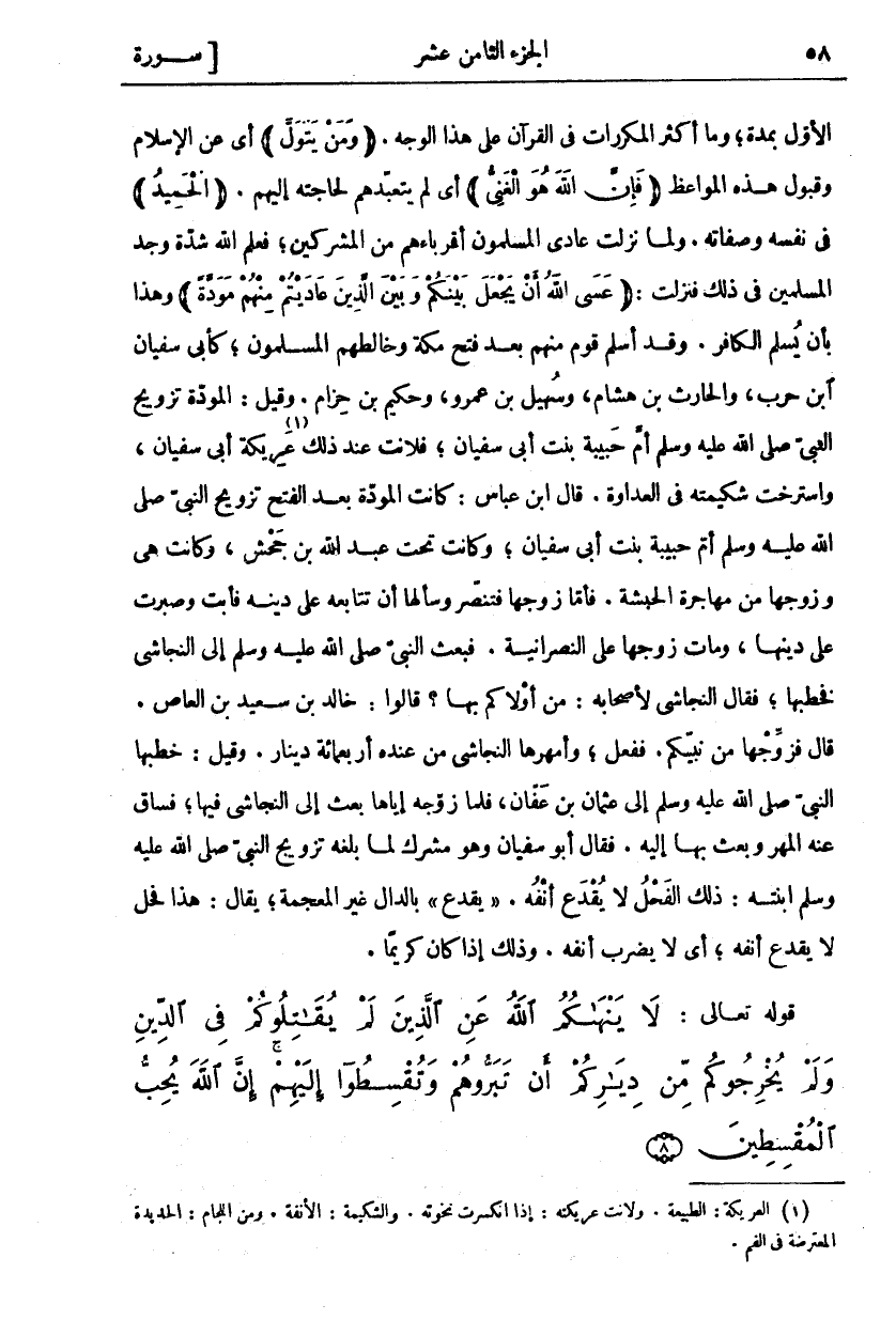 لَا يَنْهاكُمُ اللَّهُ عَنِ الَّذِينَ لَمْ يُقاتِلُوكُمْ فِي الدِّينِ وَلَمْ يُخْرِجُوكُمْ مِنْ دِيارِكُمْ أَنْ تَبَرُّوهُمْ وَتُقْسِطُوا إِلَيْهِمْ إِنَّ اللَّهَ يُحِبُّ الْمُقْسِطِينَ (٨)