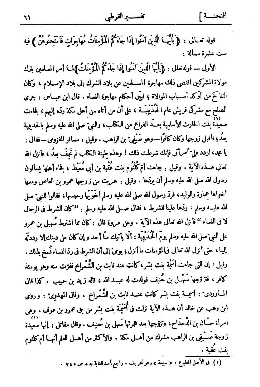 قَوْلُهُ تَعَالَى: (يَا أَيُّهَا الَّذِينَ آمَنُوا إِذا جاءَكُمُ الْمُؤْمِناتُ مُهاجِراتٍ فَامْتَحِنُوهُنَّ) فِيهِ سِتَّ عَشْرَةَ مَسْأَلَةً: الْأُولَى- قَوْلُهُ تَعَالَى: (يَا أَيُّهَا الَّذِينَ آمَنُوا إِذا جاءَكُمُ الْمُؤْمِناتُ) لما أمر المسلمين بترك مولاة الْمُشْرِكِينَ اقْتَضَى ذَلِكَ مُهَاجَرَةَ الْمُسْلِمِينَ عَنْ بِلَادِ الشِّرْكِ إِلَى بِلَادِ الْإِسْلَامِ، وَكَانَ التَّنَاكُحُ مِنْ أَوْكَدِ أَسْبَابِ الْمُوَالَاةِ، فَبَيَّنَ أَحْكَامَ مُهَاجَرَةِ النِّسَاءِ. قَالَ ابْنُ عَبَّاسٍ: جَرَى الصُّلْحُ مَعَ مُشْرِكِي قُرَيْشٍ عَامَ الْحُدَيْبِيَةِ، عَلَى أَنَّ مَنْ أَتَاهُ مِنْ أَهْلِ مَكَّةَ رَدَّهُ إِلَيْهِمْ، فَجَاءَتْ سَعِيدَةُ «١» بِنْتُ الْحَارِثِ الْأَسْلَمِيَّةُ بَعْدَ الْفَرَاغِ مِنَ الْكِتَابِ، وَالنَّبِيُّ صَلَّى اللَّهُ عَلَيْهِ وَسَلَّمَ بِالْحُدَيْبِيَةِ بَعْدُ، فَأَقْبَلَ زَوْجُهَا وَكَانَ كَافِرًا- وَهُوَ صَيْفِيُّ بْنُ الرَّاهِبِ. وَقِيلَ: مُسَافِرٌ الْمَخْزُومِيُّ- فَقَالَ: يَا مُحَمَّدُ، ارْدُدْ عَلَيَّ امْرَأَتِي فَإِنَّكَ شَرَطْتَ ذَلِكَ! وَهَذِهِ طِينَةُ الْكِتَابِ لَمْ تَجِفَّ بَعْدُ، فَأَنْزَلَ اللَّهُ تَعَالَى هَذِهِ الْآيَةَ. وَقِيلَ: جَاءَتْ أُمِّ كُلْثُومٍ بِنْتِ عُقْبَةَ بْنِ أَبِي مُعَيْطٍ، فَجَاءَ أَهْلُهَا يَسْأَلُونَ رَسُولَ اللَّهِ صَلَّى اللَّهُ عَلَيْهِ وَسَلَّمَ أَنْ يَرُدَّهَا. وَقِيلَ: هَرَبَتْ مِنْ زَوْجِهَا عَمْرِو بْنِ الْعَاصِ وَمَعَهَا أَخَوَاهَا عُمَارَةُ وَالْوَلِيدُ، فَرَدَّ رَسُولُ اللَّهِ صَلَّى اللَّهُ عَلَيْهِ وَسَلَّمَ أَخَوَيْهَا وَحَبَسَهَا، فَقَالُوا لِلنَّبِيِّ صَلَّى اللَّهُ عَلَيْهِ وَسَلَّمَ، رُدَّهَا عَلَيْنَا لِلشَّرْطِ، فَقَالَ صَلَّى اللَّهُ عَلَيْهِ وَسَلَّمَ: (كَانَ الشَّرْطُ فِي الرِّجَالِ لَا فِي النِّسَاءِ) فَأَنْزَلَ اللَّهُ تَعَالَى هَذِهِ الْآيَةَ. وَعَنْ عُرْوَةَ قَالَ: كَانَ مِمَّا اشْتَرَطَ سُهَيْلُ بْنُ عَمْرٍو عَلَى النَّبِيِّ صَلَّى اللَّهُ عَلَيْهِ وَسَلَّمَ يَوْمَ الْحُدَيْبِيَةِ: أَلَّا يَأْتِيَكَ مِنَّا أَحَدٌ وَإِنْ كَانَ عَلَى دِينِكَ إِلَّا رَدَدْتَهُ إِلَيْنَا، حَتَّى أَنْزَلَ اللَّهُ تَعَالَى فِي الْمُؤْمِنَاتِ مَا أَنْزَلَ، يُومِئُ إِلَى أَنَّ الشَّرْطَ فِي رَدِّ النِّسَاءِ نُسِخَ بِذَلِكَ. وَقِيلَ إِنَّ الَّتِي جَاءَتْ أُمَيْمَةُ بِنْتُ بِشْرٍ، كَانَتْ عِنْدَ ثَابِتِ بْنِ الشِّمْرَاخِ فَفَرَّتْ مِنْهُ وَهُوَ يَوْمَئِذٍ كَافِرٌ، فَتَزَوَّجَهَا سَهْلُ بن حنيف فولدت له عبد الله، قاله زَيْدُ بْنُ حَبِيبٍ. كَذَا قَالَ الْمَاوَرْدِيُّ: أُمَيْمَةُ بِنْتُ بِشْرٍ كَانَتْ عِنْدَ ثَابِتِ بْنِ الشِّمْرَاخِ. وَقَالَ الْمَهْدَوِيُّ: وَرَوَى ابْنُ وَهْبٍ عَنْ خَالِدٍ أَنَّ هَذِهِ الْآيَةَ نَزَلَتْ فِي أُمَيْمَةَ بِنْتِ بِشْرٍ مِنْ بَنِي عَمْرِو بْنِ عَوْفٍ. وَهِيَ امْرَأَةُ حَسَّانَ بْنِ الدَّحْدَاحِ، وَتَزَوَّجَهَا بَعْدَ هِجْرَتِهَا سَهْلُ بْنُ حُنَيْفٍ. وَقَالَ مُقَاتِلٌ: إِنَّهَا سَعِيدَةُ «٢» زَوْجَةُ صَيْفِيِّ بْنِ الرَّاهِبِ مُشْرِكٍ مِنْ أَهْلِ مَكَّةَ. وَالْأَكْثَرُ مِنْ أَهْلِ الْعِلْمِ أَنَّهَا أُمُّ كلثوم بنت عقبة.