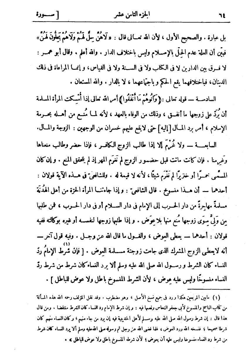 (١). ما بين المربعين هكذا ورد في جميع نسخ الأصل، وهو مضطرب. وقد نقل المؤلف رحمه الله هذه المسألة من كتاب الناسخ والمنسوخ لابي جعفر النحاس ونصها فيه: وإن شرط الامام رد النساء كان الشرط متنقضا. ومن قال هذا قال: إن شرط رَسُولُ اللَّهِ صَلَّى اللَّهُ عَلَيْهِ وَسَلَّمَ لِأَهْلِ الحديبية فيه إن يرد من جاء منهم، وكان النساء منهم كان شرطا صحيحا، فنسخه الله ورد العوض، فلما قضى الله عز وجل ثم رسوله صَلَّى اللَّهُ عَلَيْهِ وَسَلَّمَ أَلَّا يُرَدَّ النِّسَاءَ كان شرط شرط رد النساء منسوخا وليس عليه أن يعوض، لان شرطه المنسوخ باطل ولا عوض الباطل".