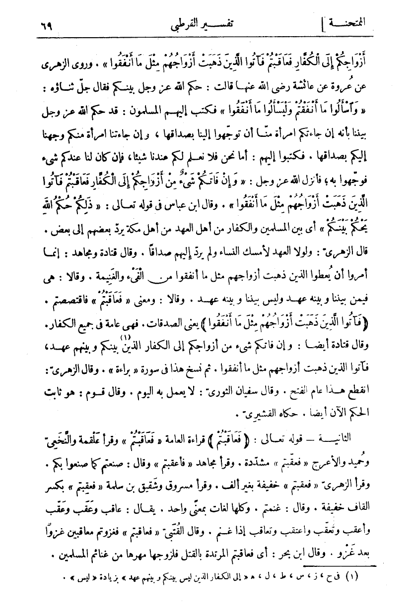 أَزْواجِكُمْ إِلَى الْكُفَّارِ فَعاقَبْتُمْ فَآتُوا الَّذِينَ ذَهَبَتْ أَزْواجُهُمْ مِثْلَ مَا أَنْفَقُوا. وَرَوَى الزُّهْرِيِّ عَنْ عُرْوَةَ عَنْ عَائِشَةَ رَضِيَ اللَّهُ عَنْهَا قَالَتْ: حَكَمَ اللَّهُ عَزَّ وَجَلَّ بَيْنَكُمْ فَقَالَ جَلَّ ثناؤه: وَسْئَلُوا ما أَنْفَقْتُمْ وَلْيَسْئَلُوا مَا أَنْفَقُوا فَكَتَبَ إِلَيْهِمُ الْمُسْلِمُونَ: قَدْ حَكَمَ اللَّهُ عَزَّ وَجَلَّ بَيْنَنَا بِأَنَّهُ إِنْ جَاءَتْكُمُ امْرَأَةٌ مِنَّا أَنْ تُوَجِّهُوا إِلَيْنَا بِصَدَاقِهَا، وَإِنْ جَاءَتْنَا امْرَأَةٌ مِنْكُمْ وَجَّهْنَا إِلَيْكُمْ بِصَدَاقِهَا. فَكَتَبُوا إِلَيْهِمْ: أَمَّا نَحْنُ فَلَا نَعْلَمُ لَكُمْ عِنْدَنَا شيئا، فإن كان لنا عندكم شي فَوَجِّهُوا بِهِ، فَأَنْزَلَ اللَّهُ عَزَّ وَجَلَّ: وَإِنْ فاتَكُمْ شَيْءٌ مِنْ أَزْواجِكُمْ إِلَى الْكُفَّارِ فَعاقَبْتُمْ فَآتُوا الَّذِينَ ذَهَبَتْ أَزْواجُهُمْ مِثْلَ مَا أَنْفَقُوا
