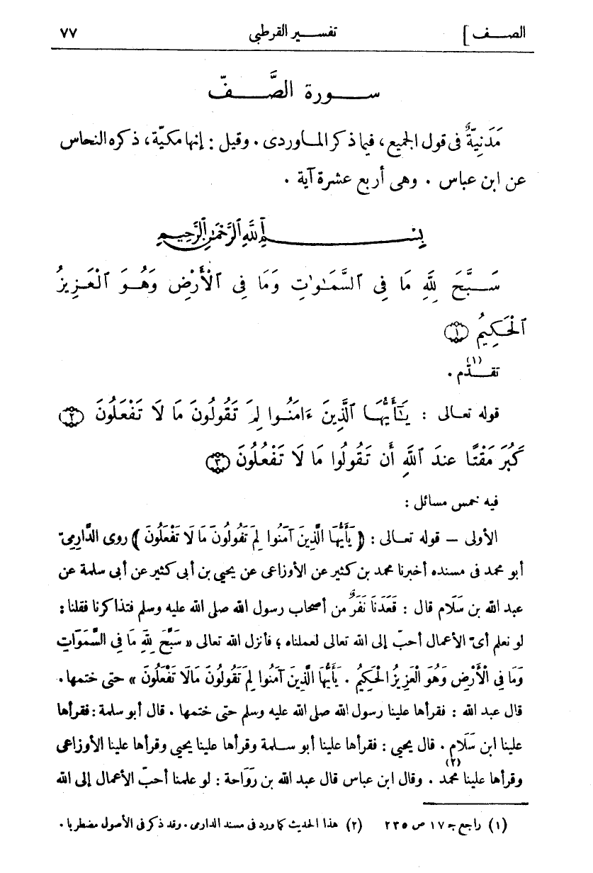 فِيهِ خَمْسُ مَسَائِلَ: الْأُولَى- قَوْلُهُ تَعَالَى: (يَا أَيُّهَا الَّذِينَ آمَنُوا لِمَ تَقُولُونَ مَا لَا تَفْعَلُونَ) رَوَى الدَّارِمِيُّ أَبُو مُحَمَّدٍ فِي مُسْنَدِهِ أَخْبَرَنَا مُحَمَّدُ بْنُ كَثِيرٍ عَنِ الْأَوْزَاعِيِّ عَنْ يَحْيَى بْنِ أَبِي كَثِيرٍ عَنْ أَبِي سَلَمَةَ عَنْ عَبْدِ اللَّهِ بْنِ سَلَامٍ قَالَ: قَعَدْنَا نَفَرٌ مِنْ أَصْحَابِ رَسُولِ اللَّهِ صَلَّى اللَّهُ عَلَيْهِ وَسَلَّمَ فَتَذَاكَرْنَا فَقُلْنَا: لَوْ نَعْلَمُ أَيَّ الْأَعْمَالِ أَحَبَّ إِلَى اللَّهِ تَعَالَى لَعَمِلْنَاهُ، فَأَنْزَلَ اللَّهُ تَعَالَى: سَبَّحَ لِلَّهِ مَا فِي السَّماواتِ وَما فِي الْأَرْضِ وَهُوَ الْعَزِيزُ الْحَكِيمُ يَا أَيُّهَا الَّذِينَ آمَنُوا لِمَ تَقُولُونَ مَا لَا تَفْعَلُونَ حَتَّى خَتَمَهَا. قَالَ عَبْدُ اللَّهِ: فَقَرَأَهَا عَلَيْنَا رَسُولُ اللَّهِ صَلَّى اللَّهُ عَلَيْهِ وَسَلَّمَ حَتَّى خَتَمَهَا. قَالَ أَبُو سَلَمَةَ: فَقَرَأَهَا عَلَيْنَا ابْنُ سَلَامٍ. قَالَ يَحْيَى: فَقَرَأَهَا عَلَيْنَا أَبُو سَلَمَةَ وَقَرَأَهَا عَلَيْنَا يَحْيَى وَقَرَأَهَا عَلَيْنَا الْأَوْزَاعِيُّ وَقَرَأَهَا عَلَيْنَا «٢» مُحَمَّدٌ. وَقَالَ ابْنُ عَبَّاسٍ قَالَ عَبْدُ اللَّهِ بْنُ رَوَاحَةَ: لَوْ عَلِمْنَا أَحَبَّ الْأَعْمَالَ إِلَى اللَّهِ