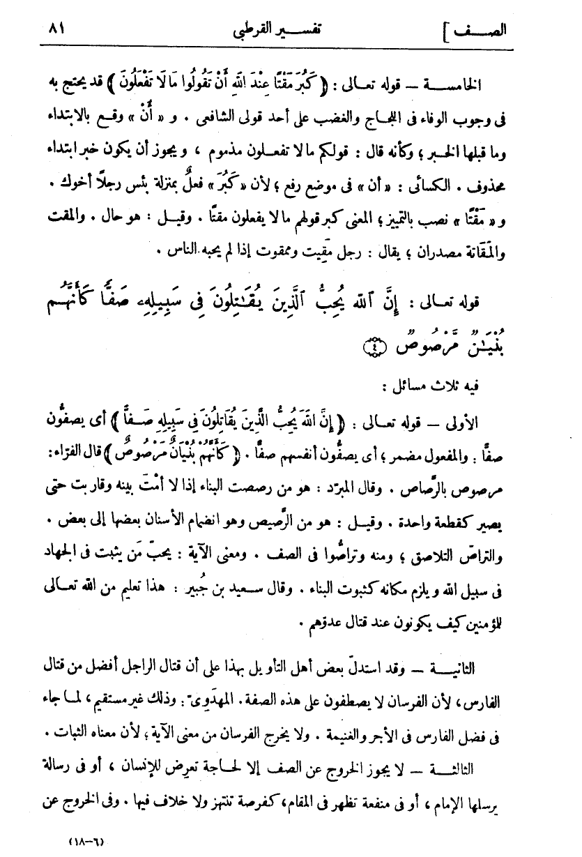 فِيهِ ثَلَاثُ مَسَائِلَ: الْأُولَى- قَوْلُهُ تَعَالَى: (إِنَّ اللَّهَ يُحِبُّ الَّذِينَ يُقاتِلُونَ فِي سَبِيلِهِ صَفًّا) أَيْ يَصُفُّونَ صَفًّا: وَالْمَفْعُولُ مُضْمَرٌ، أَيْ يَصُفُّونَ أَنْفُسَهُمْ صَفًّا. (كَأَنَّهُمْ بُنْيانٌ مَرْصُوصٌ) قَالَ الْفَرَّاءُ: مَرْصُوصٌ بِالرَّصَاصِ. وَقَالَ المبرد: هو من رصصت البناء إذا لاءمت بَيْنَهُ وَقَارَبْتَ حَتَّى يَصِيرَ كَقِطْعَةٍ وَاحِدَةٍ. وَقِيلَ: هُوَ مِنَ الرَّصِيصِ وَهُوَ انْضِمَامُ الْأَسْنَانِ بَعْضُهَا إِلَى بَعْضٍ. وَالتَّرَاصُّ التَّلَاصُقُ، وَمِنْهُ وَتَرَاصُّوا فِي الصَّفِّ. وَمَعْنَى الْآيَةِ: يُحِبُّ مَنْ يَثْبُتُ فِي الْجِهَادِ فِي سَبِيلِ اللَّهِ وَيَلْزَمُ مَكَانَهُ كَثُبُوتِ الْبِنَاءِ. وَقَالَ سَعِيدُ بْنُ جُبَيْرٍ: هَذَا تَعْلِيمٌ مِنَ اللَّهِ تَعَالَى لِلْمُؤْمِنِينَ كَيْفَ يَكُونُونَ عِنْدَ قِتَالِ عَدُوِّهِمْ. الثَّانِيَةُ- وَقَدِ اسْتَدَلَّ بَعْضُ أَهْلِ التَّأْوِيلِ بِهَذَا عَلَى أَنَّ قِتَالَ الرَّاجِلِ أَفْضَلُ مِنْ قِتَالِ الْفَارِسِ، لِأَنَّ الْفُرْسَانَ لَا يَصْطَفُّونَ عَلَى هَذِهِ الصِّفَةِ. الْمَهْدَوِيُّ: وَذَلِكَ غَيْرُ مُسْتَقِيمٍ، لِمَا جَاءَ فِي فَضْلِ الْفَارِسِ فِي الْأَجْرِ وَالْغَنِيمَةِ. وَلَا يَخْرُجُ الْفُرْسَانُ مِنْ مَعْنَى الْآيَةِ، لِأَنَّ مَعْنَاهُ الثَّبَاتُ. الثَّالِثَةُ- لَا يَجُوزُ الْخُرُوجُ عَنِ الصَّفِّ إِلَّا لِحَاجَةٍ تَعْرِضُ لِلْإِنْسَانِ، أَوْ فِي رِسَالَةٍ يُرْسِلُهَا الْإِمَامُ، أَوْ فِي مَنْفَعَةٍ تَظْهَرُ فِي الْمَقَامِ، كَفُرْصَةٍ تُنْتَهَزُ وَلَا خِلَافَ فِيهَا. وَفِي الْخُرُوجِ عَنِ