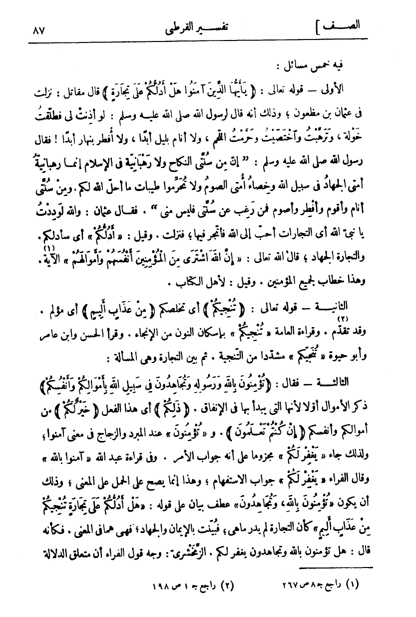 فِيهِ خَمْسُ مَسَائِلَ: الْأُولَى- قَوْلُهُ تَعَالَى: (يَا أَيُّهَا الَّذِينَ آمَنُوا هَلْ أَدُلُّكُمْ عَلى تِجارَةٍ) قَالَ مُقَاتِلٌ: نَزَلَتْ فِي عُثْمَانَ بْنِ مَظْعُونٍ، وَذَلِكَ أَنَّهُ قَالَ لِرَسُولِ اللَّهِ صَلَّى اللَّهُ عَلَيْهِ وَسَلَّمَ: لَوْ أَذِنْتَ لِي فَطَلَّقْتُ خَوْلَةَ، وَتَرَهَّبْتُ وَاخْتَصَيْتُ وَحَرَّمْتُ اللَّحْمَ، وَلَا أَنَامُ بِلَيْلٍ أَبَدًا، وَلَا أُفْطِرُ بِنَهَارٍ أَبَدًا! فَقَالَ رَسُولُ اللَّهِ صَلَّى اللَّهُ عَلَيْهِ وَسَلَّمَ: (إِنَّ مِنْ سُنَّتِي النِّكَاحَ وَلَا رَهْبَانِيَّةَ فِي الْإِسْلَامِ إِنَّمَا رَهْبَانِيَّةُ أُمَّتِي الْجِهَادُ فِي سَبِيلِ اللَّهِ وَخِصَاءُ أُمَّتِي الصَّوْمُ وَلَا تُحَرِّمُوا طَيِّبَاتِ مَا أَحَلَّ اللَّهُ لَكُمْ. وَمِنْ سُنَّتِي أَنَامُ وَأَقُومُ وَأُفْطِرُ وَأَصُومُ فَمَنْ رَغِبَ عَنْ سُنَّتِي فَلَيْسَ مِنِّي (. فَقَالَ عُثْمَانُ: وَاللَّهِ لَوَدِدْتُ يَا نَبِيَّ اللَّهِ أَيَّ التِّجَارَاتِ أَحَبَّ إِلَى اللَّهِ فَأَتَّجِرَ فِيهَا، فَنَزَلَتْ. وَقِيلَ: أَدُلُّكُمْ أَيْ سَأَدُلُّكُمْ. وَالتِّجَارَةُ الْجِهَادُ، قَالَ اللَّهُ تَعَالَى: إِنَّ اللَّهَ اشْتَرى مِنَ الْمُؤْمِنِينَ أَنْفُسَهُمْ وَأَمْوالَهُمْ [التوبة: ١١١] الْآيَةَ «١». وَهَذَا خِطَابٌ لِجَمِيعِ الْمُؤْمِنِينَ. وَقِيلَ: لِأَهْلِ الكتاب. الثانية- قوله تعالى: (تُنْجِيكُمْ) أي تخلصكم (مِنْ عَذابٍ أَلِيمٍ) أي مؤلم. وقد تقدم «٢». وَقِرَاءَةُ الْعَامَّةِ تُنْجِيكُمْ بِإِسْكَانِ النُّونِ مِنَ الْإِنْجَاءِ. وقرا الحسن وابن عامر أبو حَيْوَةَ (تُنَجِّيكُمْ) مُشَدَّدًا مِنَ التَّنْجِيَةِ. ثُمَّ بَيَّنَ التِّجَارَةَ وَهِيَ الْمَسْأَلَةُ: الثَّالِثَةُ- فَقَالَ: (تُؤْمِنُونَ بِاللَّهِ وَرَسُولِهِ وَتُجاهِدُونَ فِي سَبِيلِ اللَّهِ بِأَمْوالِكُمْ وَأَنْفُسِكُمْ) ذَكَرَ الْأَمْوَالَ أَوَّلًا لِأَنَّهَا الَّتِي يُبْدَأُ بِهَا في الإنفاق. (ذلِكُمْ) أي هذا الفعل (خَيْرٌ لَكُمْ) / ١١ من أموالكم وأنفسكم (إِنْ كُنْتُمْ تَعْلَمُونَ). وتُؤْمِنُونَ عِنْدَ الْمُبَرِّدِ وَالزَّجَّاجِ فِي مَعْنَى آمِنُوا، وَلِذَلِكَ جَاءَ يَغْفِرْ لَكُمْ مَجْزُومًا عَلَى أَنَّهُ جَوَابُ الْأَمْرِ. وَفِي قِرَاءَةِ عَبْدِ اللَّهِ (آمَنُوا بِاللَّهِ) وَقَالَ الْفَرَّاءُ يَغْفِرْ لَكُمْ جَوَابُ الِاسْتِفْهَامِ، وَهَذَا إِنَّمَا يَصِحُّ عَلَى الْحَمْلِ عَلَى الْمَعْنَى، وَذَلِكَ أن يكون تُؤْمِنُونَ بِاللَّهِ وَرَسُولِهِ وَتُجاهِدُونَ عَطْفَ بَيَانٍ عَلَى قَوْلِهِ: هَلْ أَدُلُّكُمْ عَلى تِجارَةٍ تُنْجِيكُمْ مِنْ عَذابٍ أَلِيمٍ كَأَنَّ التِّجَارَةَ لَمْ يُدْرَ مَا هِيَ، فَبُيِّنَتْ بِالْإِيمَانِ وَالْجِهَادِ، فَهِيَ هُمَا فِي الْمَعْنَى. فَكَأَنَّهُ قَالَ: هَلْ تُؤْمِنُونَ بِاللَّهِ وَتُجَاهِدُونَ يَغْفِرْ لَكُمْ. الزَّمَخْشَرِيُّ: وجه قول الفراء أن متعلق الدلالة