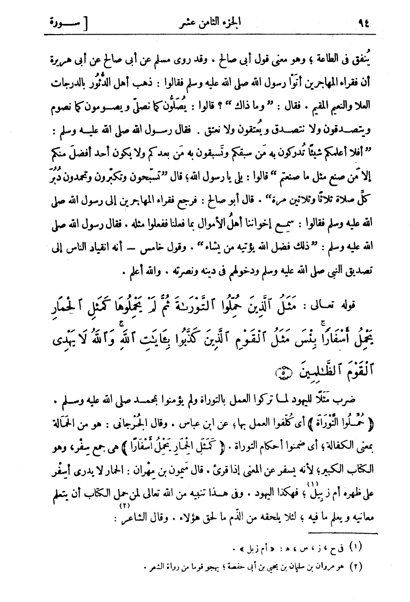ضَرَبَ مَثَلًا لِلْيَهُودِ لَمَّا تَرَكُوا الْعَمَلَ بِالتَّوْرَاةِ وَلَمْ يُؤْمِنُوا بِمُحَمَّدٍ صَلَّى اللَّهُ عَلَيْهِ وَسَلَّمَ. حُمِّلُوا التَّوْراةَ أَيْ كُلِّفُوا الْعَمَلَ بِهَا، عَنِ ابْنِ عَبَّاسٍ. وَقَالَ الْجُرْجَانِيُّ: هُوَ مِنَ الْحَمَالَةِ بِمَعْنَى الْكَفَالَةِ، أَيْ ضَمِنُوا أَحْكَامَ التَّوْرَاةِ. (كَمَثَلِ الْحِمارِ يَحْمِلُ أَسْفاراً) هِيَ جَمْعُ سِفْرٍ، وَهُوَ الْكِتَابُ الْكَبِيرُ، لِأَنَّهُ يُسْفِرُ عَنِ الْمَعْنَى إِذَا قُرِئَ. قَالَ مَيْمُونُ بْنُ مِهْرَانَ: الْحِمَارُ لَا يَدْرِي أَسِفْرٌ عَلَى ظَهْرِهِ أَمْ زبيل، «١» فَهَكَذَا الْيَهُودُ. وَفِي هَذَا تَنْبِيهٌ مِنَ اللَّهِ تَعَالَى لِمَنْ حَمَلَ الْكِتَابَ أَنْ يَتَعَلَّمَ مَعَانِيَهُ وَيَعْلَمَ مَا فِيهِ، لِئَلَّا يَلْحَقَهُ مِنَ الذَّمِّ ما لحق هؤلاء. وقال الشاعر: «٢»