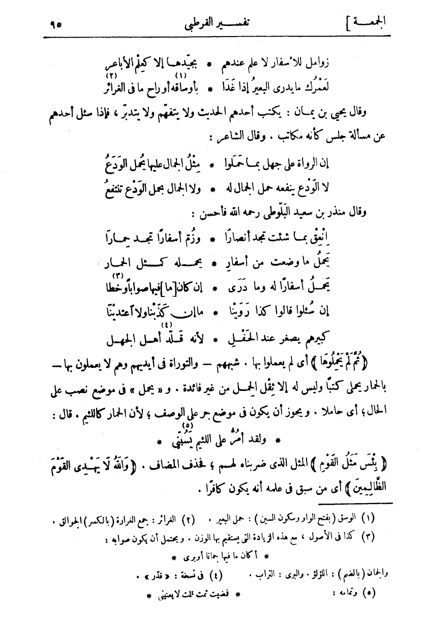 ثُمَّ لَمْ يَحْمِلُوها أَيْ لَمْ يَعْمَلُوا بِهَا. شَبَّهَهُمْ- وَالتَّوْرَاةُ فِي أَيْدِيهِمْ وَهُمْ لَا يَعْمَلُونَ بِهَا- بِالْحِمَارِ يَحْمِلُ كُتُبًا وَلَيْسَ لَهُ إِلَّا ثِقْلُ الْحَمْلِ مِنْ غير فائدة. ويَحْمِلُ فِي مَوْضِعِ نَصْبٍ عَلَى الْحَالِ، أَيْ حَامِلًا. وَيَجُوزُ أَنْ يَكُونَ فِي مَوْضِعِ جَرٍّ عَلَى الْوَصْفِ، لِأَنَّ الْحِمَارَ كَاللَّئِيمِ. قَالَ: