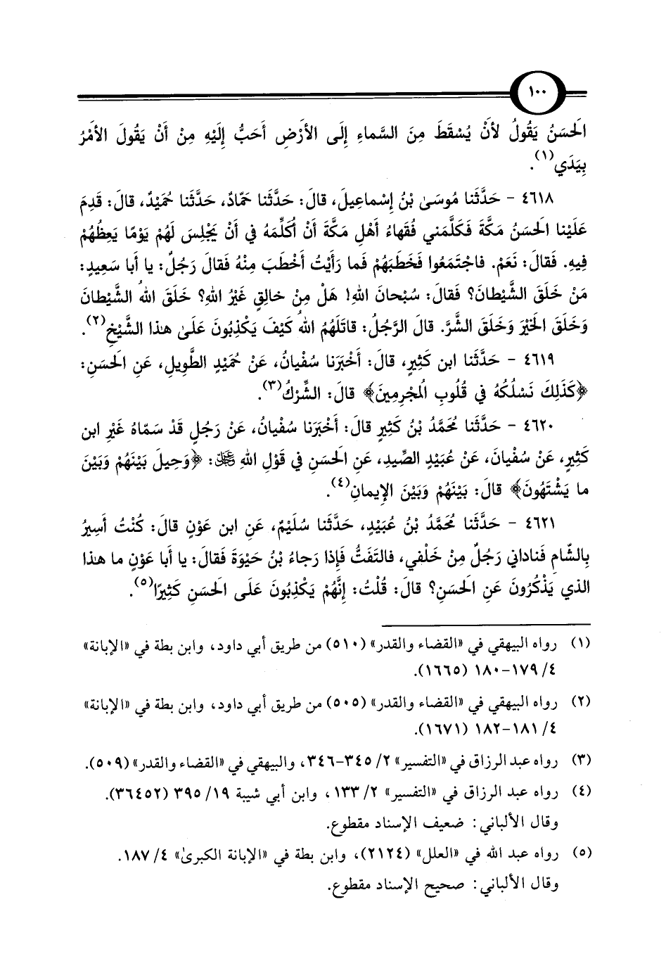 4618 - حَدَّثَنا مُوسَى بْن إِسْماعِيلَ، قالَ: حَدَّثَنا حَمّادٌ، حَدَّثَنا حُمَيْدٌ، قالَ: قَدِمَ عَلَيْنا الحَسَنُ مَكَّةَ فَكَلَّمَني فُقَهاءُ أَهْلِ مَكَّةَ أَنْ أُكَلِّمَهُ في أَنْ يَجْلِسَ لَهُمْ يوْمًا يَعِظُهُمْ فِيهِ. فَقالَ: نَعَمْ. فاجْتَمَعُوا فَخَطَبَهُمْ فَما رَأَيْتُ أَخْطَبَ مِنْة فَقالَ رَجُلٌ: يا أَبا سَعِيدٍ: مَنْ خَلَقَ الشَّيْطانَ؟ فَقالَ: سُبْحانَ اللَّهِ! هَلْ مِنْ خالِقٍ غَيْرُ اللَّهِ؟ خَلَقَ اللَّهُ الشَّيْطانَ وَخَلَقَ الخَيْرَ وَخَلَقَ الشَّرَّ. قالَ الرَّجُلُ: قاتَلَهُمُ اللَّهُ كَيفَ يَكْذِبُونَ عَلَى هذا الشَّيْخِ (¬2).