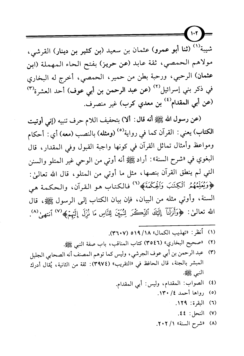 (عن رسول اللَّه -صلى اللَّه عليه وسلم- أنه قال: ألا) بتحفيف اللام حرف تنبيه (إني أوتيت الكتاب) يعني: القرآن كما في رواية (¬5) (ومثله) بالنصب (معه) أي: أحكام ومواعظ وأمثال تماثل القرآن في كونها واجبة القبول وفي المقدار، قال البغوي في "شرح السنة": أراد -صلى اللَّه عليه وسلم- أنه أوتي من الوحي غير المتلو والسنن التي لم ينطق القرآن بنصها، مثل ما أوتي من المتلو، قال اللَّه تعالى: {وَيُعَلِّمُهُ الْكِتَابَ وَالْحِكْمَةَ} (¬6) فالكتاب هو القرآن، والحكمة هي السنة، وأوتي مثله من البيان، فإن بيان الكتاب إلى الرسول -صلى اللَّه عليه وسلم-، قال اللَّه تعالى: {وَأَنْزَلْنَا إِلَيْكَ الذِّكْرَ لِتُبَيِّنَ لِلنَّاسِ مَا نُزِّلَ إِلَيْهِمْ} (¬7) انتهى (¬8).