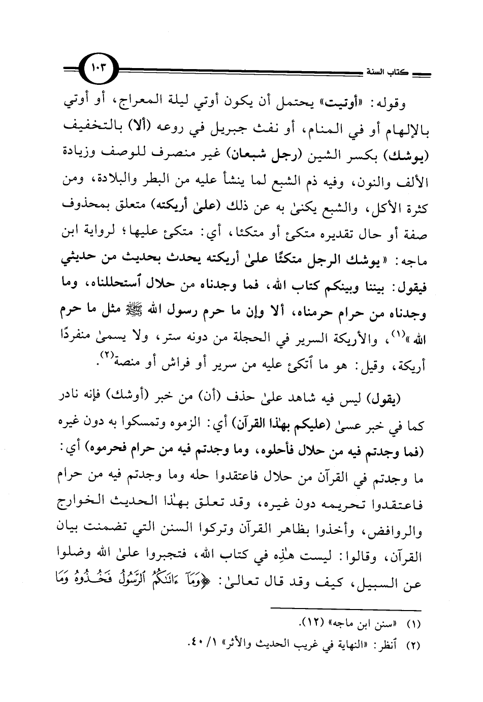 وقوله: "أوتيت" يحتمل أن يكون أوتي ليلة المعراج، أو أوتي بالإلهام أو في المنام، أو نفث جبريل في روعه (ألا) بالتخفيف (يوشك) بكسر الشين (رجل شبعان) غير منصرف للوصف وزيادة الألف والنون، وفيه ذم الشبع لما ينشأ عليه من البطر والبلادة، ومن كثرة الأكل، والشبع يكنى به عن ذلك (على أريكته) متعلق بمحذوف صفة أو حال تقديره متكئ أو متكئا، أي: متكئ عليها؛ لرواية ابن ماجه: "يوشك الرجل متكئًا على أريكته يحدث بحديث من حديثي فيقول: بيننا وبينكم كتاب اللَّه، فما وجدناه من حلال استحللناه، وما وجدناه من حرام حرمناه، ألا وإن ما حرم رسول اللَّه -صلى اللَّه عليه وسلم- مثل ما حرم اللَّه" (¬1)، والأريكة السرير في الحجلة من دونه ستر، ولا يسمى منفردًا أريكة، وقيل: هو ما اتكئ عليه من سرير أو فراش أو منصة (¬2).